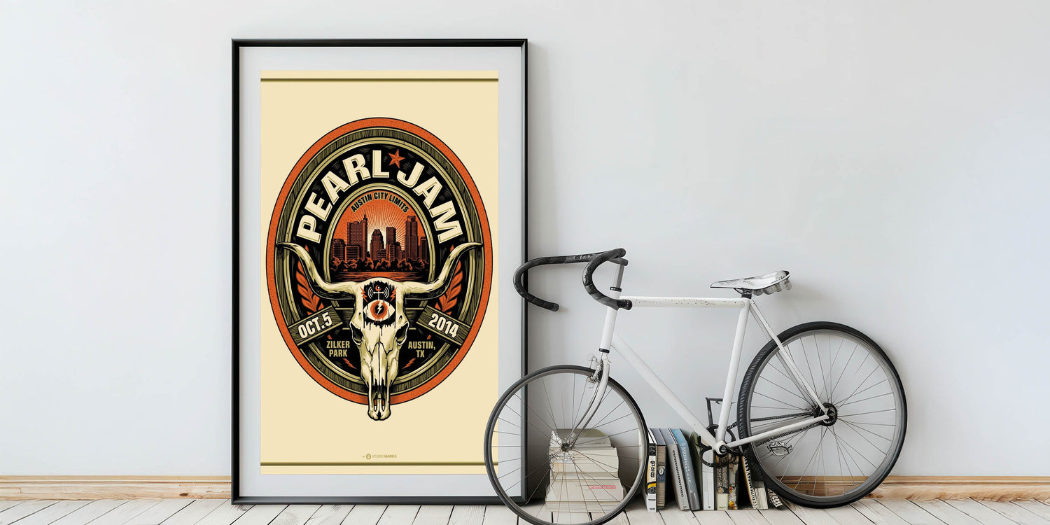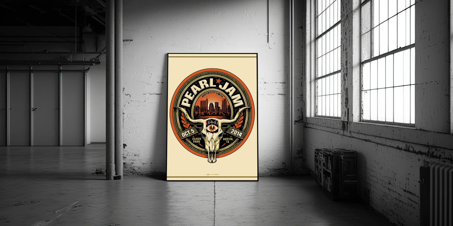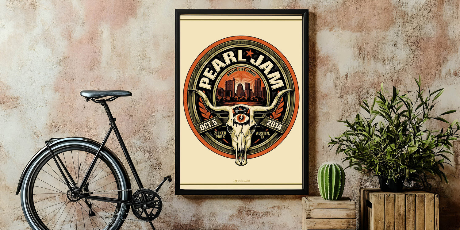Celebrate the power and energy of Pearl Jam with this striking concert poster from their 2014 performance at Austin City Limits. Featuring a bold graphic of a steer skull, city skyline, and electrifying elements, this design is a perfect reflection of the raw energy of Pearl Jam’s live performance. The warm oranges and deep browns in the poster create a vintage yet modern aesthetic, while the skull and Austin city backdrop make this poster a must-have for music lovers and collectors.
