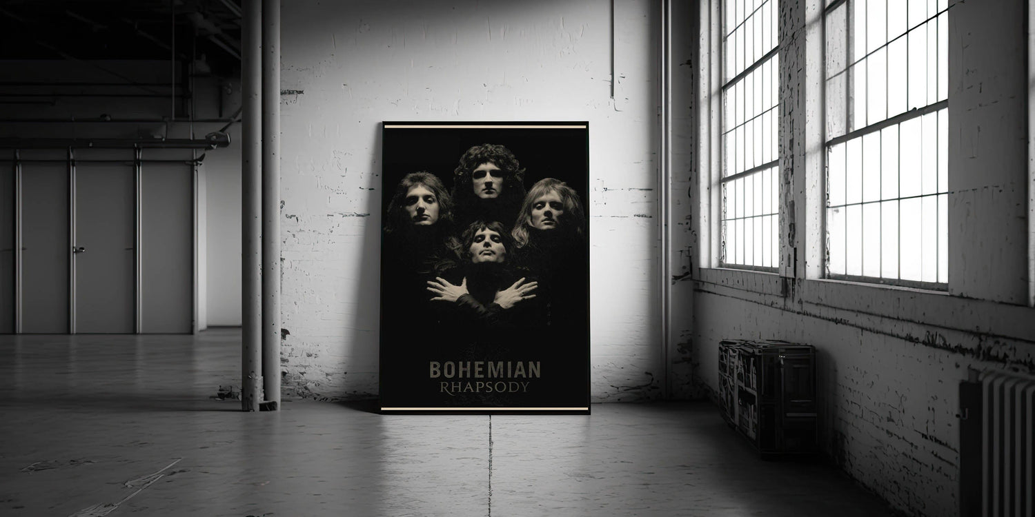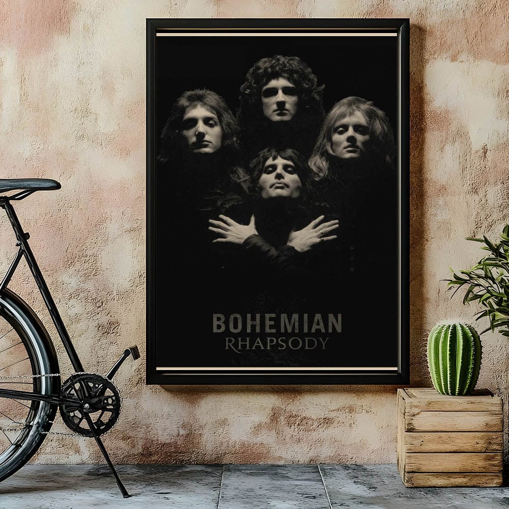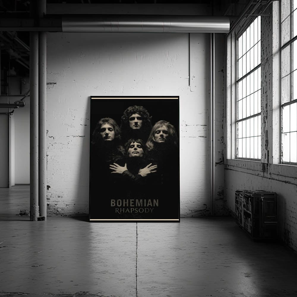 - Classic Queen "Bohemian Rhapsody" poster featuring the band in a striking black-and-white portrait.