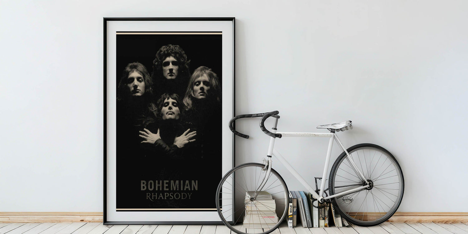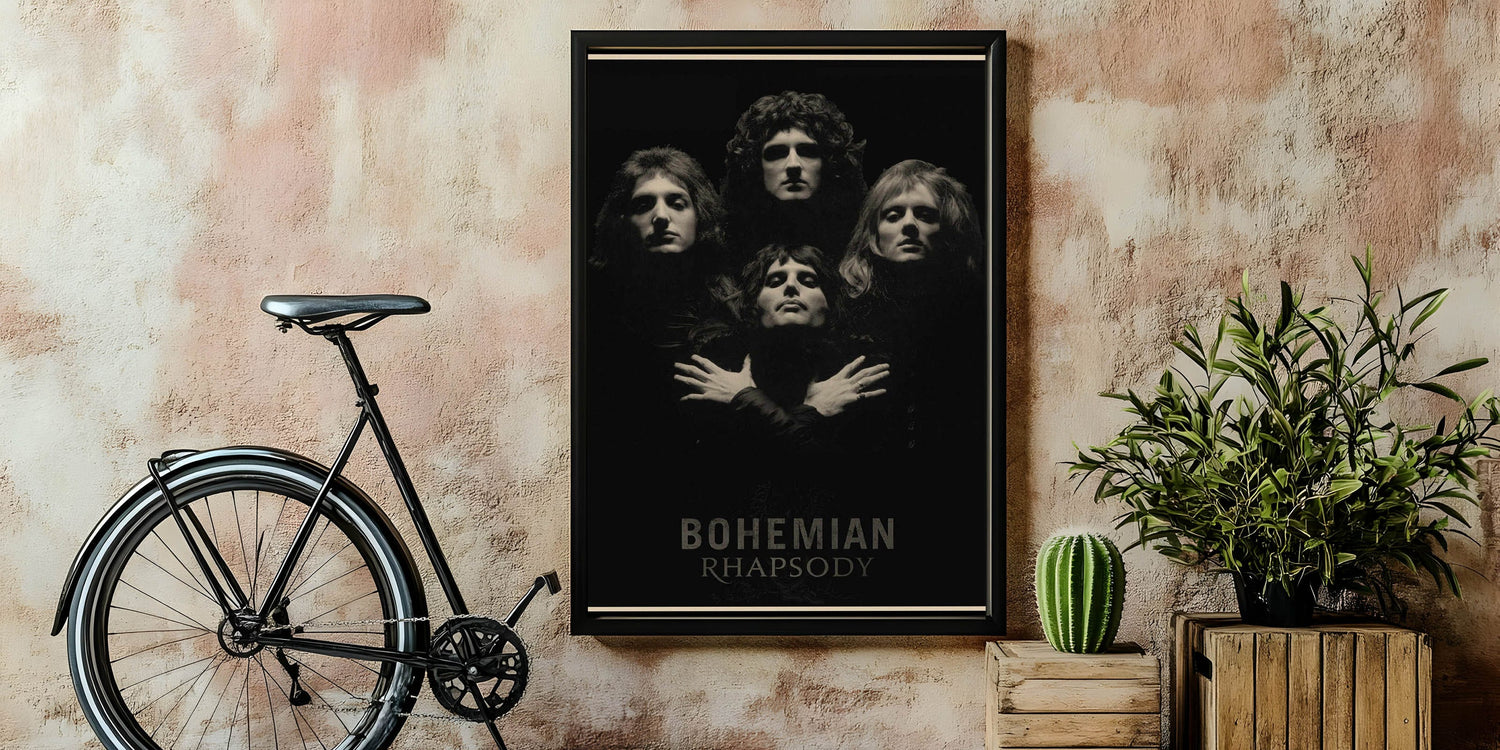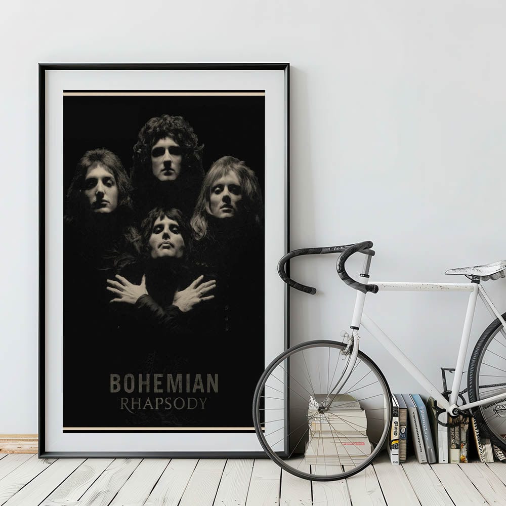 - Classic Queen "Bohemian Rhapsody" poster featuring the band in a striking black-and-white portrait.