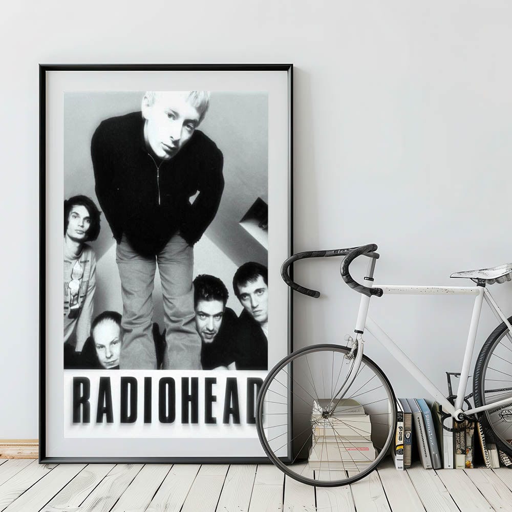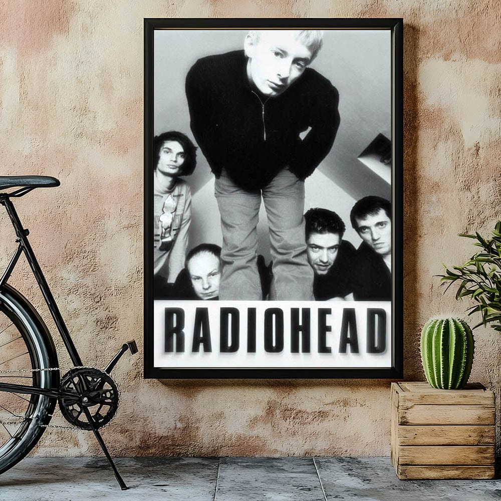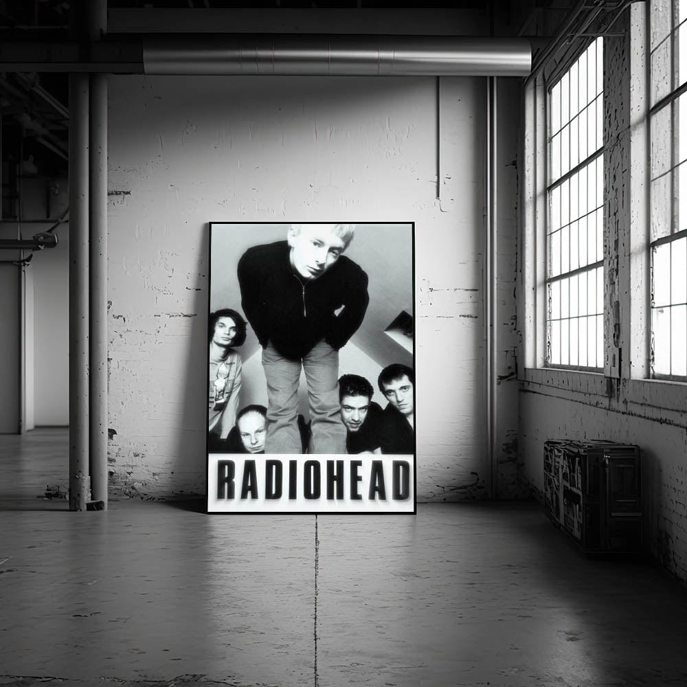 This iconic Radiohead retro poster features a black-and-white photo of the band in their early years. The image captures the raw energy and youthful intensity of the band members, making it an essential piece for any Radiohead fan or collector of vintage music art. The minimalist black-and-white color scheme highlights the band's striking presence, adding a timeless element to any room.
