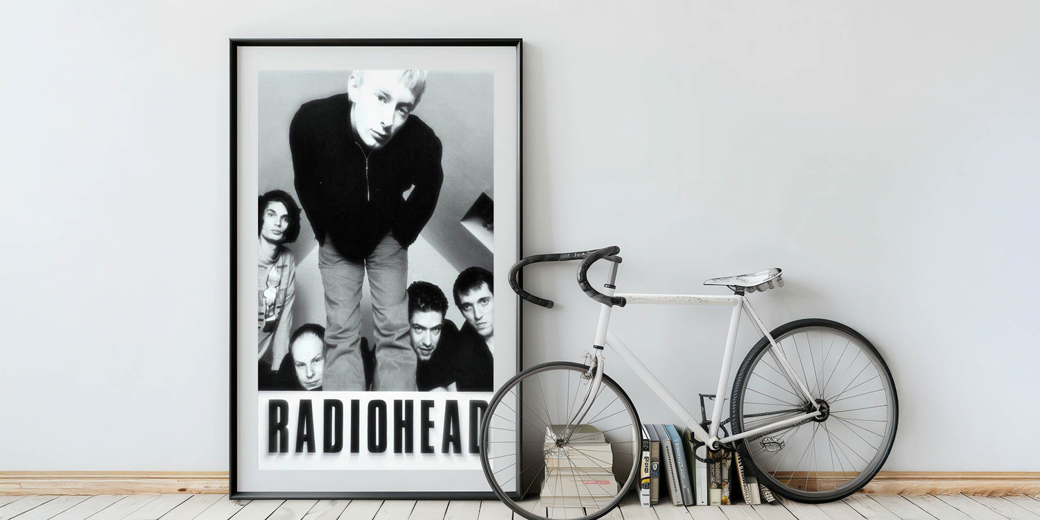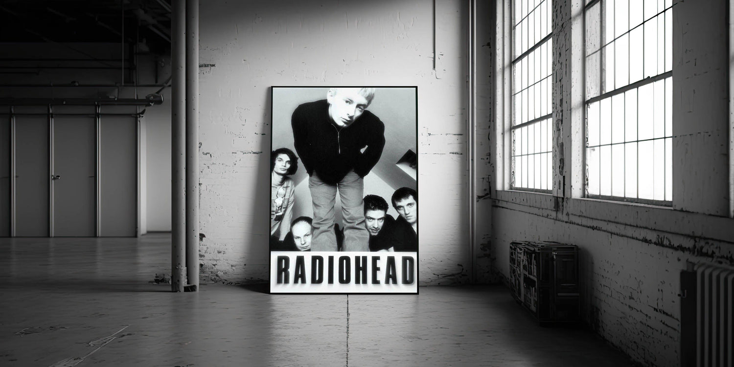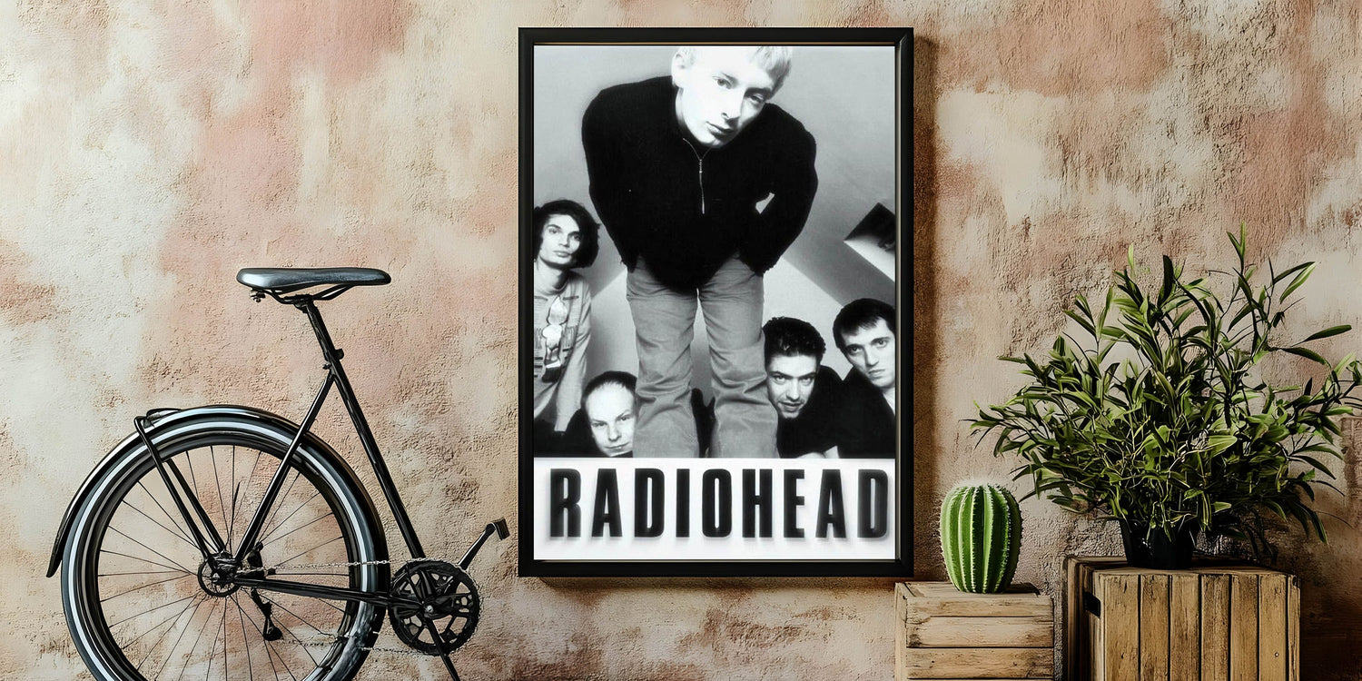 This iconic Radiohead retro poster features a black-and-white photo of the band in their early years. The image captures the raw energy and youthful intensity of the band members, making it an essential piece for any Radiohead fan or collector of vintage music art. The minimalist black-and-white color scheme highlights the band's striking presence, adding a timeless element to any room.