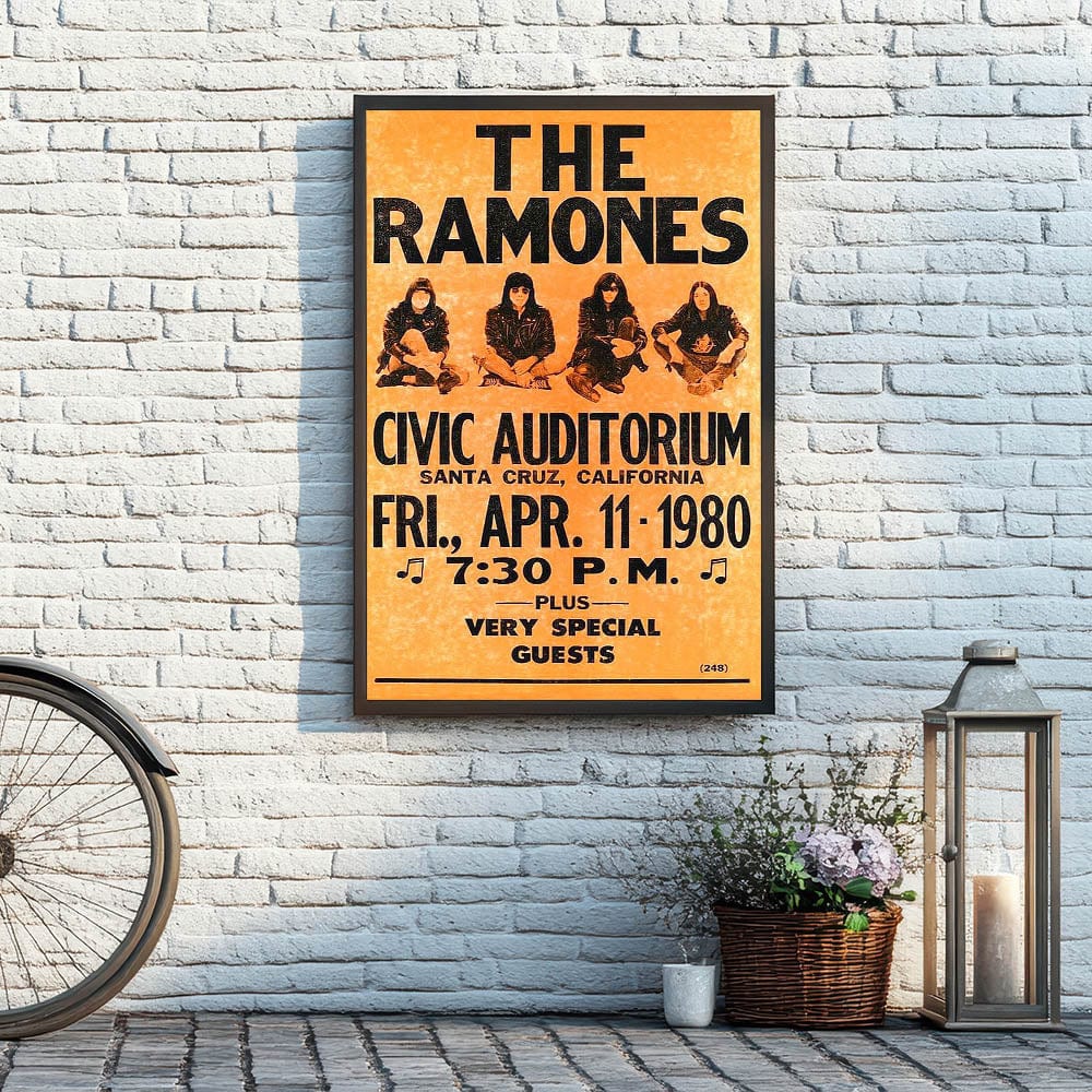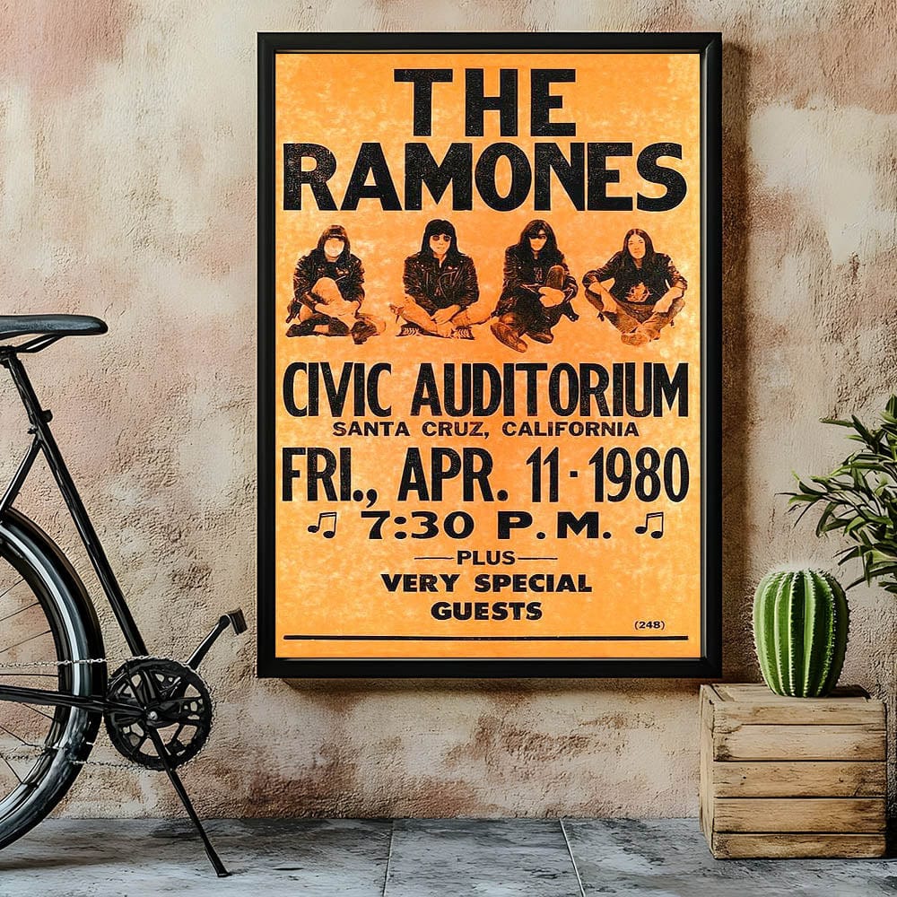 This vintage Ramones retro poster showcases the iconic band in their signature punk rock style, promoting their 1980 concert at the Civic Auditorium in Santa Cruz, California. The bold orange and black design features a classic photo of the band members, sitting in their signature leather jackets. The bold typography and simple layout make this poster a timeless piece for any fan of punk rock history and the legendary Ramones.