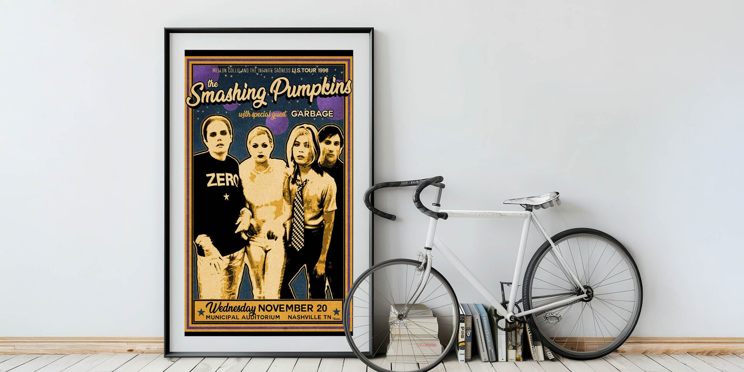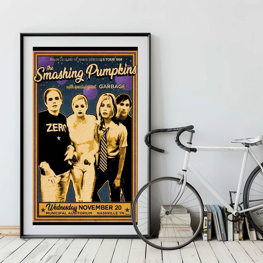 Relive the iconic moments of the Smashing Pumpkins 1996 U.S. tour with this Retro Smashing Pumpkins Poster. Featuring the classic vintage decor of the band’s Mellon Collie and the Infinite Sadness era, this nostalgic art print brings the distinct style of 90s rock to your space. With its bold typography and striking design, this retro wall art is perfect for fans of classic retro style and timeless retro designs.