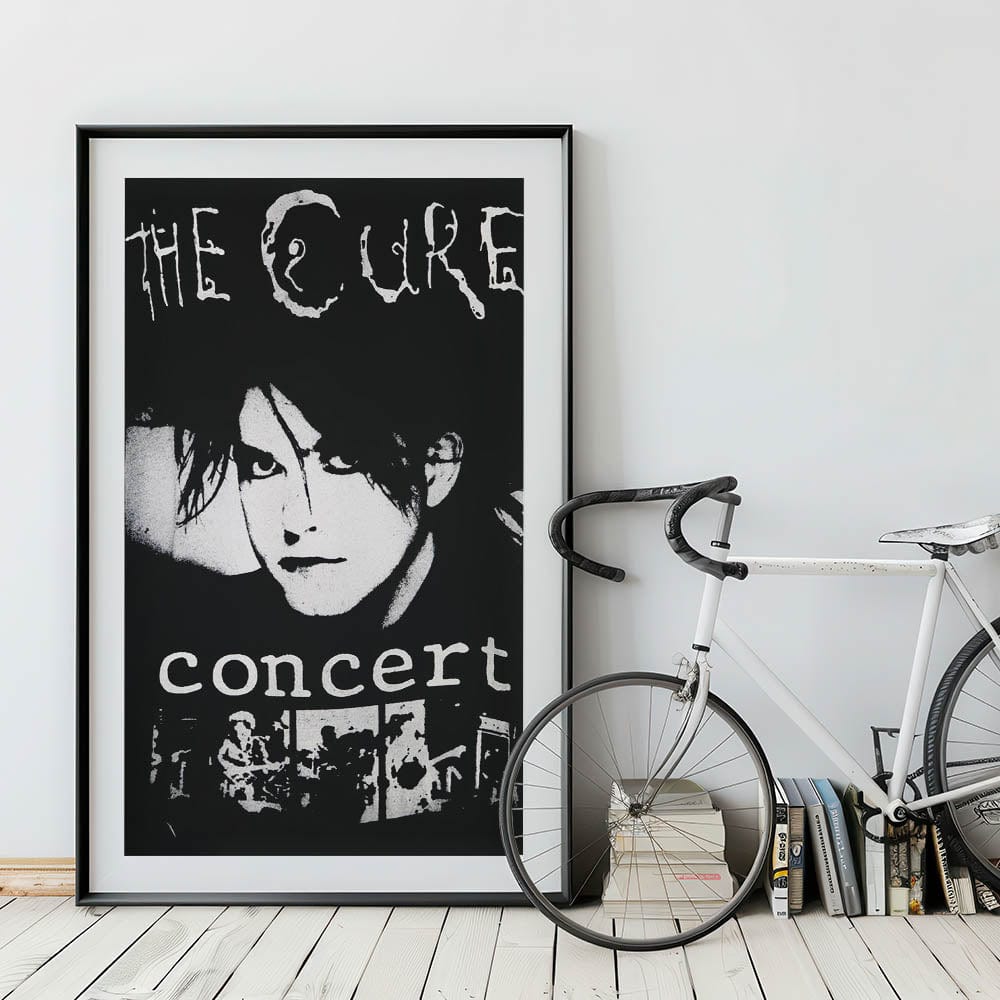 Capture the essence of The Cure with this striking retro concert poster. Featuring an iconic black-and-white image of Robert Smith, this design embodies the band's gothic rock aesthetic. With bold, expressive typography and a captivating portrait, this print is perfect for fans of vintage music art and those who love the dark, brooding energy of The Cure's iconic style.