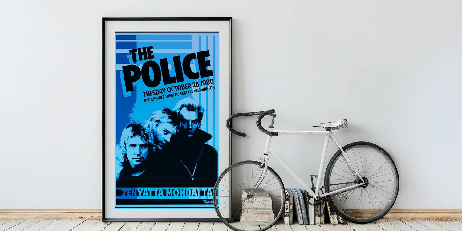 Relive the iconic 1980 performance of The Police with this retro concert poster, featuring the bold and striking Zenyatta Mondatta album artwork. This vintage-inspired print captures the energy and style of one of the most influential bands of the 1980s, with its electric blue color palette and stylized portrait of the band members. Ideal for fans of nostalgic art prints and retro aesthetic, this print brings a timeless touch to your space.