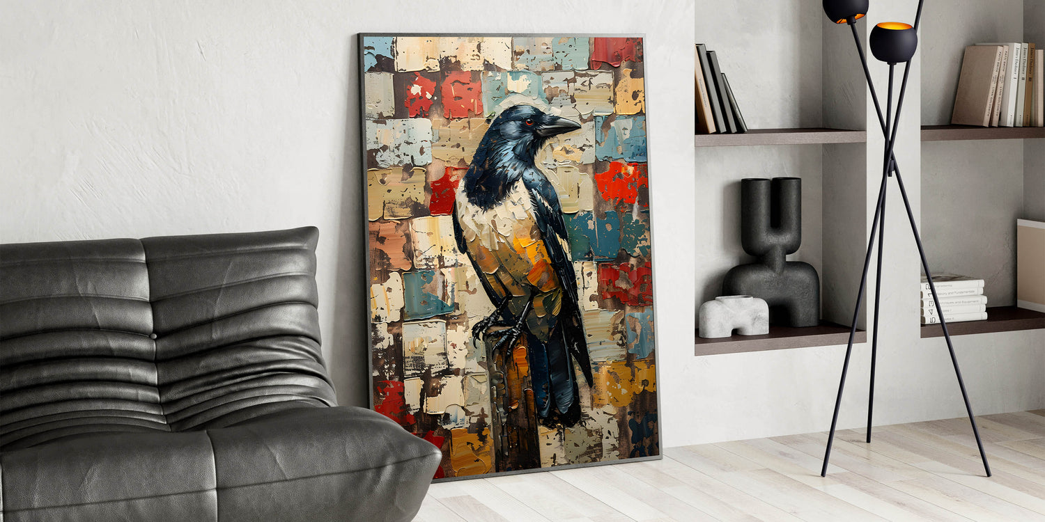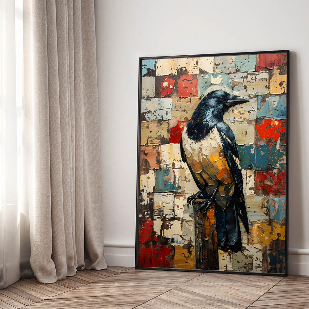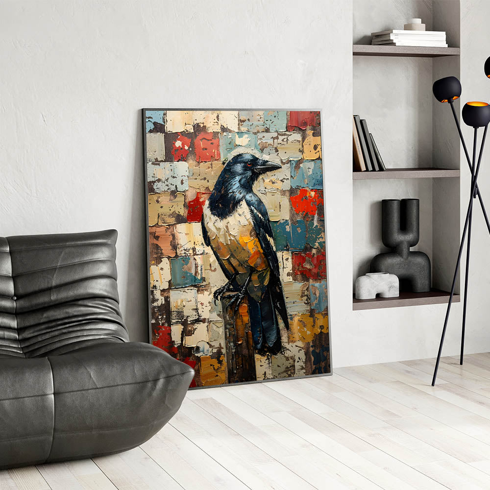 This rustic crow painting is ideal for those who want to bring a bold and artistic statement to their living space. Its dynamic composition and rich textures make it an inspiring addition to any room.