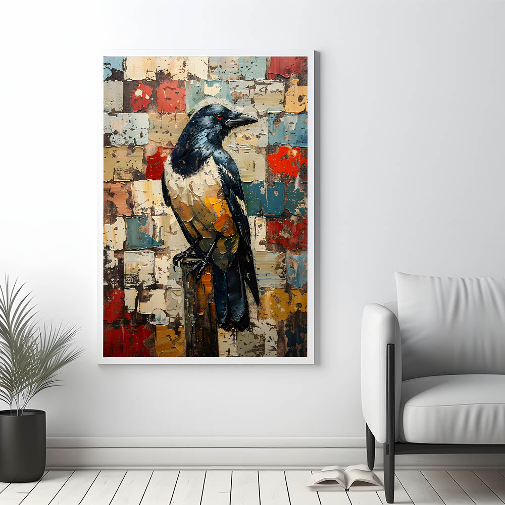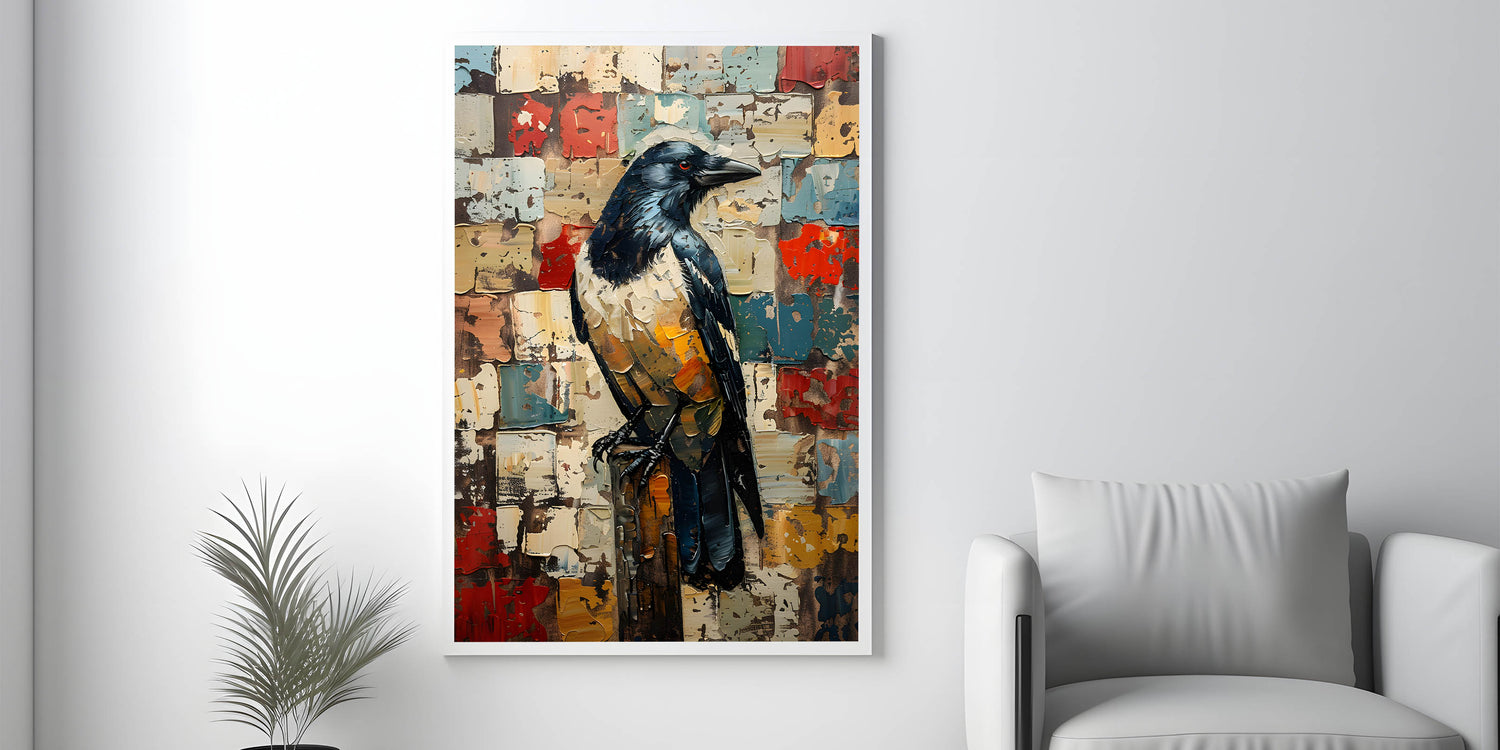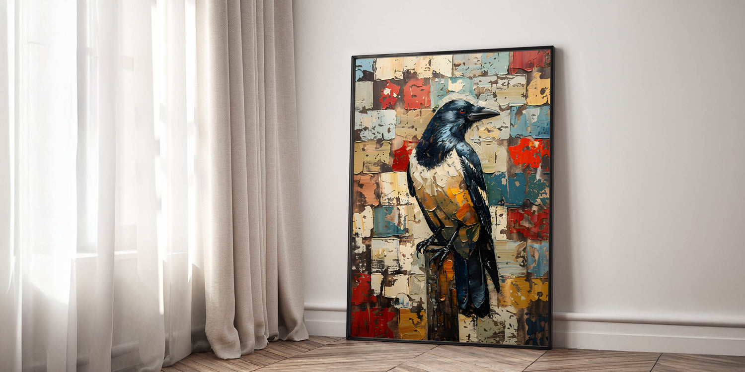 This rustic crow painting is ideal for those who want to bring a bold and artistic statement to their living space. Its dynamic composition and rich textures make it an inspiring addition to any room.