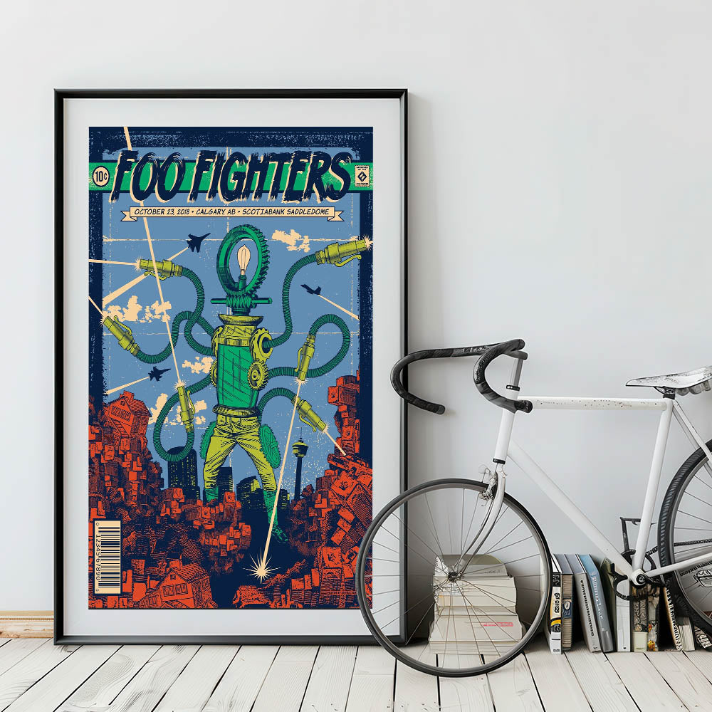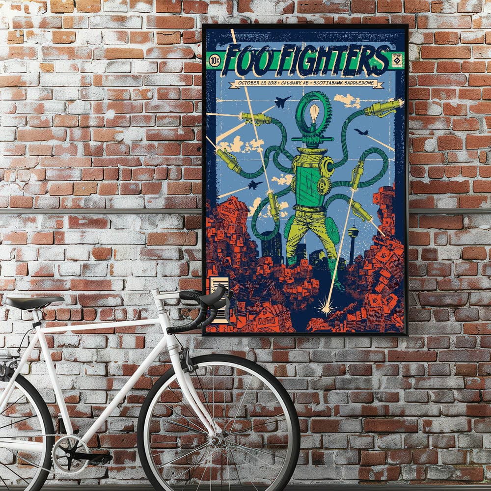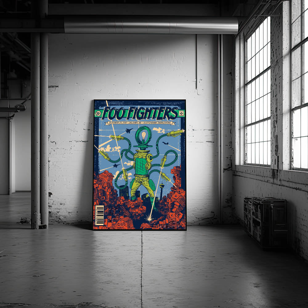 Step into a world of retro aesthetic and classic sci-fi with this Foo Fighters Retro Wall Art. Inspired by vintage comic book covers, this vintage print features a futuristic robot towering over a crumbling city, blending mid-century modern art with timeless retro design. The bold colors, intricate details, and dynamic composition make this retro poster art an essential piece for rock fans and collectors of nostalgic art prints.