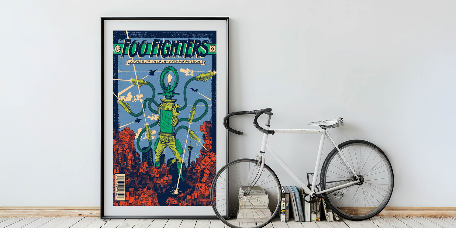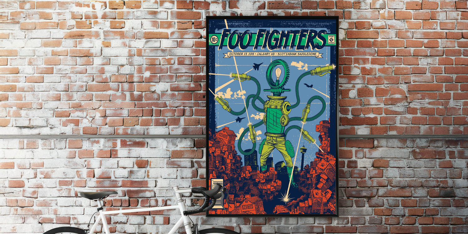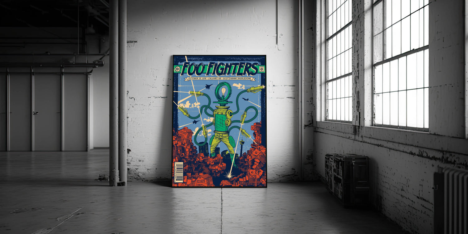Step into a world of retro aesthetic and classic sci-fi with this Foo Fighters Retro Wall Art. Inspired by vintage comic book covers, this vintage print features a futuristic robot towering over a crumbling city, blending mid-century modern art with timeless retro design. The bold colors, intricate details, and dynamic composition make this retro poster art an essential piece for rock fans and collectors of nostalgic art prints.