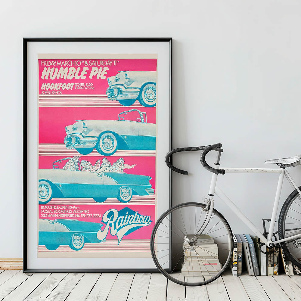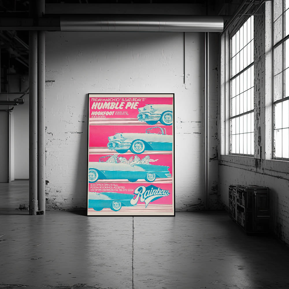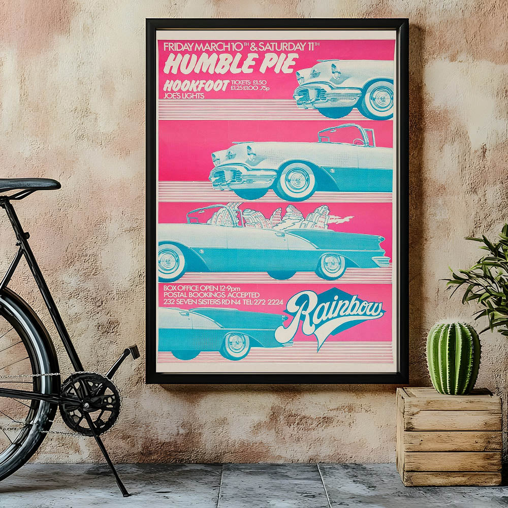 Bring the energy of classic rock into your space with this Humble Pie Retro Wall Art, a Vintage Print from their Rainbow Theatre concert. With its bold pink and blue design, classic cars, and sleek typography, this Retro Poster Art captures the essence of 1970s rock and roll. A must-have for collectors, music lovers, and fans of Classic Retro Style.