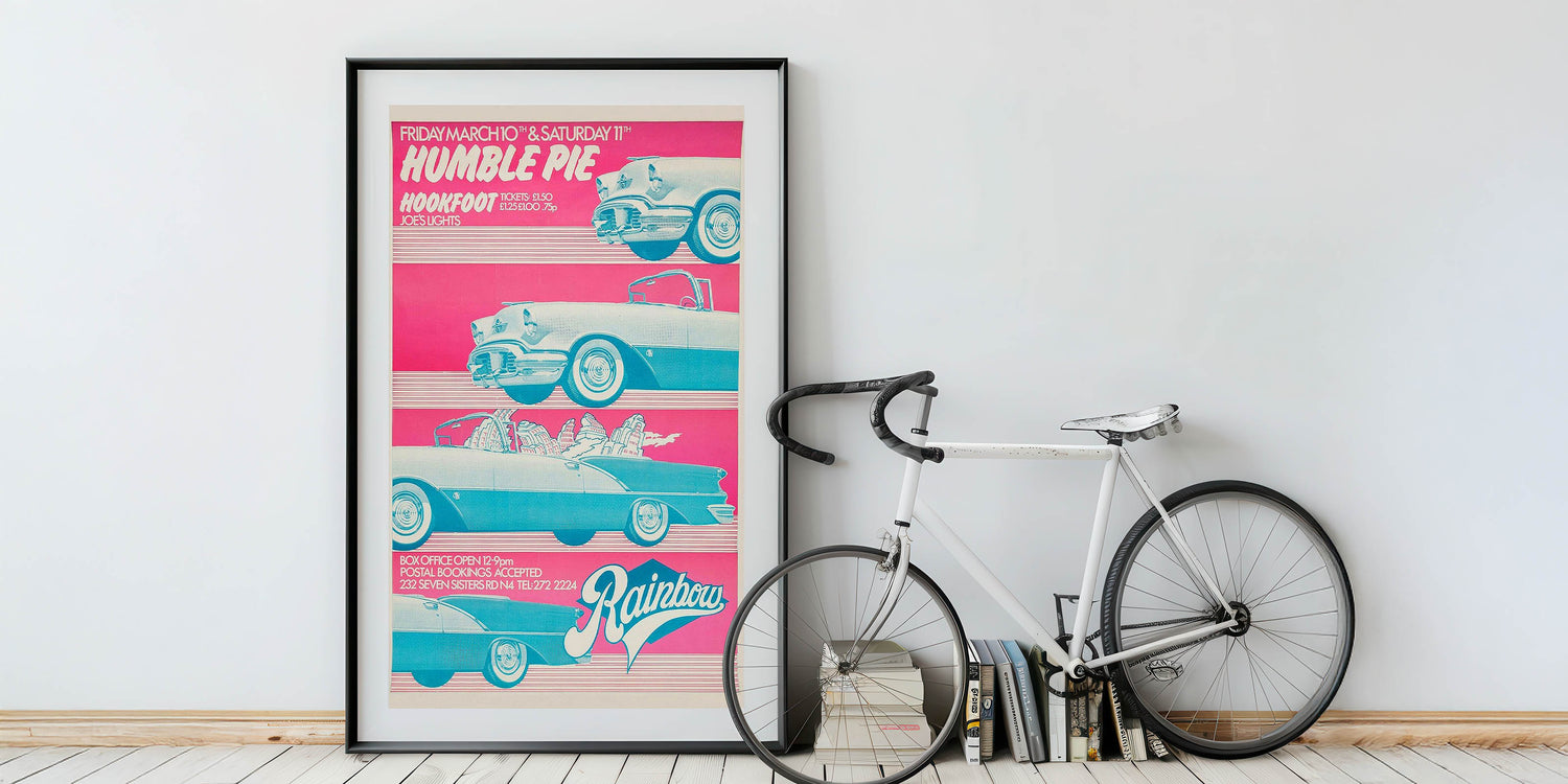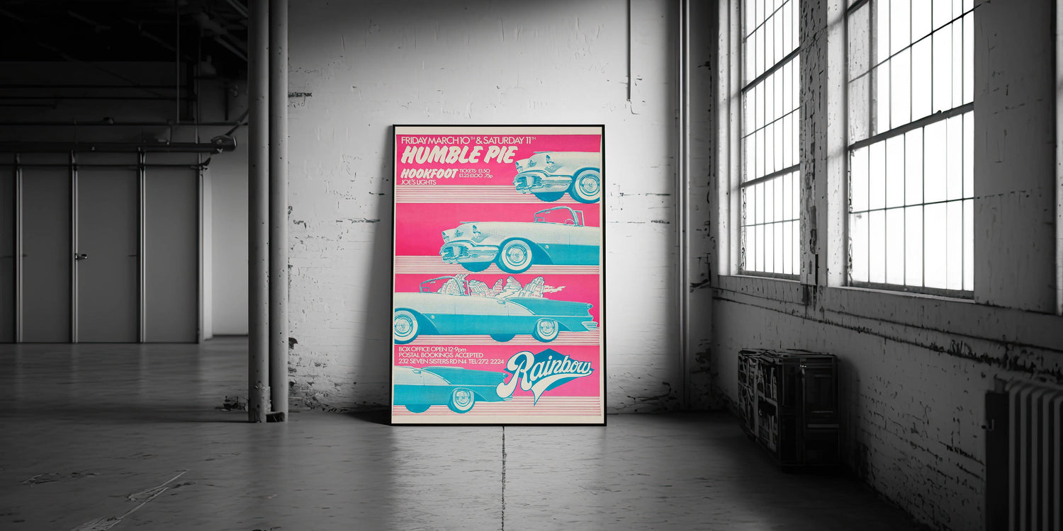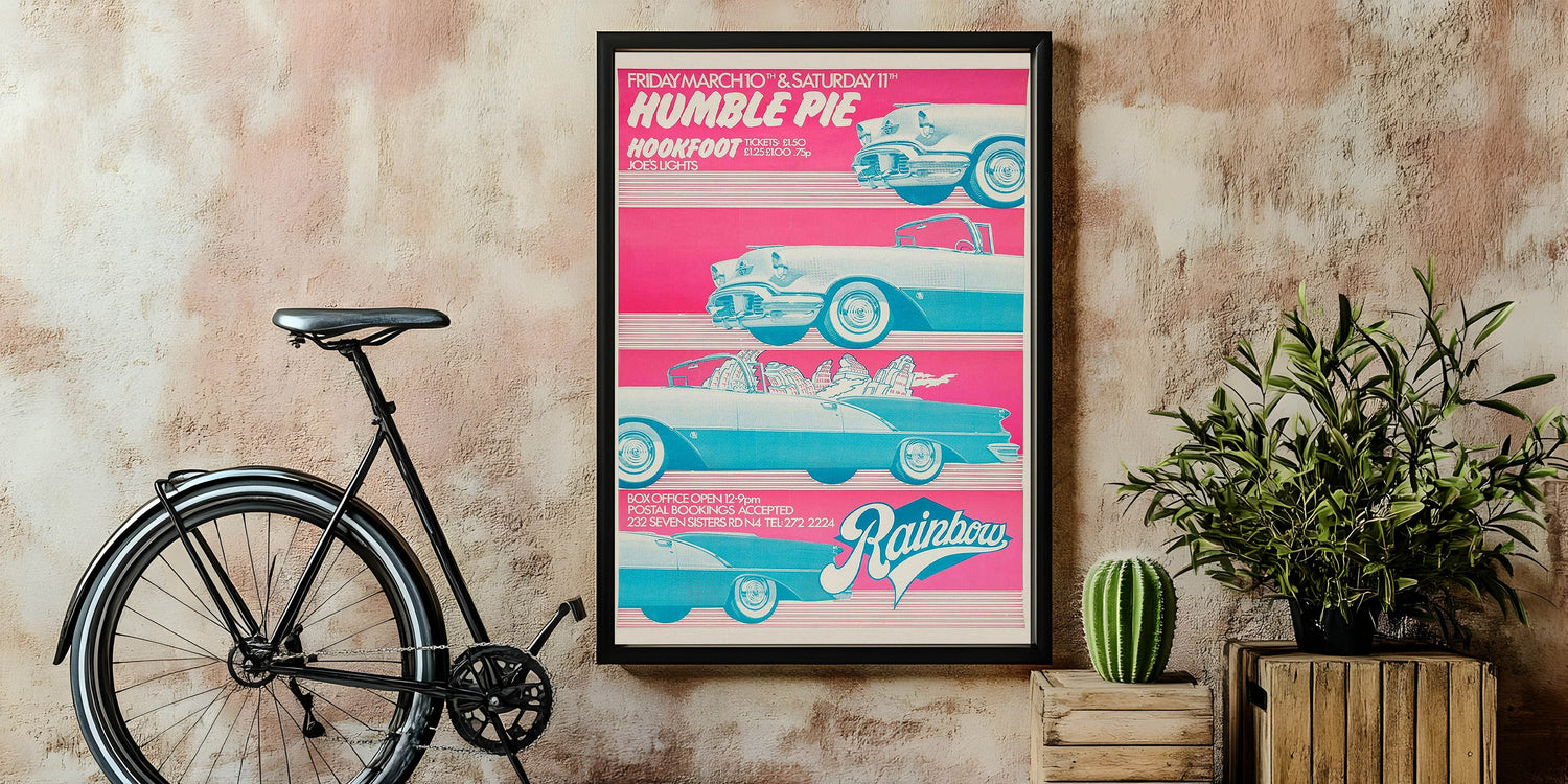 Bring the energy of classic rock into your space with this Humble Pie Retro Wall Art, a Vintage Print from their Rainbow Theatre concert. With its bold pink and blue design, classic cars, and sleek typography, this Retro Poster Art captures the essence of 1970s rock and roll. A must-have for collectors, music lovers, and fans of Classic Retro Style.