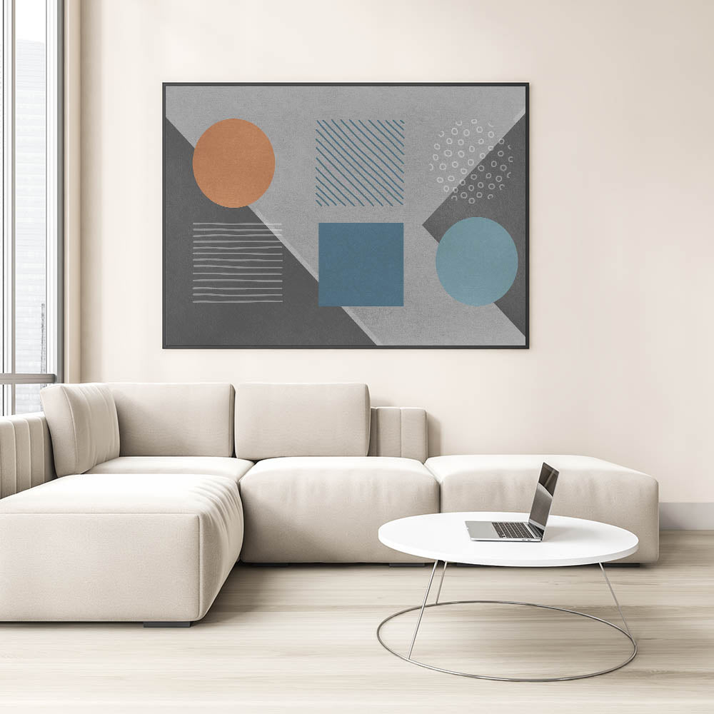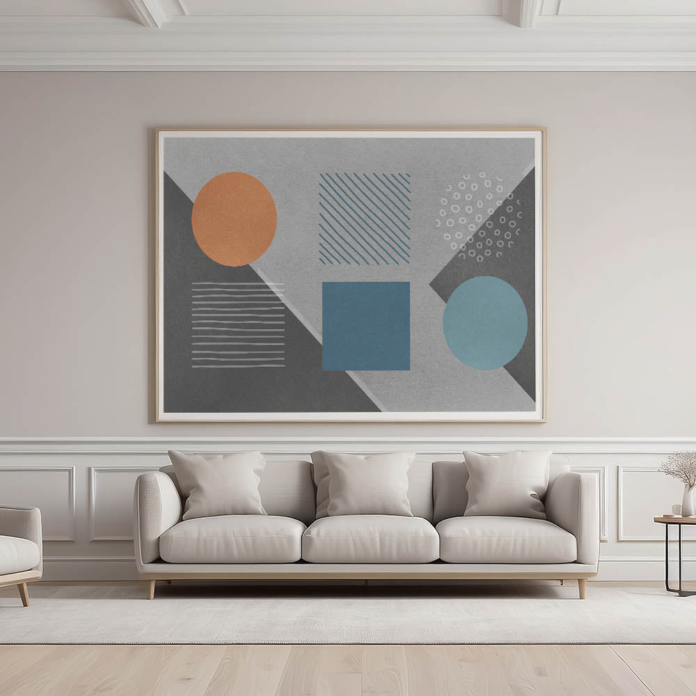 Introduce a touch of modern sophistication to your decor with this geometric abstract art featuring bold shapes on canvas. The artwork combines striking geometric patterns with vibrant colors, including orange, blue, and grey, creating a dynamic and contemporary piece. Perfect for enhancing the aesthetic appeal of your living room, bedroom, or office, this art piece adds a unique and stylish element to any space.