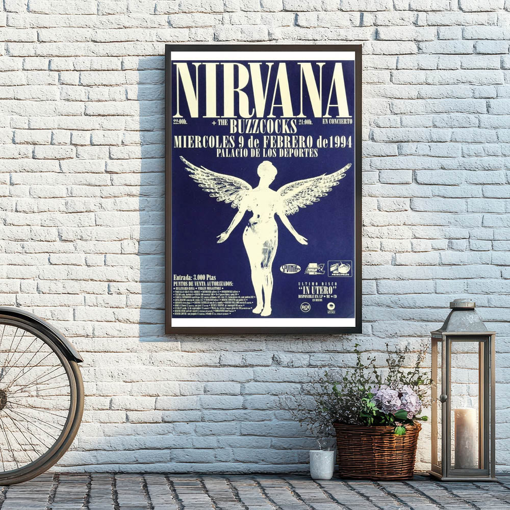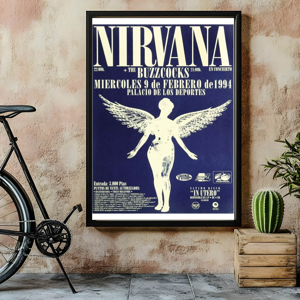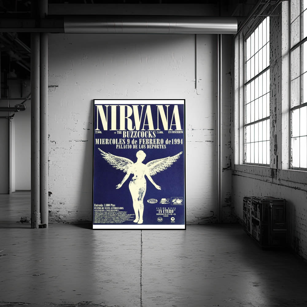 Relive the energy of Nirvana’s 1994 live performance with this iconic concert poster, featuring the band’s angelic graphic and bold text on a striking blue backdrop. This vintage poster captures the essence of 90s rock culture, making it a must-have for fans of the band and collectors of classic retro art. The detailed design and powerful contrast between the blue and white tones make this a standout piece for any music lover's collection.