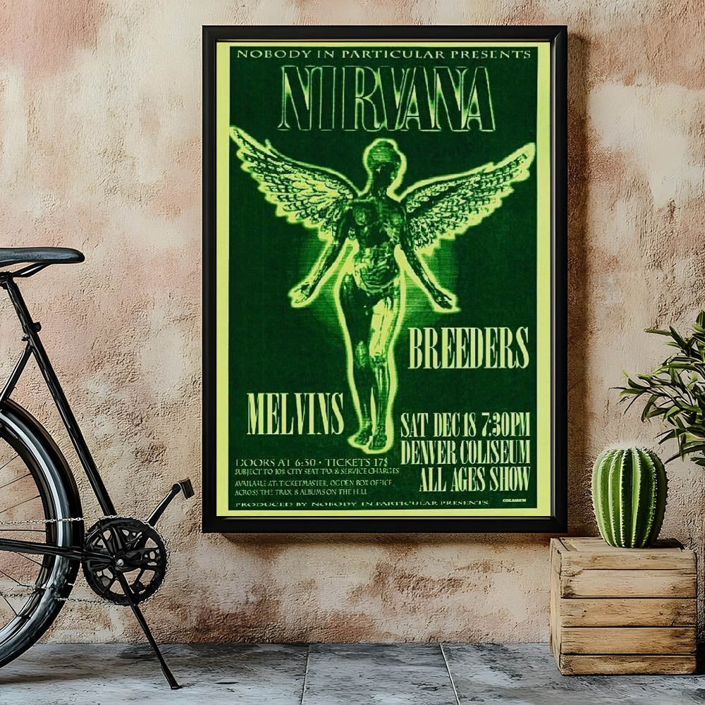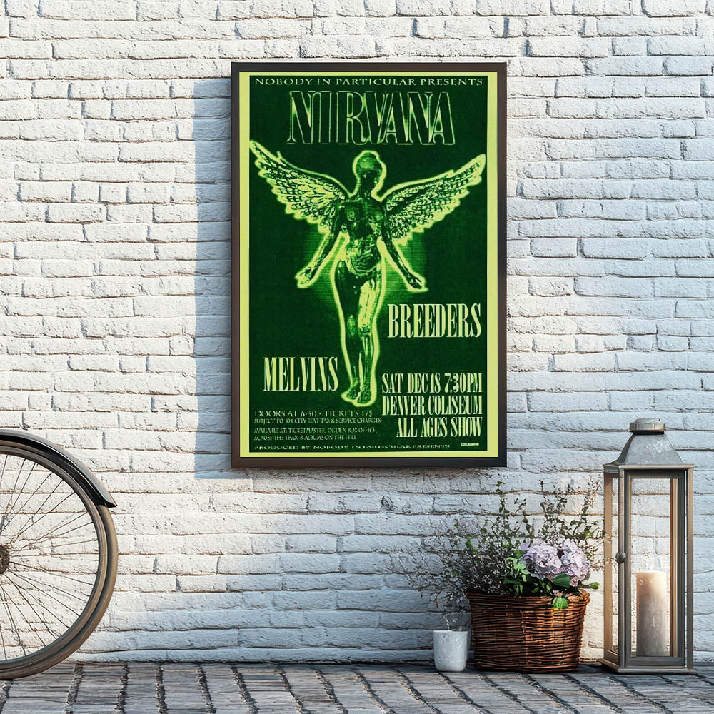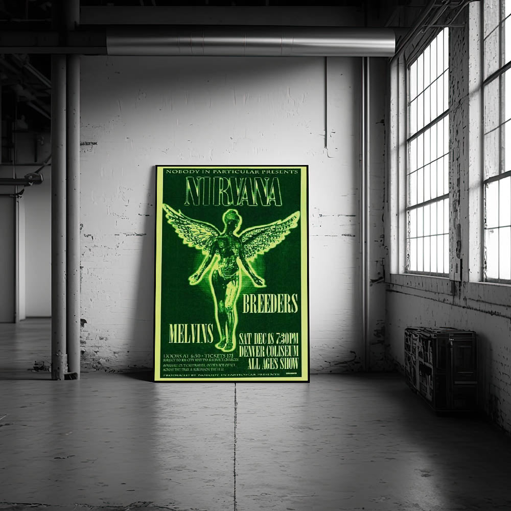 Bring a burst of retro style into your space with this vintage Nirvana concert poster, showcasing a bold green aesthetic that captures the energy and spirit of the 90s rock scene. This iconic design from a historic show features the band alongside striking angelic imagery, offering an edgy addition to your retro wall art collection. Perfect for music enthusiasts, collectors, and fans of nostalgic art prints, this piece will make a statement in any room.