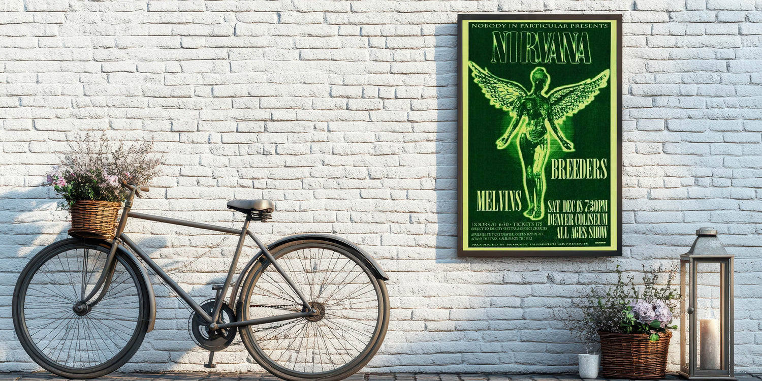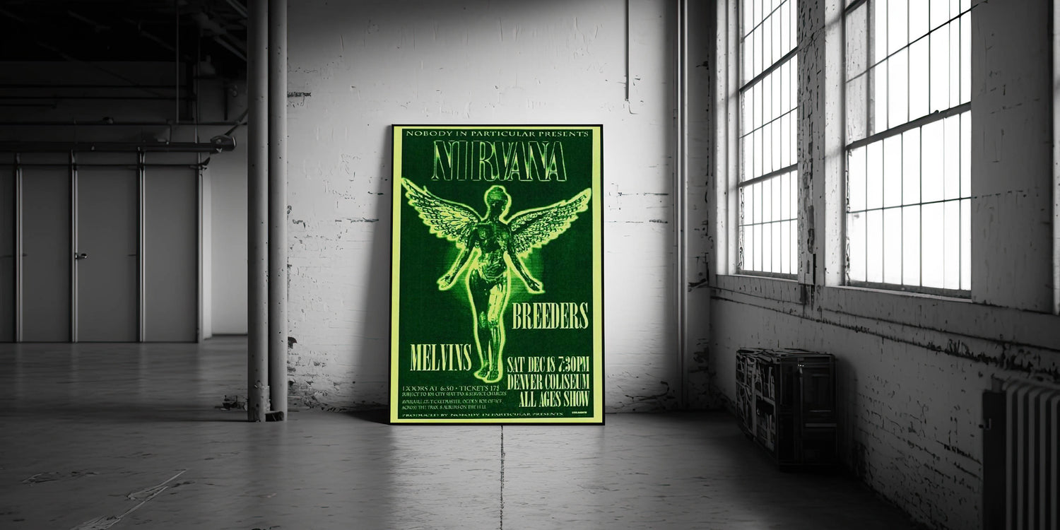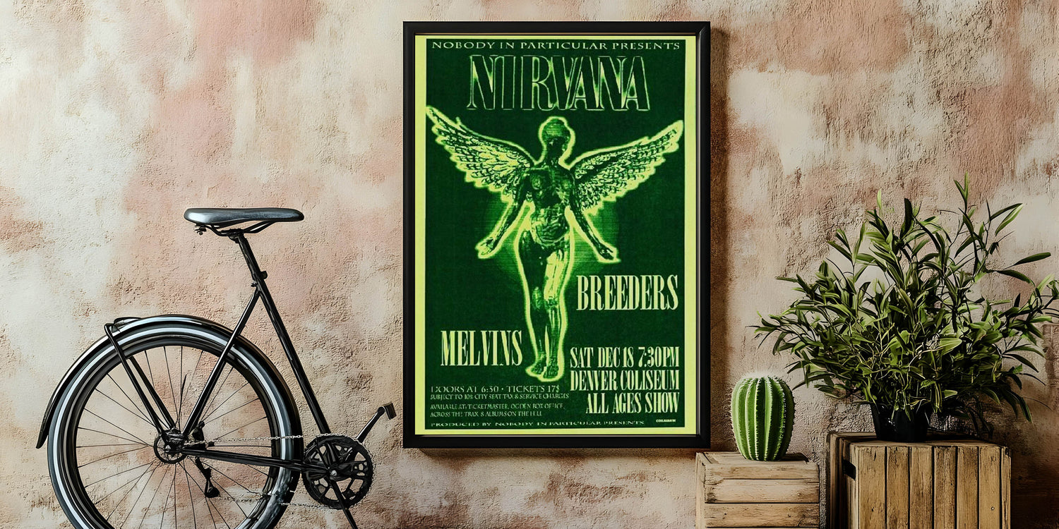 Bring a burst of retro style into your space with this vintage Nirvana concert poster, showcasing a bold green aesthetic that captures the energy and spirit of the 90s rock scene. This iconic design from a historic show features the band alongside striking angelic imagery, offering an edgy addition to your retro wall art collection. Perfect for music enthusiasts, collectors, and fans of nostalgic art prints, this piece will make a statement in any room.