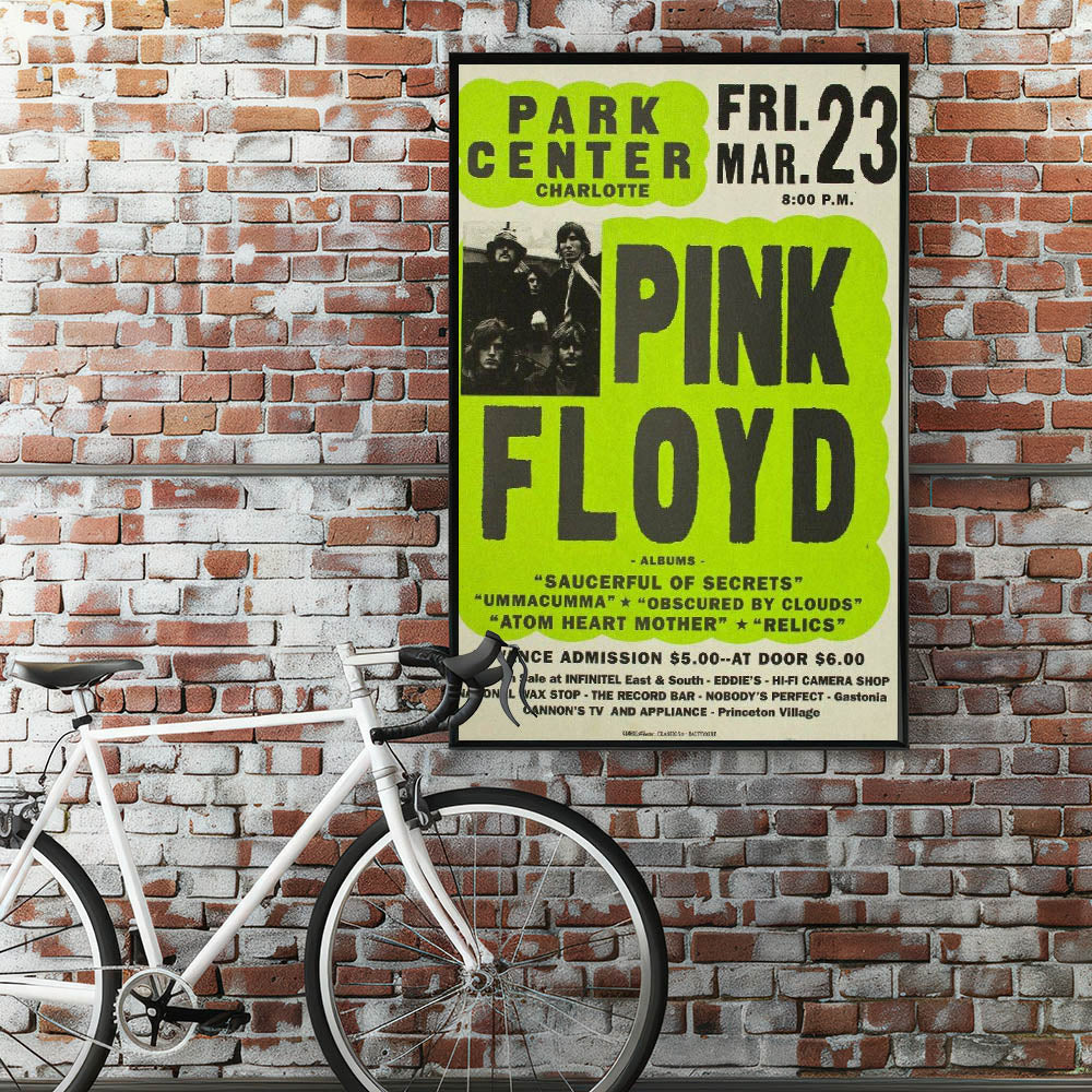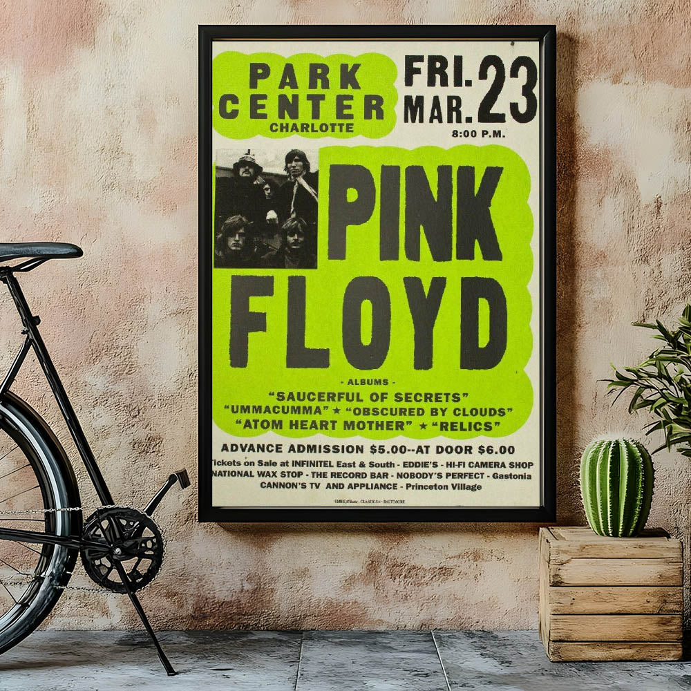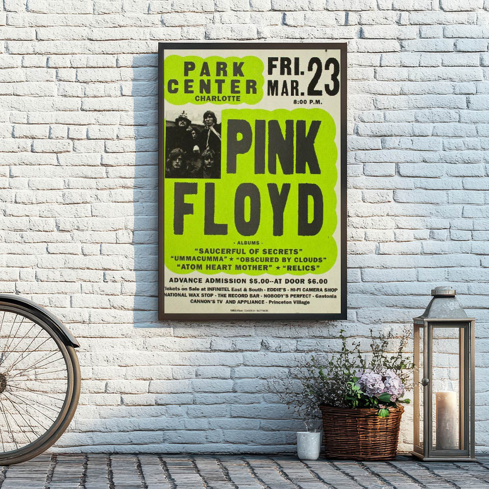 Bring the nostalgia of Pink Floyd's legendary 1970s era into your home with this vibrant retro concert poster. Featuring the band's performance at the Park Center in Charlotte on March 23, this vintage print captures the bold, psychedelic style of the era. Perfect for fans of retro poster art and nostalgic art prints, this design adds a touch of classic retro style to any space.