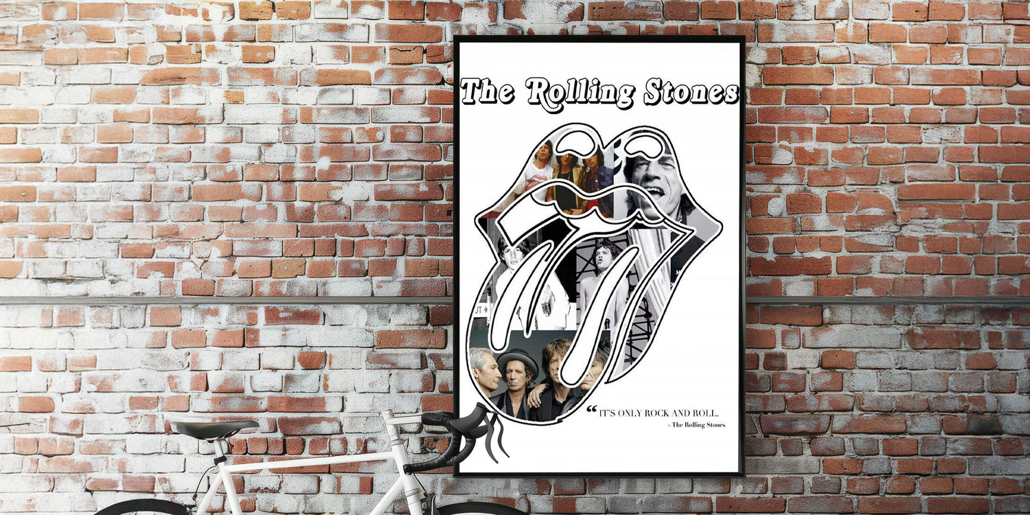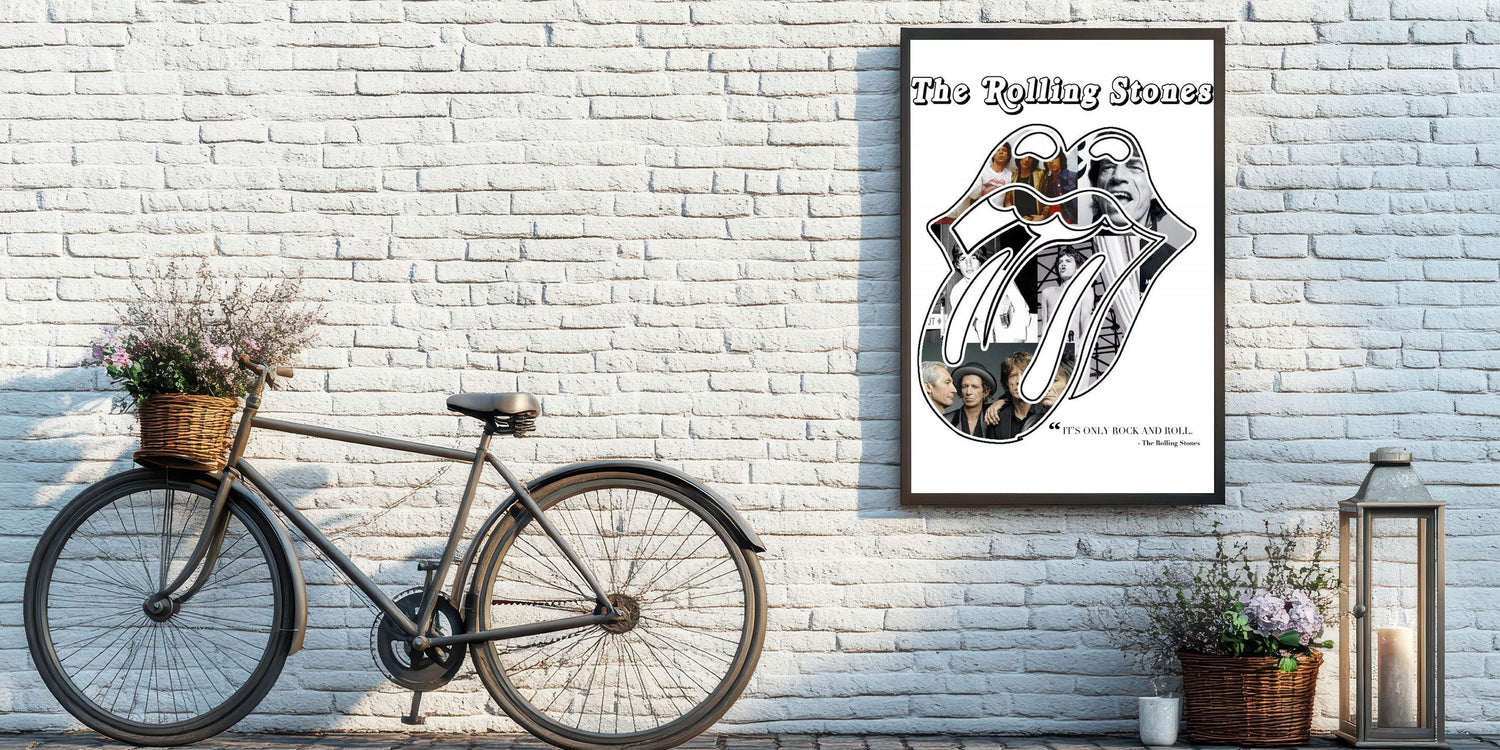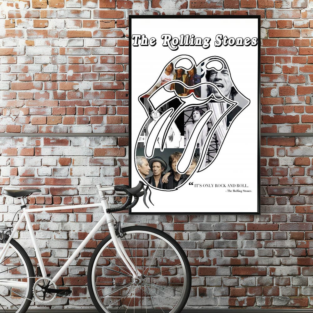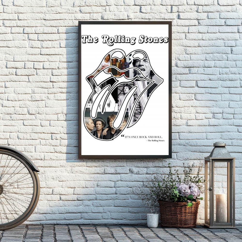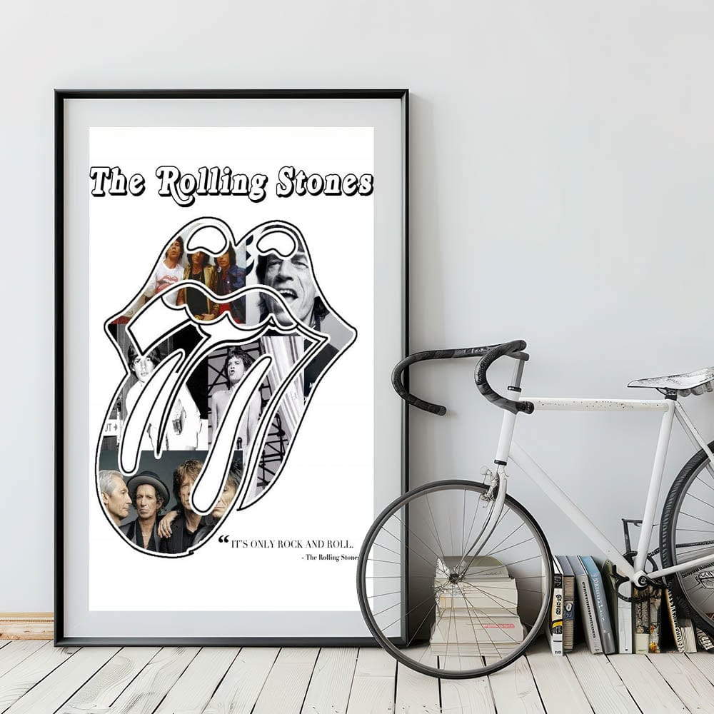 Celebrate the iconic Rolling Stones with this striking retro poster, showcasing the legendary band’s classic "tongue and lips" logo filled with historic black-and-white images of the band. Featuring a mix of photos from their early days and later years, this poster perfectly encapsulates the timeless essence of rock and roll. The design includes the classic quote "It's Only Rock and Roll," making it a must-have for any Rolling Stones fan or music memorabilia collector. The bold graphic design is a blend of nostalgia and modern style, ideal for adding a rock-inspired touch to any space.
