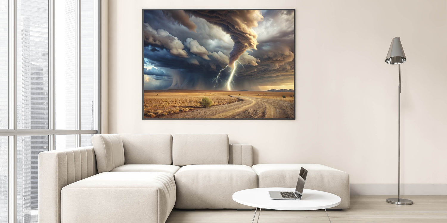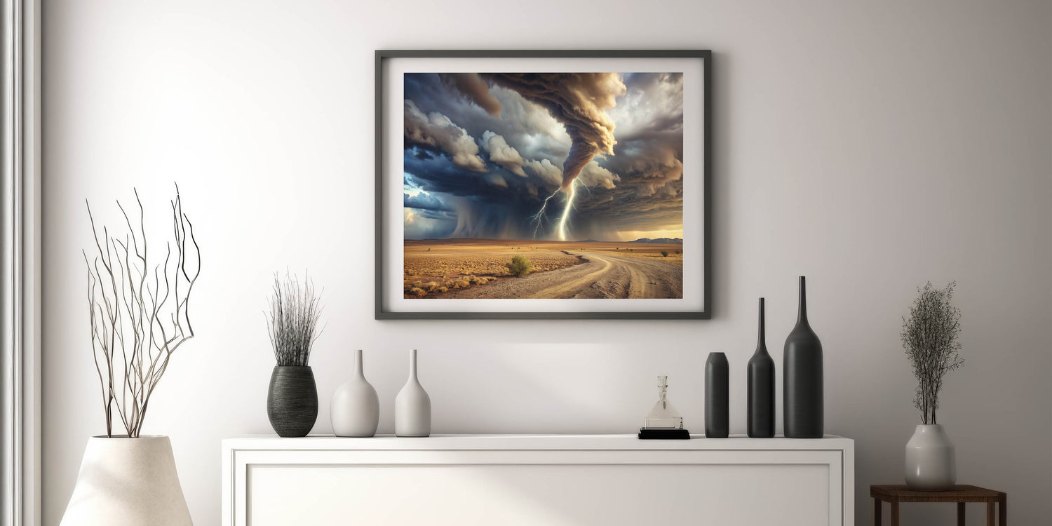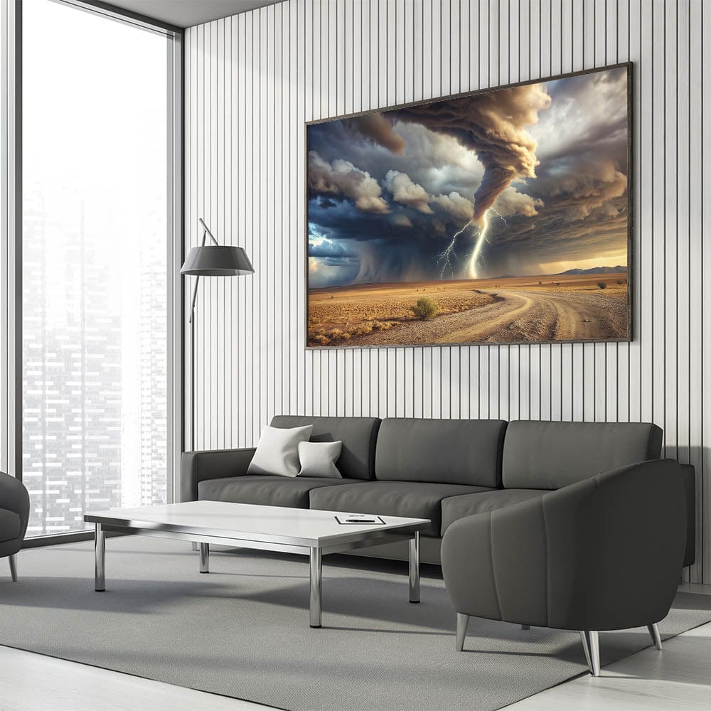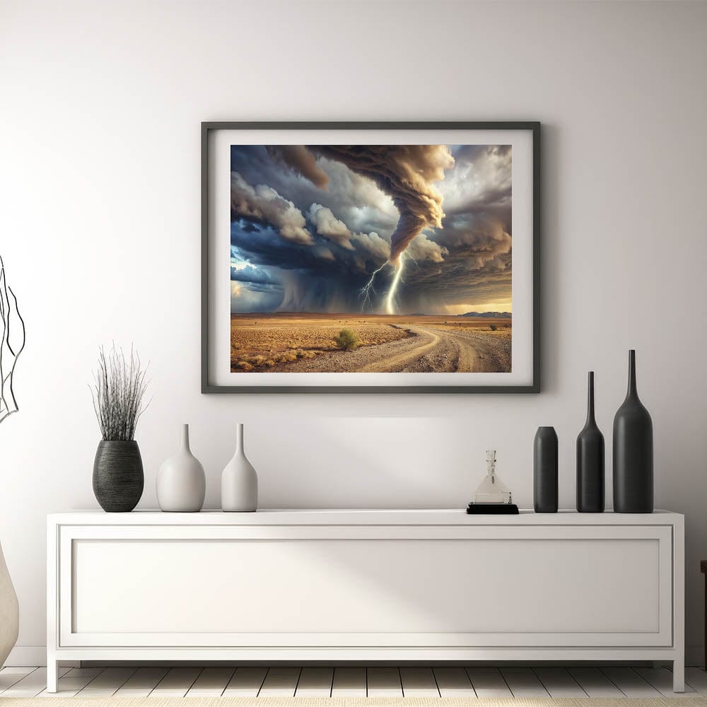 Witness the dramatic power of nature with this stunning wall art featuring a tornado swirling through a vast desert landscape, punctuated by a bright bolt of lightning. The dark, turbulent clouds paired with the golden tones of the desert create a striking contrast that evokes both awe and energy. This Earth-inspired piece captures the intense beauty of one of nature’s most incredible weather phenomena.