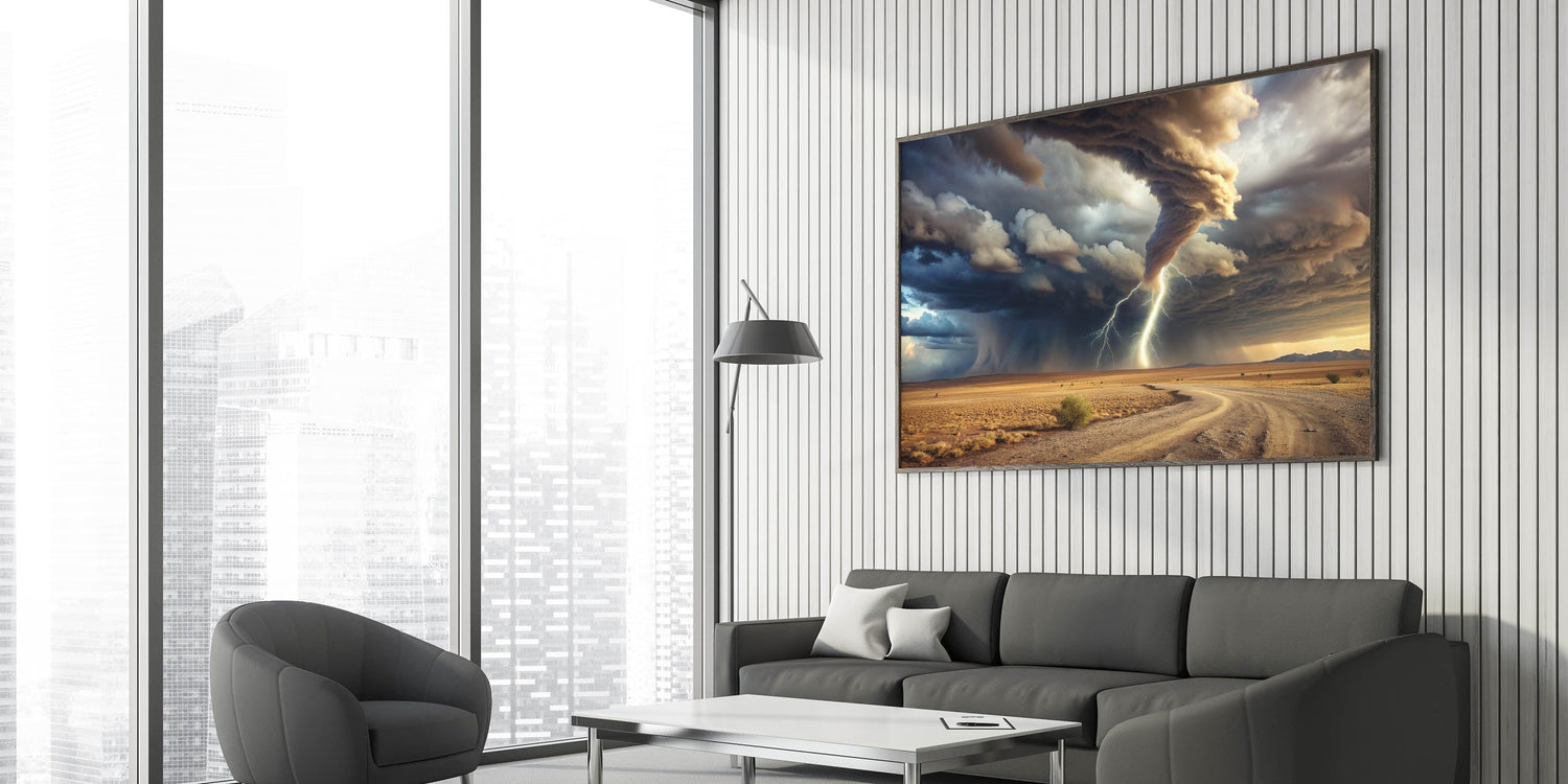 Bring a touch of nature’s power into your home or office with this tornado and lightning wall art. This artwork will make a bold statement in any room, combining the elements of Earth and sky in a captivating composition.