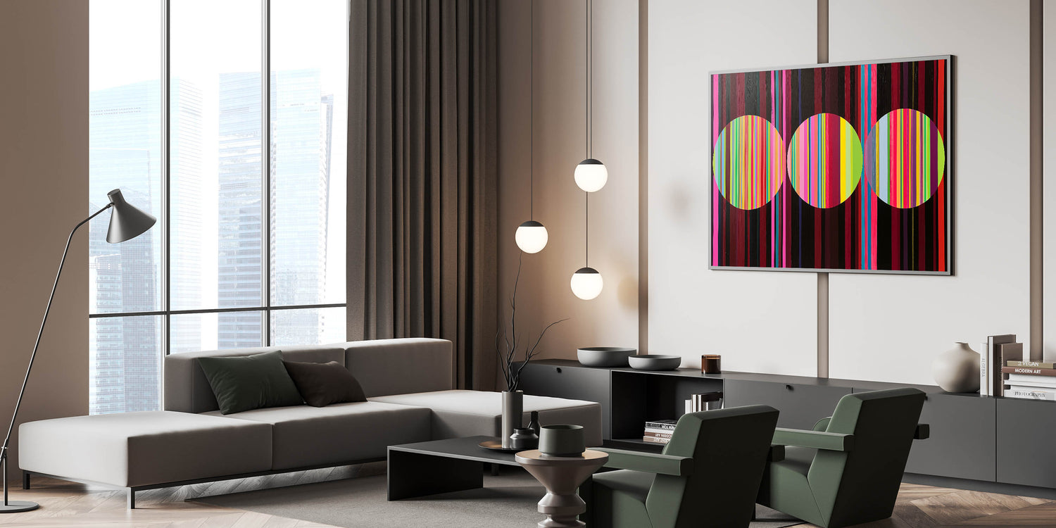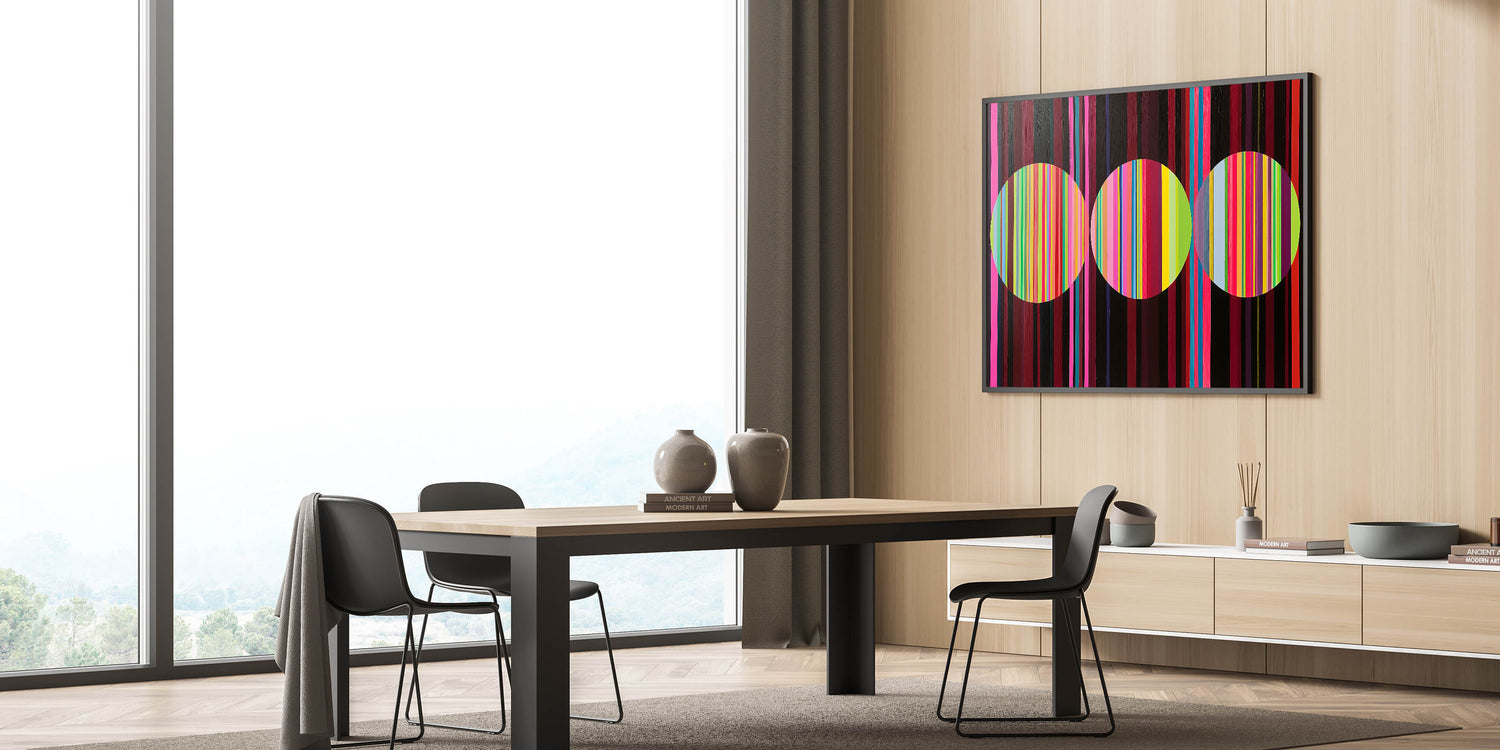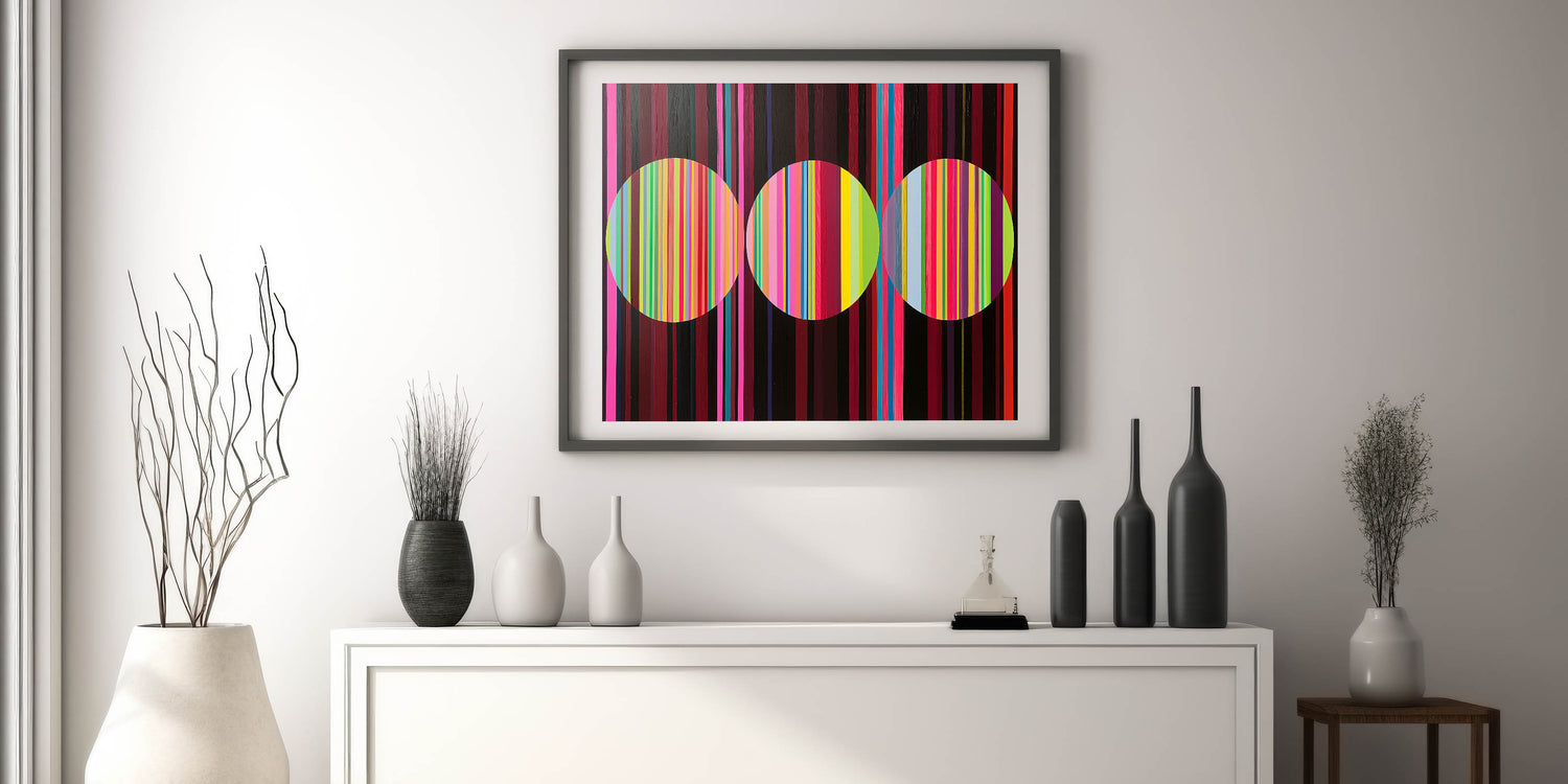 Infuse your space with energy and creativity with this Living Room Wall Art, featuring a bold and colorful geometric composition. This Modern Wall Art showcases an eye-catching design of three circular patterns with vivid vertical stripes in red, pink, yellow, green, and blue, making it a dynamic statement piece for Modern Living Room Décor. The high-contrast background adds depth, creating an engaging and visually exciting focal point for contemporary interiors.
