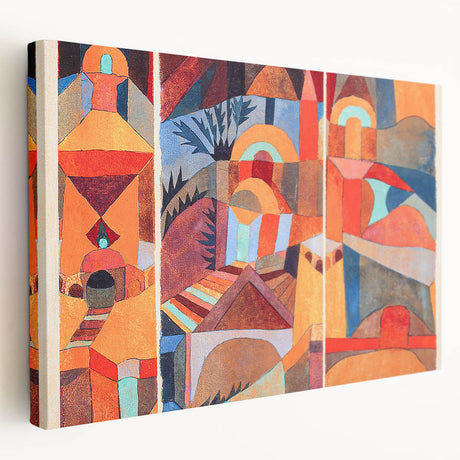 • Abstract figurative stretched canvas art showcasing vibrant colors and dynamic shapes, perfect for modern home decor. Side view highlights the textured edges and craftsmanship.