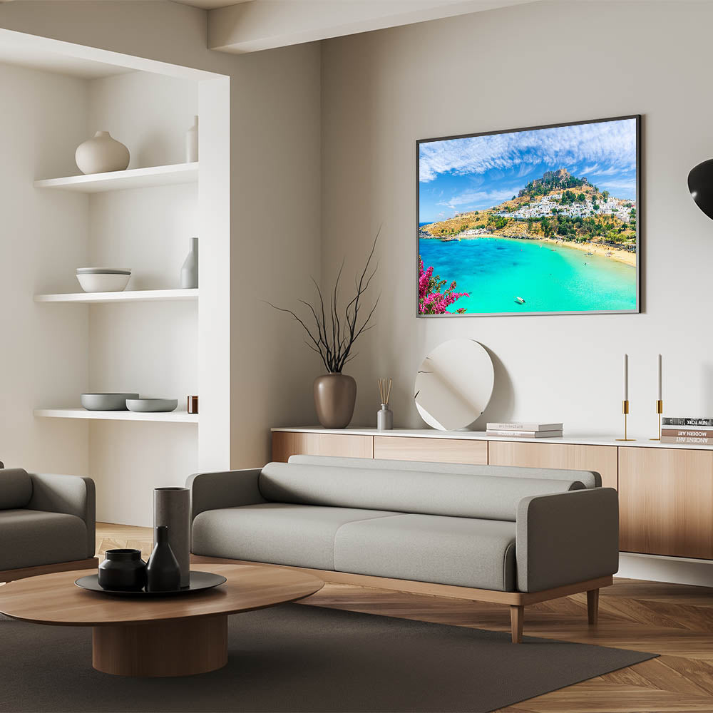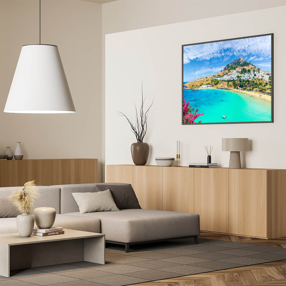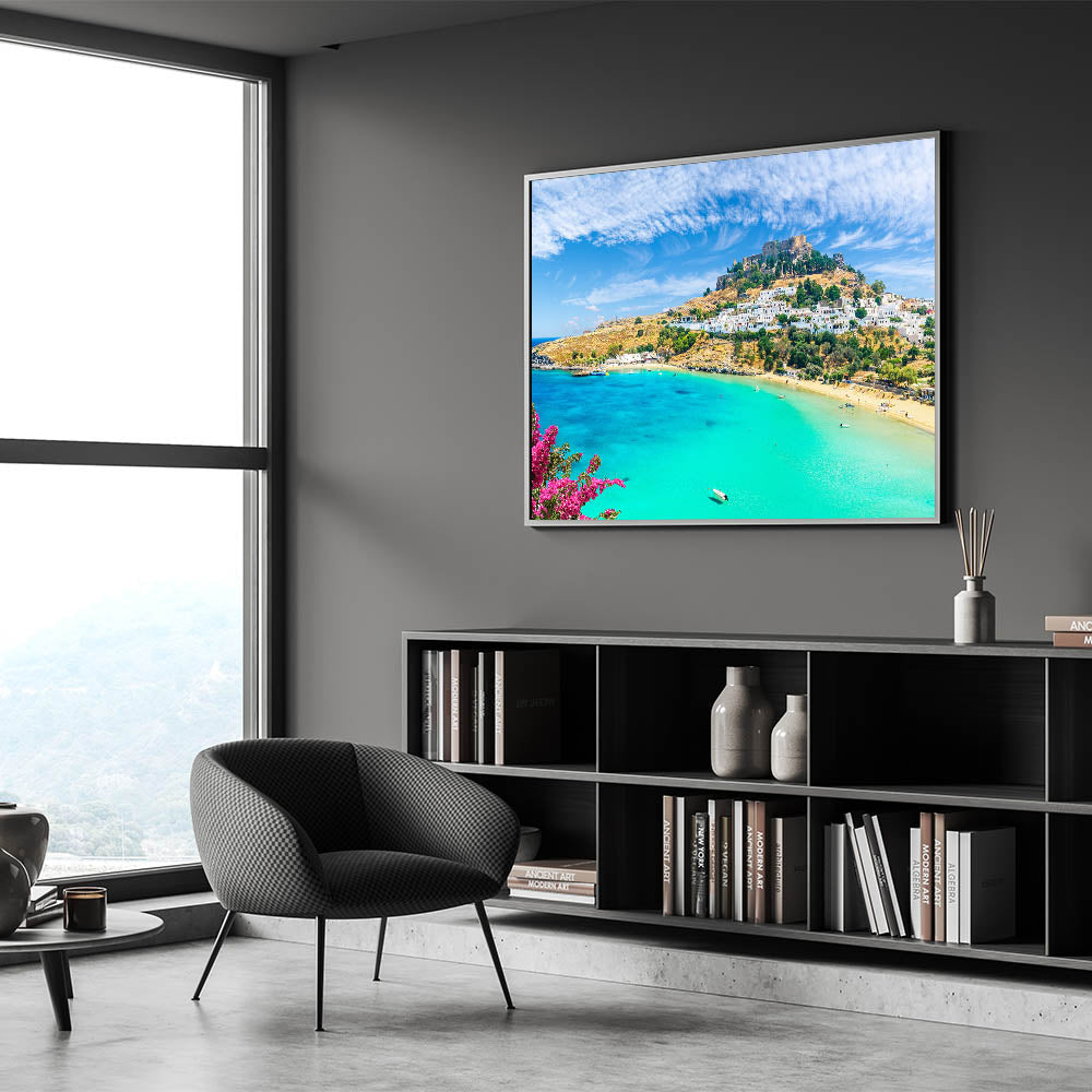 Capture the vibrant beauty of Rhodes Greece with this stunning Rhodes Island Canvas, featuring the picturesque village of Lindos and its crystal-clear beaches. The turquoise waters, bright pink flowers, and historic hillside town make this artwork a perfect piece of Greek Island Wall Decor. Whether you are looking for Mediterranean Wall Art or a timeless reminder of Rhodes Scenic Views, this print brings the charm and beauty of the Greek islands into any space.