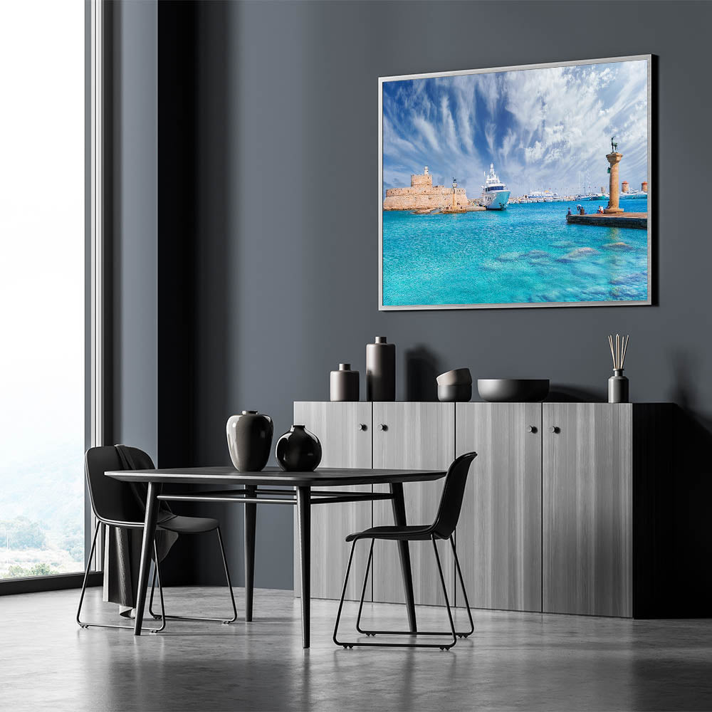 Let this piece of Rhodes Photography transport you to the peaceful harbor, where history meets the endless beauty of the sea. An elegant addition to any room, perfect for lovers of both Greece Landscape Art and coastal views.