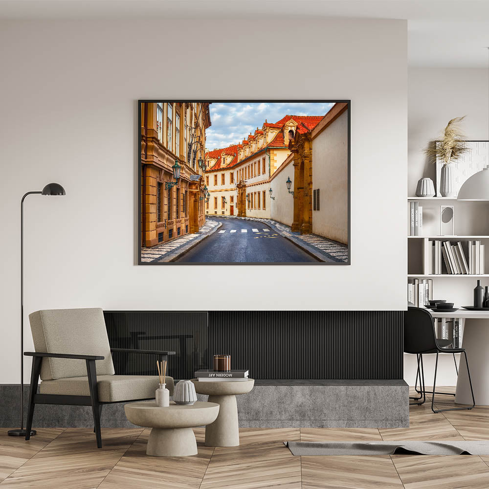 Capture the serene charm of European architecture with this captivating country road wall art. The image beautifully depicts a winding road nestled between historic buildings, creating an inviting pathway that draws the eye into the heart of the village. Perfect for adding a touch of old-world elegance to your home decor, this artwork is ideal for travelers and those who appreciate the timeless beauty of European streetscapes.