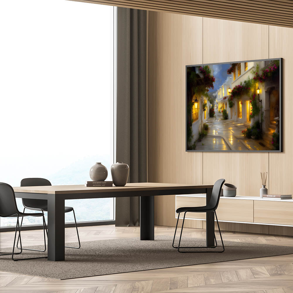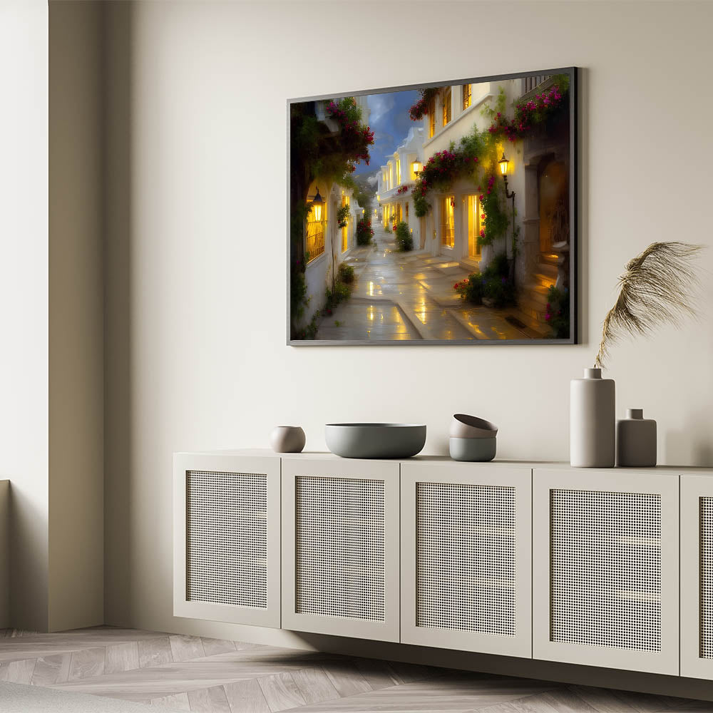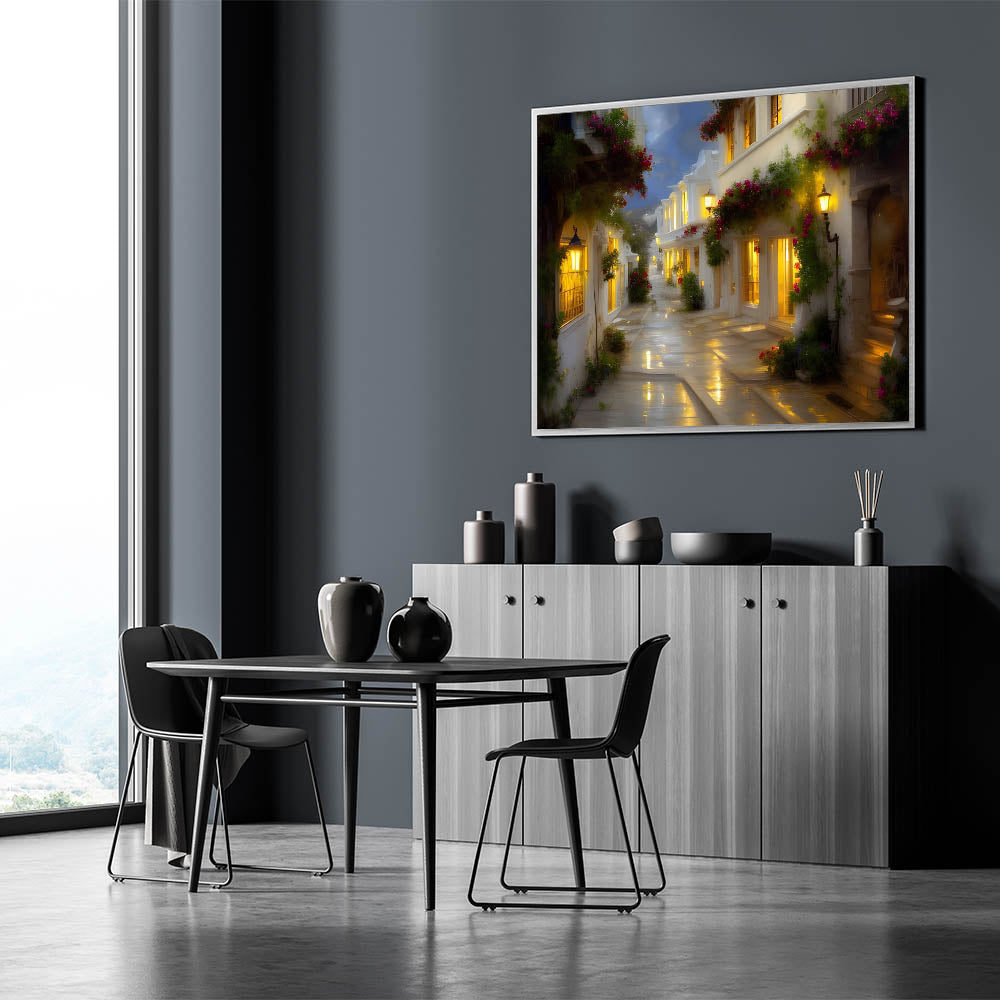 Step into a world of quaint beauty with this Charming Evening Alley wall art. Perfect for those who adore the quiet allure of small streets and romantic getaways, this artwork captures a serene alley lined with blooming flowers and softly glowing windows. The gentle light reflecting off the wet cobblestones creates a warm and inviting atmosphere, making it an ideal addition to any room that celebrates coziness and elegance.