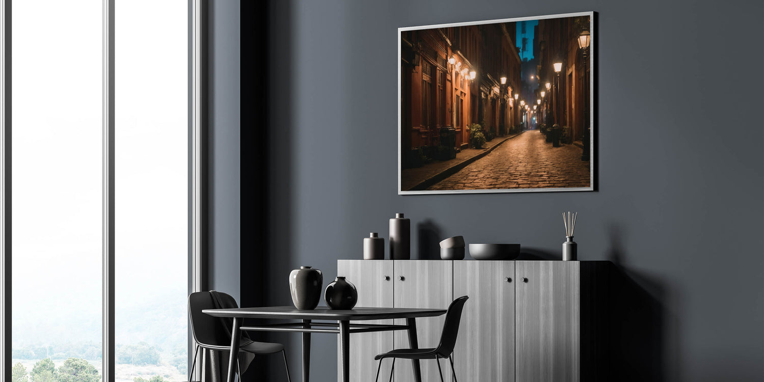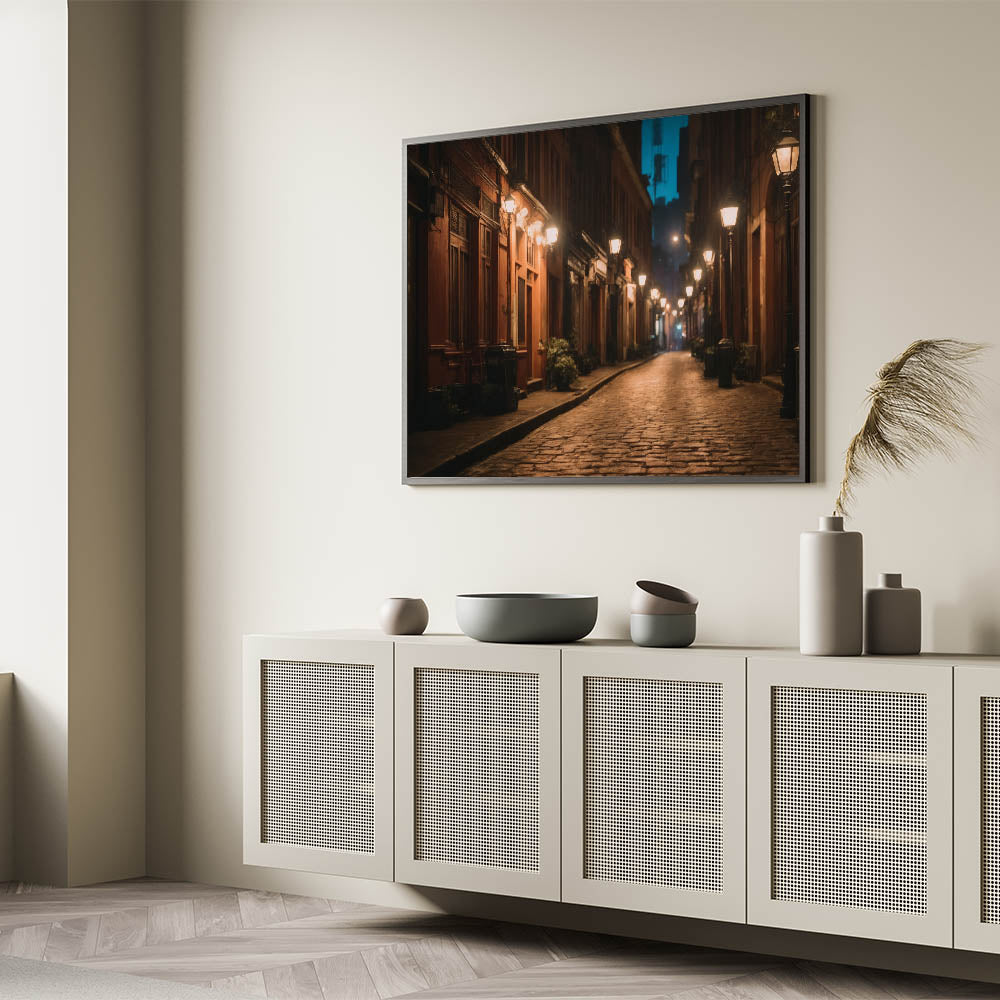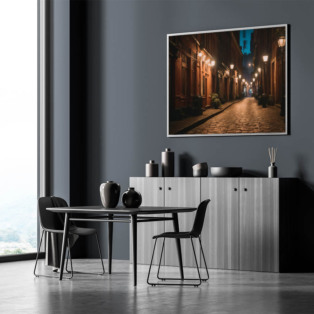 Experience the quiet charm of city streets with our "Charming Night Street Art." This evocative piece of landscape photography captures the serene atmosphere of a dimly lit urban pathway, where warm streetlights cast a gentle glow on cobblestone roads and historic buildings. Perfect for those who appreciate the beauty of urban life, this artwork brings the tranquil elegance of a nighttime stroll through the city into your home.