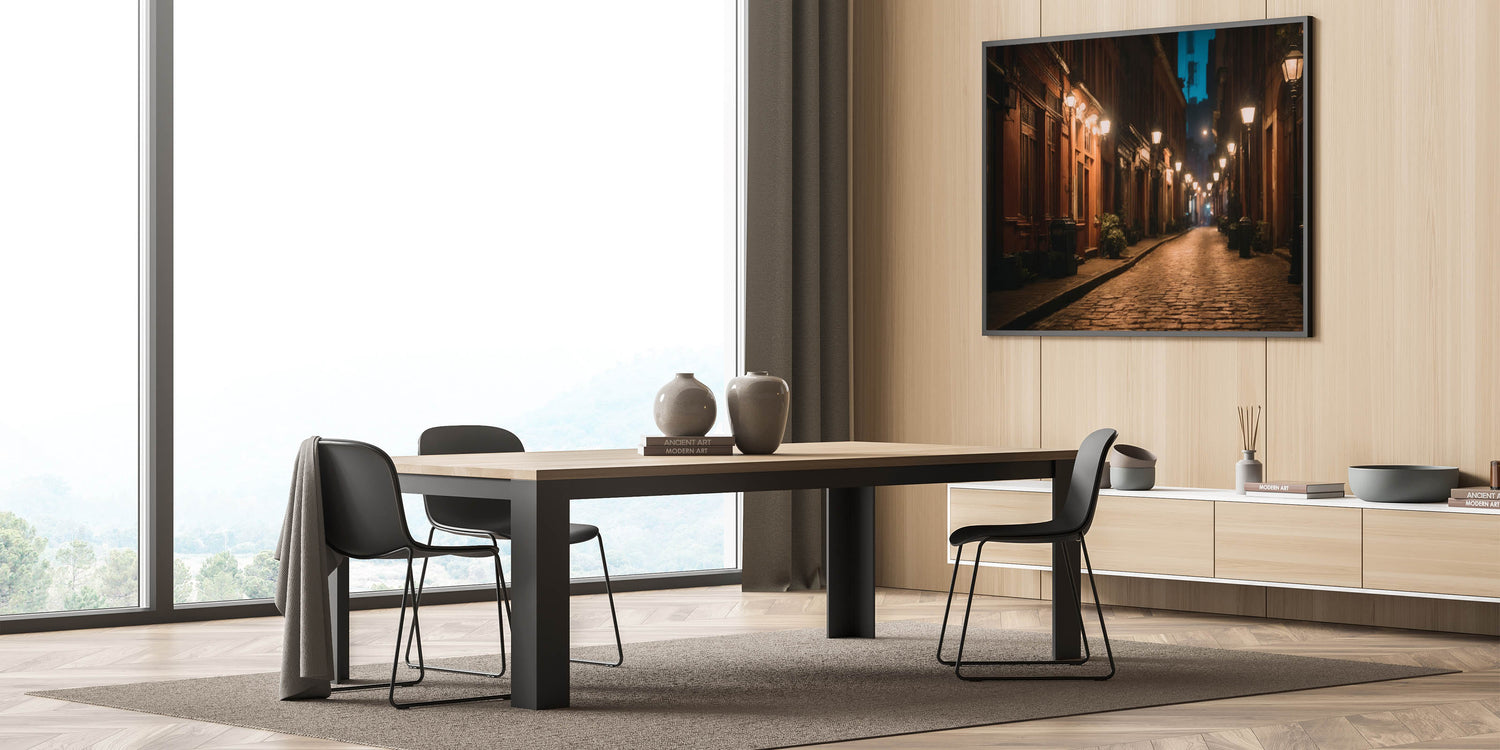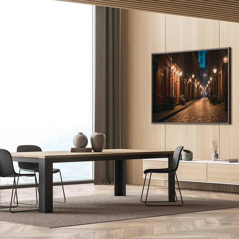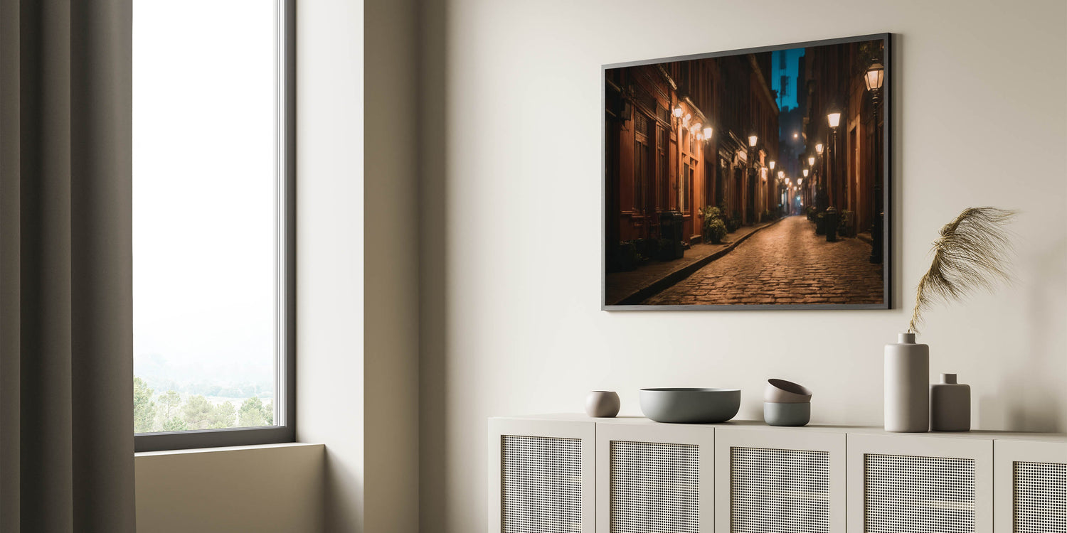 Experience the quiet charm of city streets with our "Charming Night Street Art." This evocative piece of landscape photography captures the serene atmosphere of a dimly lit urban pathway, where warm streetlights cast a gentle glow on cobblestone roads and historic buildings. Perfect for those who appreciate the beauty of urban life, this artwork brings the tranquil elegance of a nighttime stroll through the city into your home.