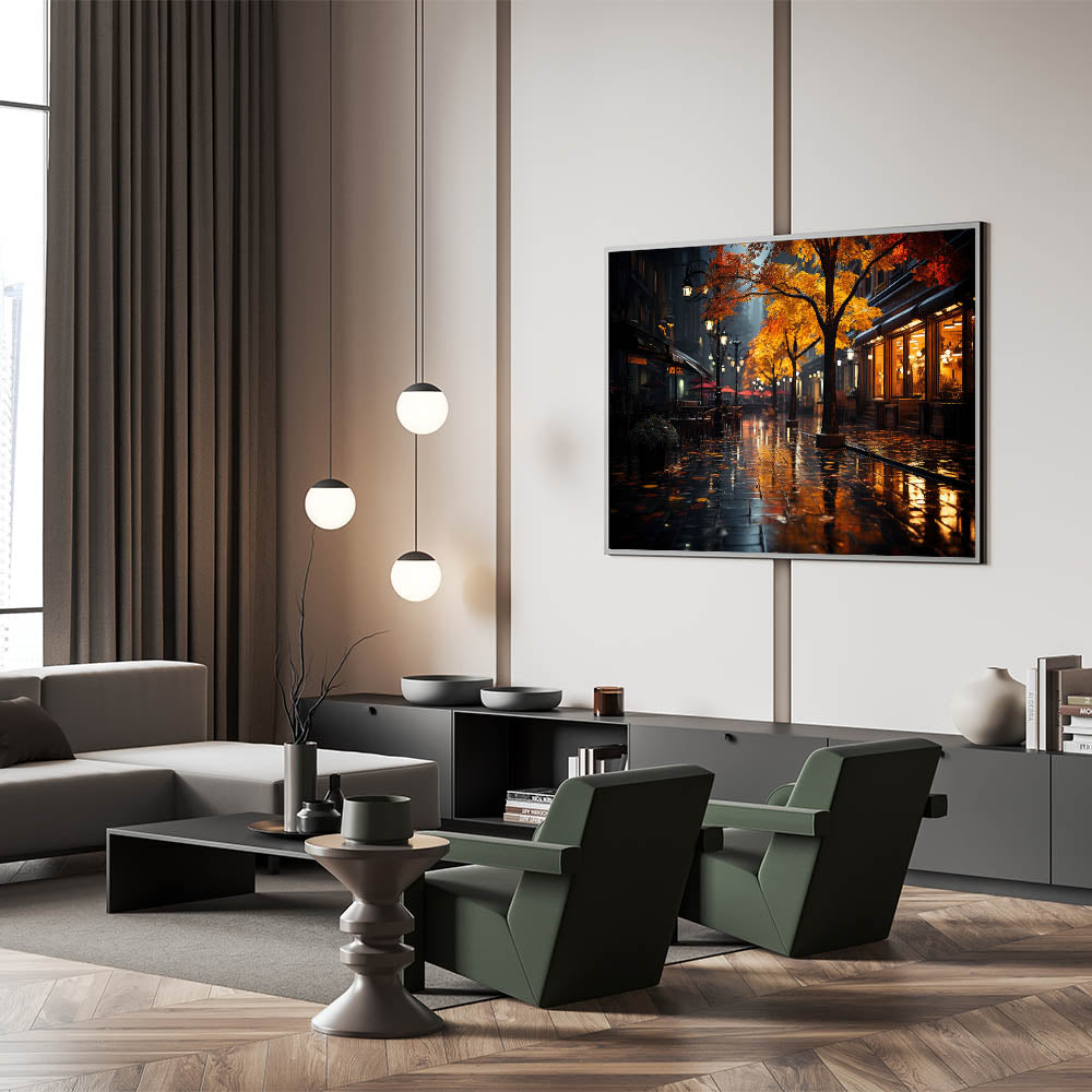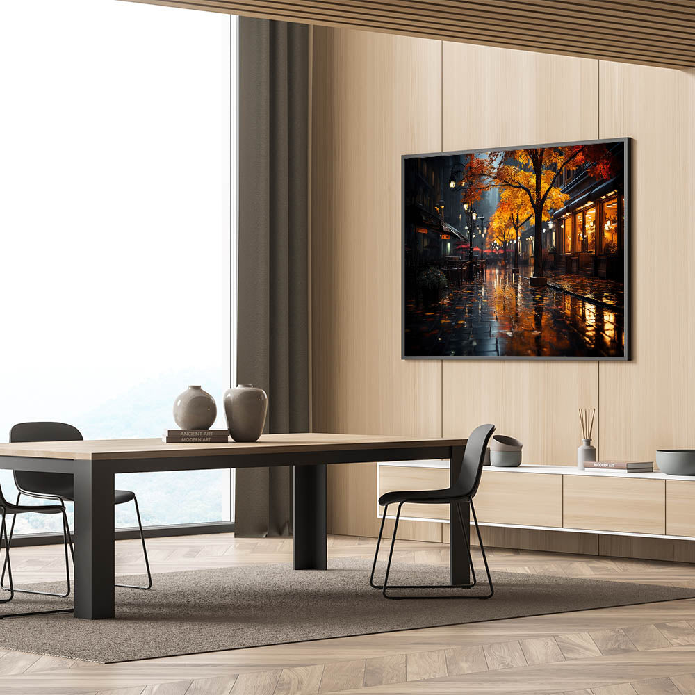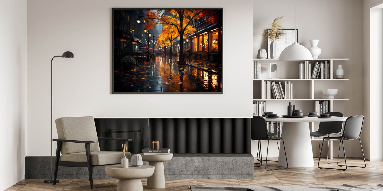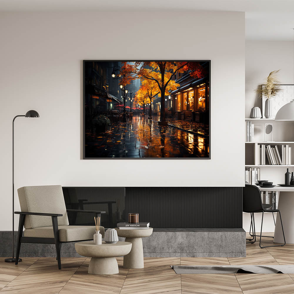 Step into the warmth of an autumn evening with this cozy autumn street wall art. The image captures a serene, rain-soaked city street adorned with vibrant orange and yellow leaves, reflecting the soft glow of street lamps and nearby café lights. Perfect for those who love the cozy, nostalgic feel of fall, this artwork brings the beauty of the season into your home, adding warmth and a touch of romance to any space.