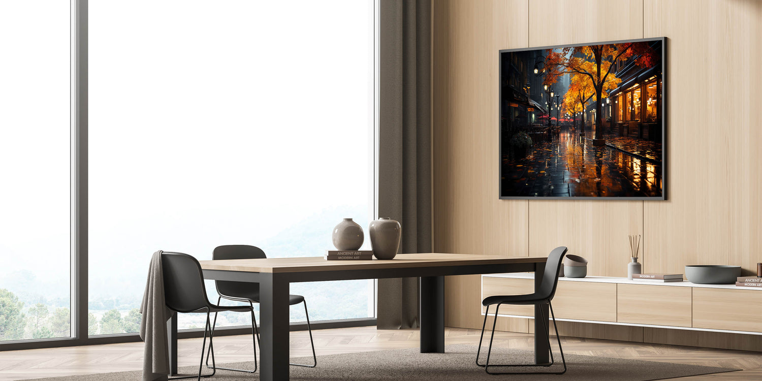Transform your space with this stunning autumn scene that captures the essence of fall. Whether displayed in a living room, hallway, or office, this piece will add a sense of comfort and elegance to your decor. Let this artwork transport you to a peaceful evening walk through a cozy, autumn-lit street.