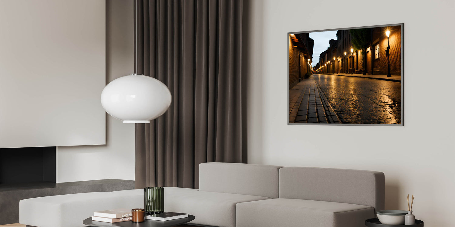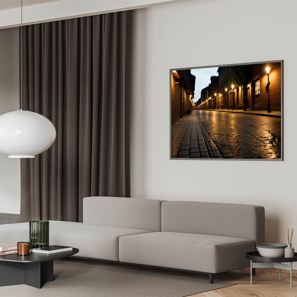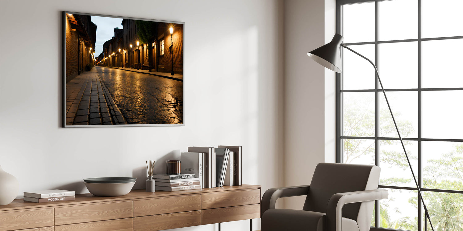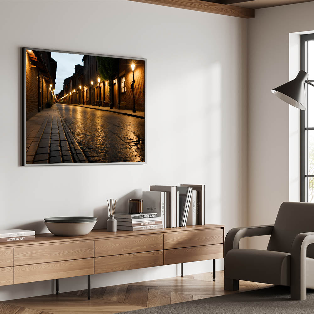 Capture the peaceful ambiance of a city street at dusk with our "Quiet Evening Street Art." This stunning piece of landscape photography features a cobblestone street bathed in the warm glow of streetlights, leading the eye down a tranquil, empty pathway. The muted tones and soft lighting evoke a sense of calm and solitude, making this artwork perfect for creating a cozy and intimate atmosphere in any room.