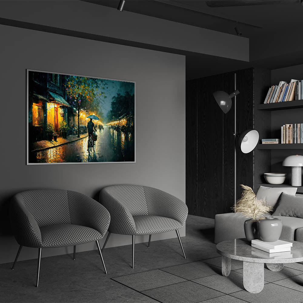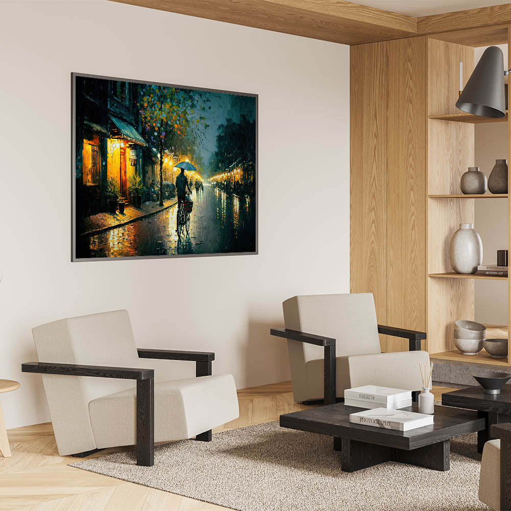 Capture the serene beauty of a quiet, rainy night with this enchanting Rainy Night Bicycle Ride wall art. Perfect for those who appreciate the calm and reflective moments of urban life, this artwork depicts a cyclist under an umbrella, leisurely riding through a softly lit, rain-soaked street. The warm glow from the shopfronts and the wet reflections on the pavement add a cozy and nostalgic feel, making it an ideal piece for any space seeking a touch of tranquility and charm.