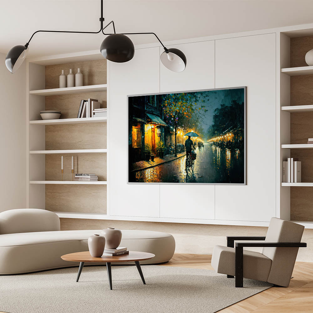 Bring the quiet charm of a rainy evening into your space with this beautiful piece of urban art. Whether you're drawn to the peaceful scene or the warm, inviting colors, this wall art is sure to create a soothing and welcoming atmosphere in any setting.