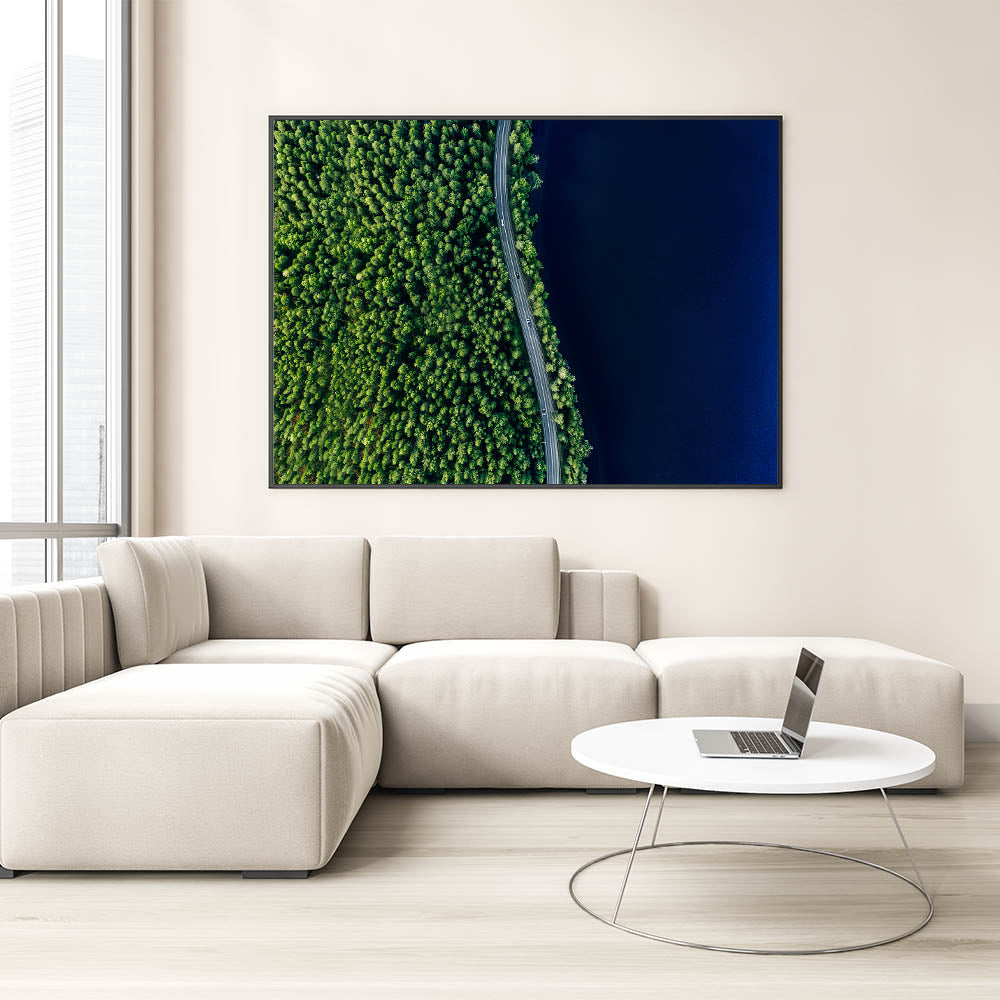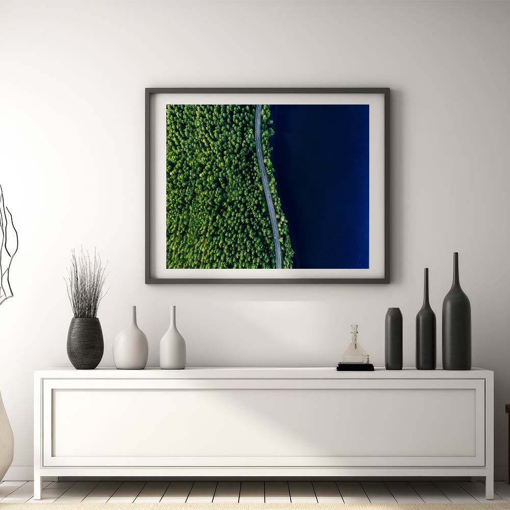 Elevate your space with the breathtaking beauty of nature captured in this Scenic Forest Road Aerial wall art. Ideal for nature enthusiasts and those who appreciate the serenity of the outdoors, this artwork offers a stunning bird’s-eye view of a winding road cutting through a dense forest, bordered by a deep, tranquil lake. The contrast between the lush green trees and the dark blue water creates a mesmerizing composition that brings a sense of calm and wonder to any room.