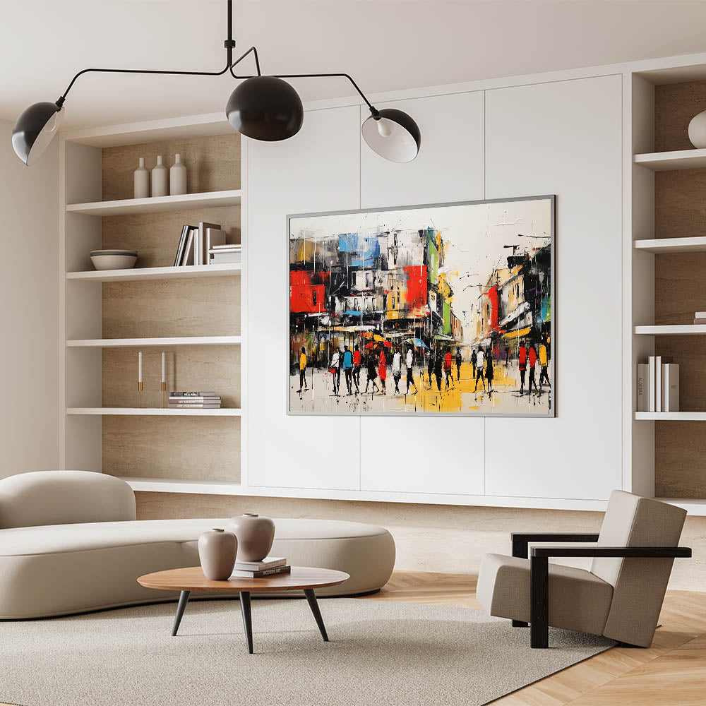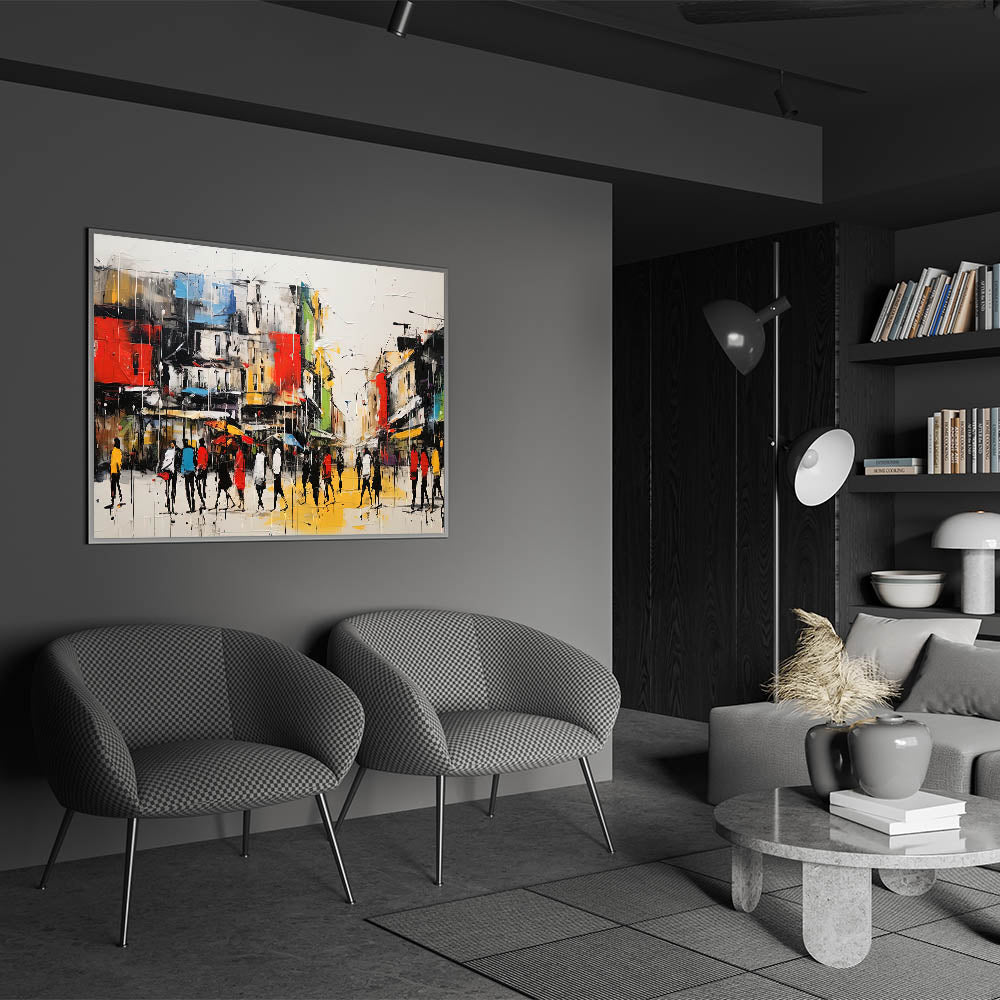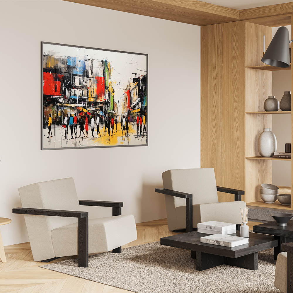Transform your home or office with this captivating abstract cityscape. Whether you want to brighten up a living room, bedroom, or workspace, this piece will add an energetic and artistic flair to your decor. Let this artwork be a daily reminder of the dynamic pulse of urban life.