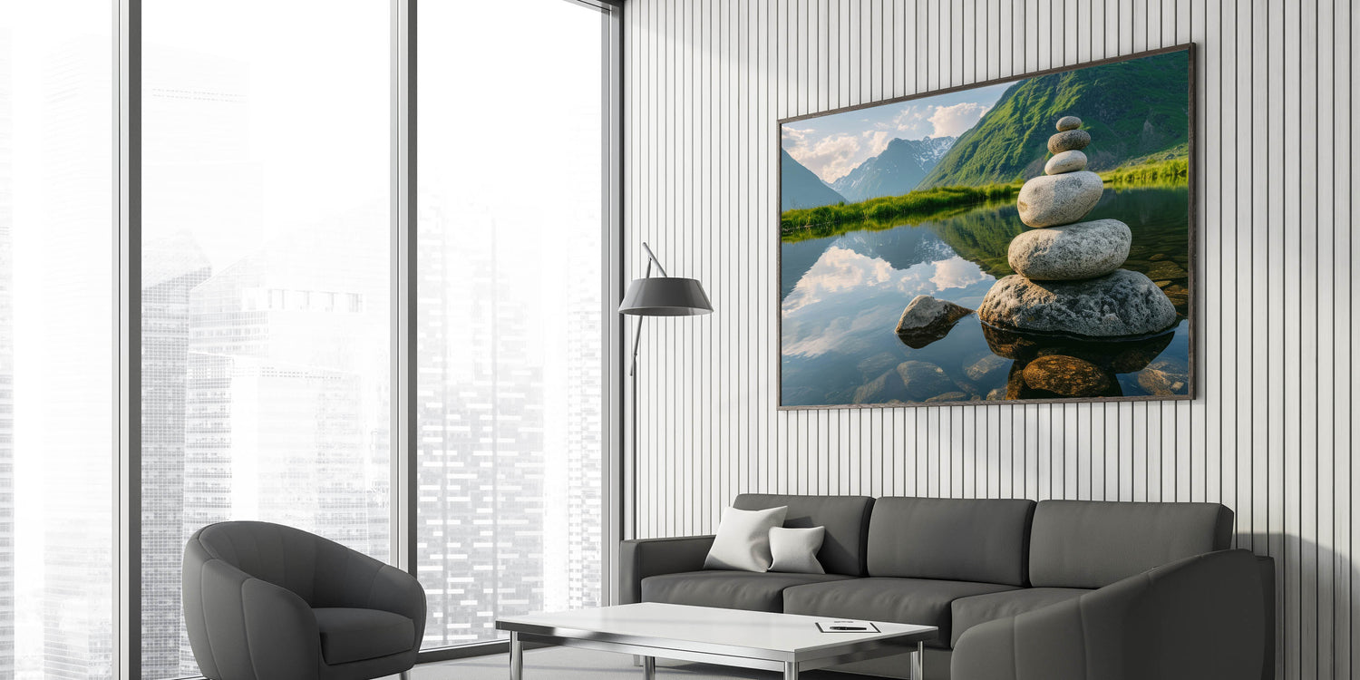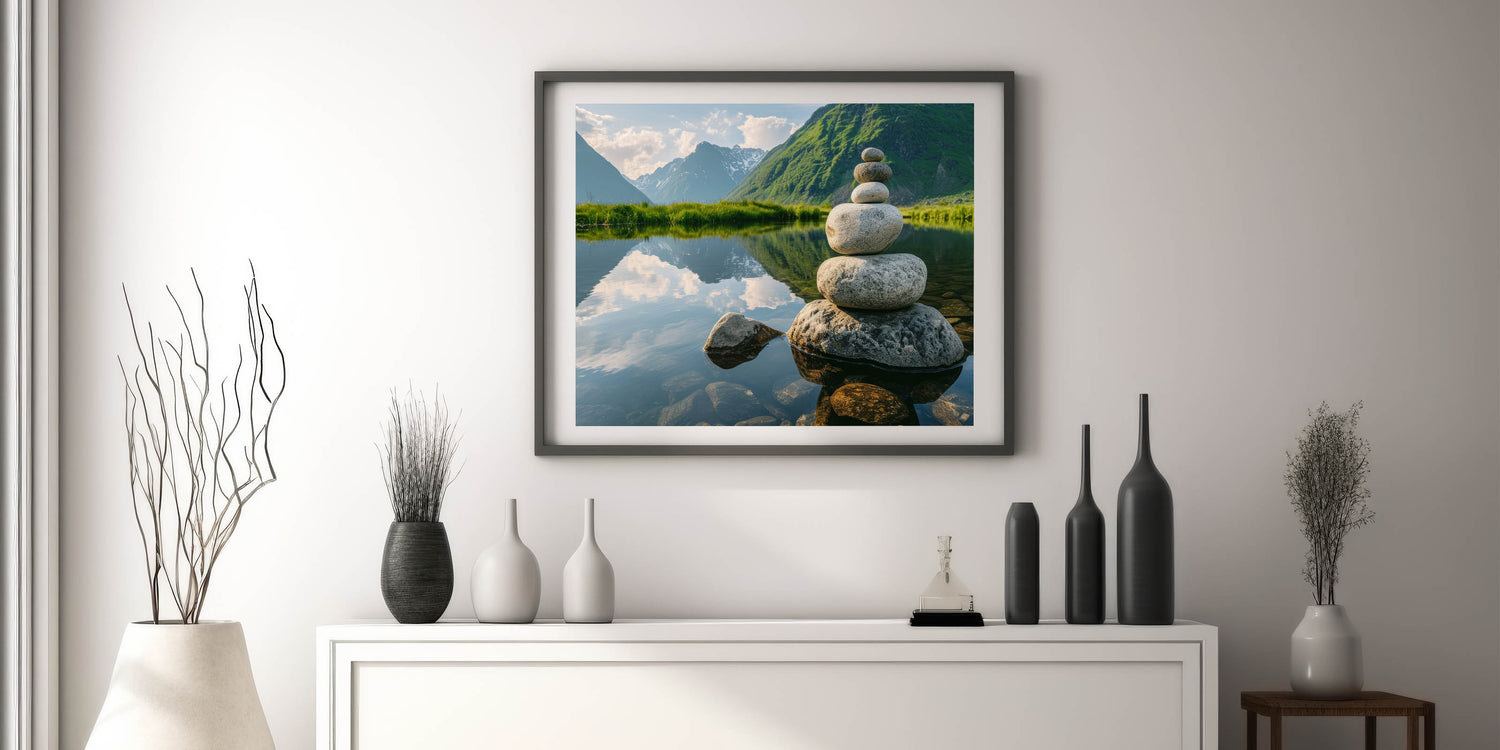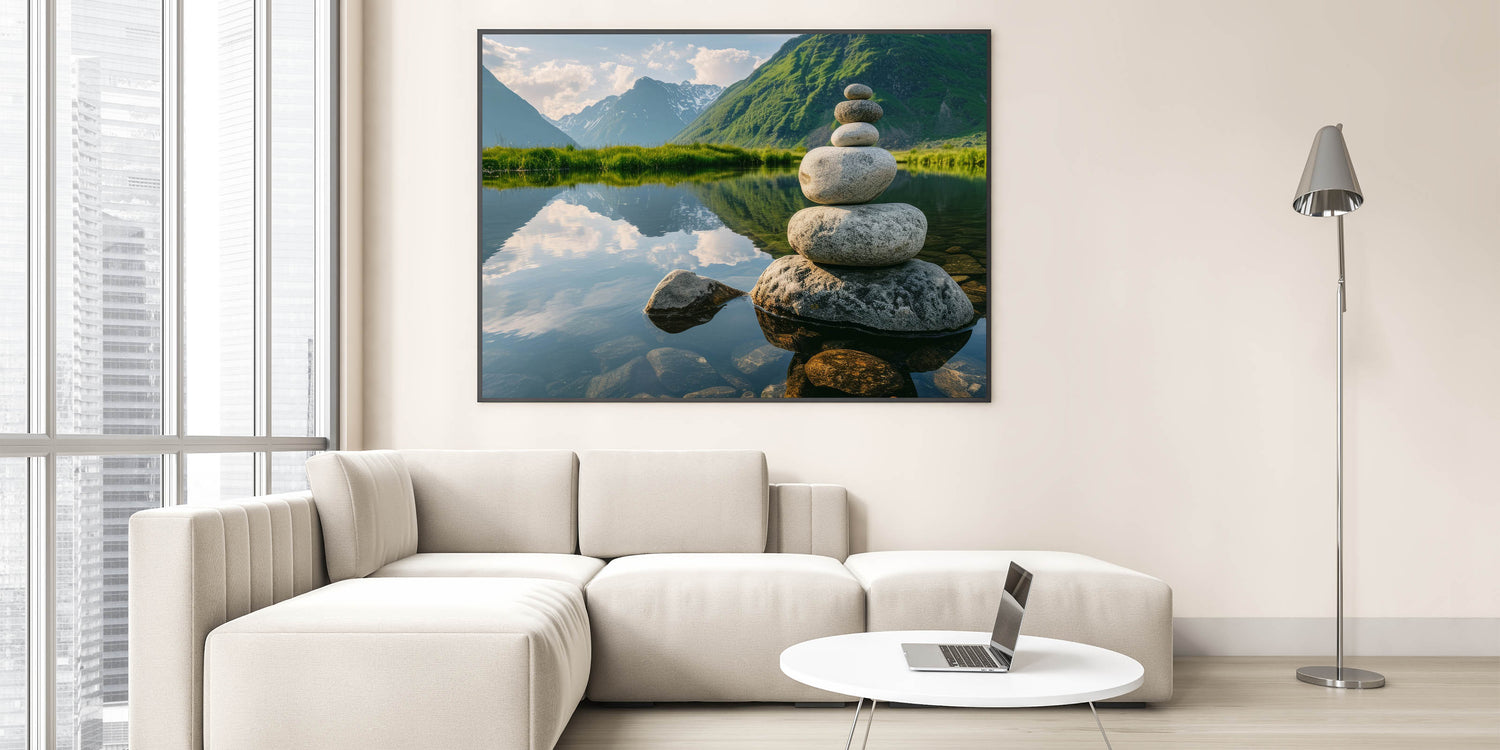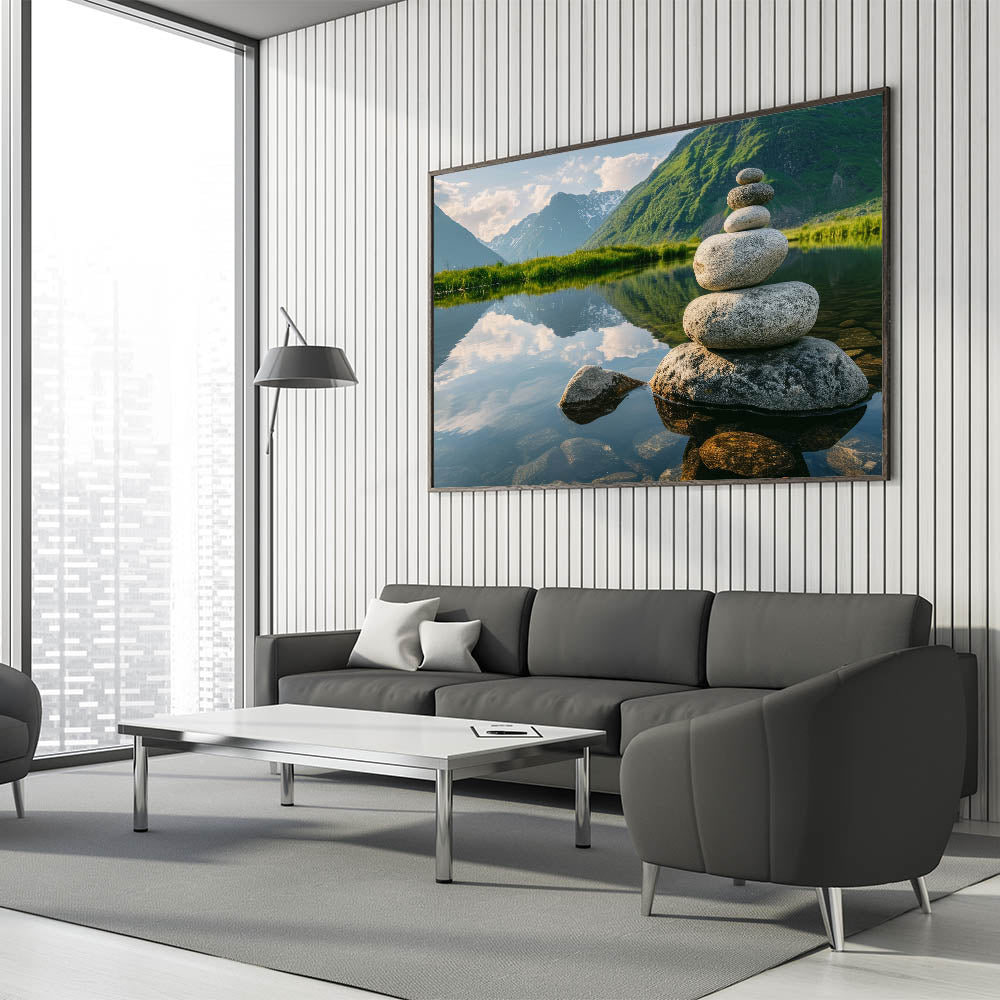 - Unique Rock Photography: Captures the delicate balance and tranquility of nature with beautifully stacked stones and crystal-clear reflections.