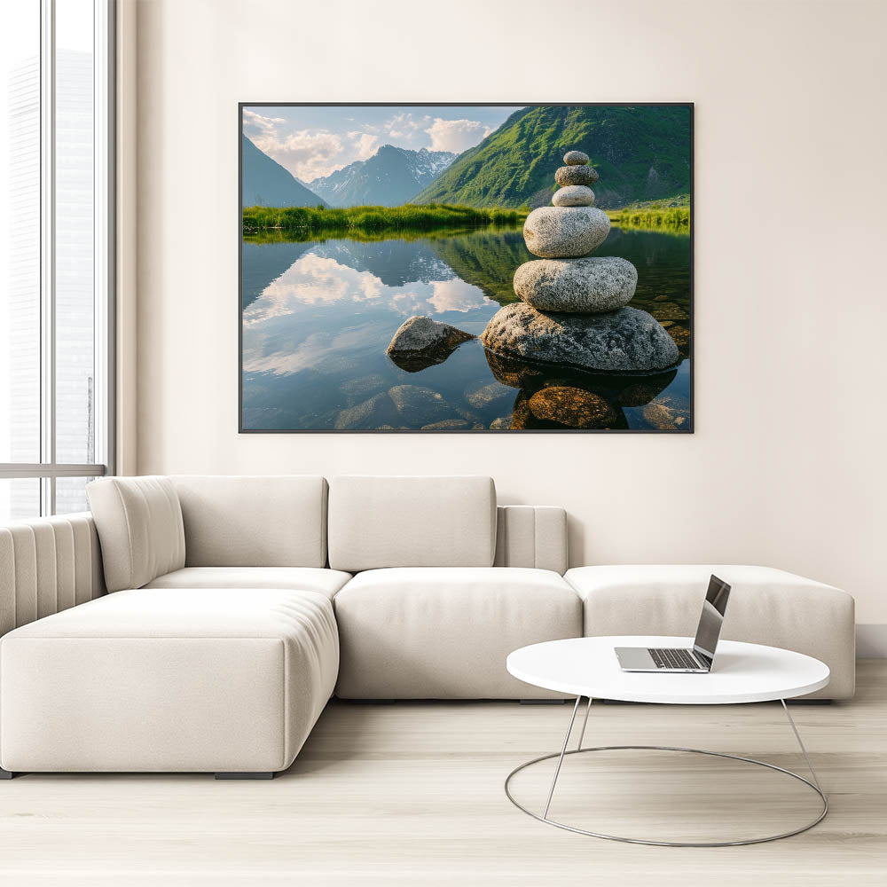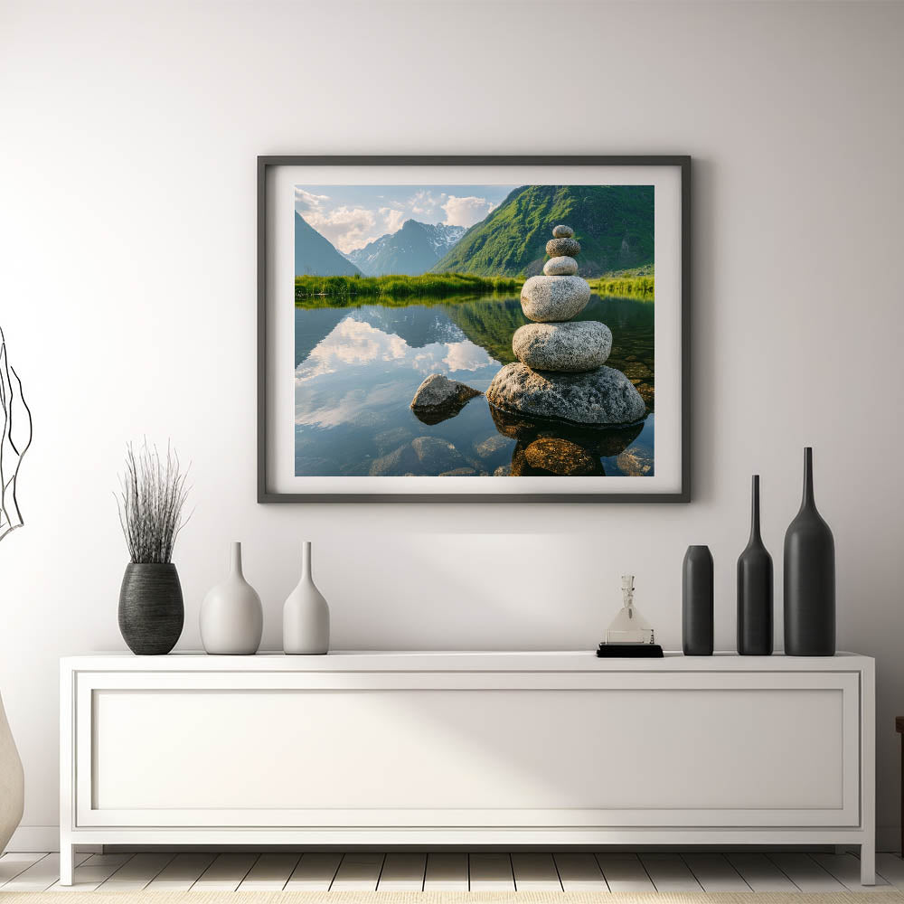 Balanced Stones by the Lake – Nature Rocks Landscape Rock Wall Art