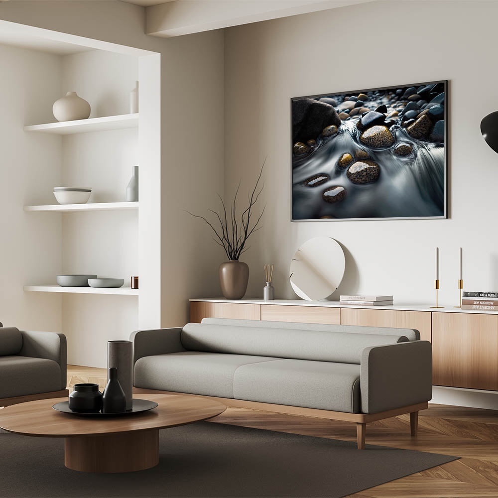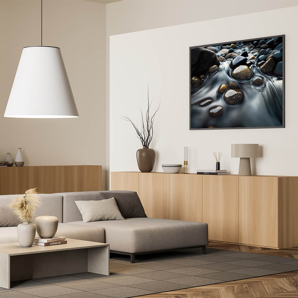 Transform your space with this tranquil piece of wall art, capturing the serene beauty of water gently flowing over smooth stones. The soft movement of the water creates a calming effect, while the varying textures and colors of the stones add depth and interest to the composition. This artwork is perfect for bringing a sense of peace and natural beauty to any room, whether it be a living room, bedroom, or office.