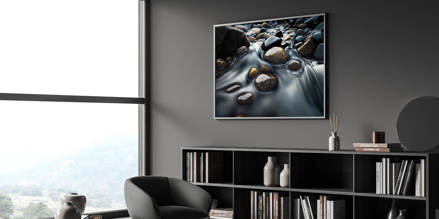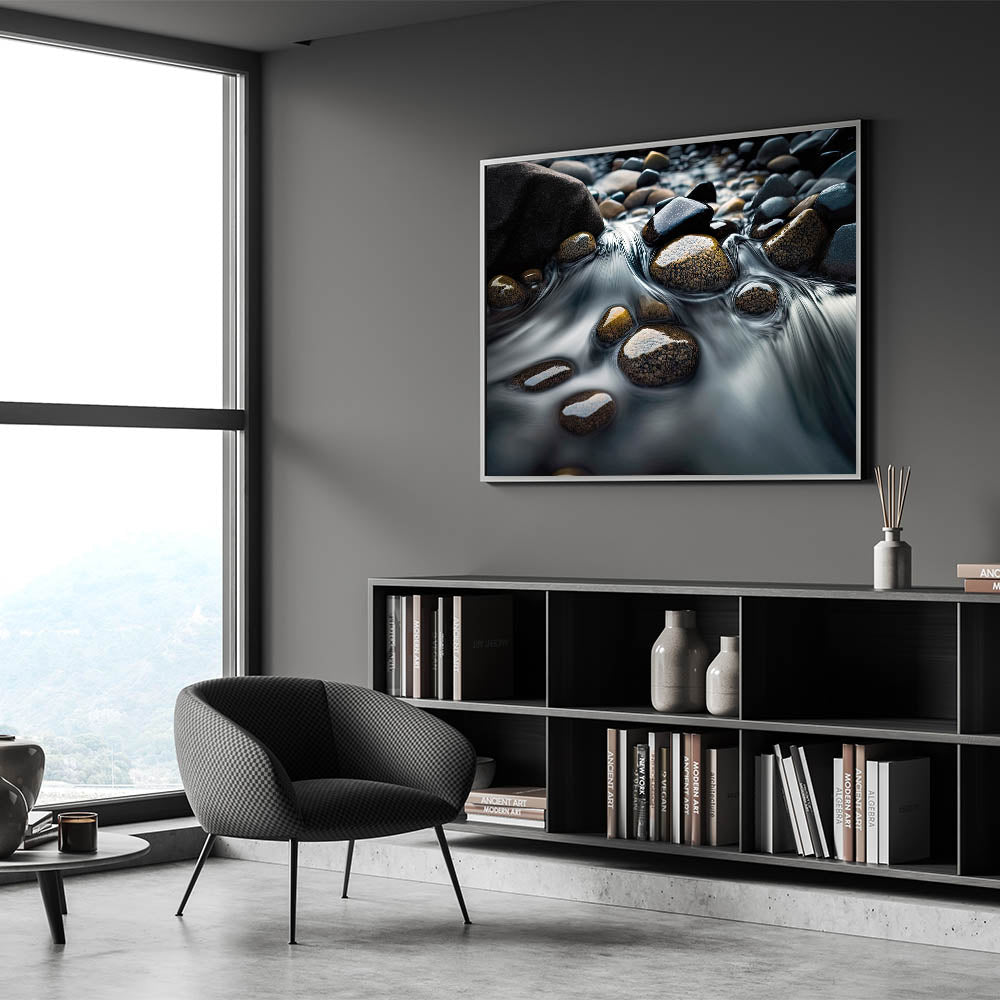 Flowing Water Over Stones - Serene River Rock Art, Nature-Inspired Decor