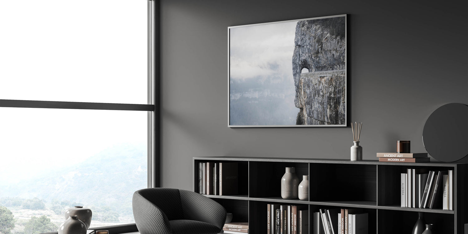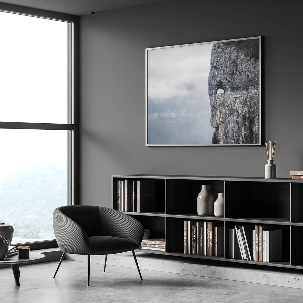 Immerse yourself in the breathtaking beauty of nature with this stunning piece of wall art, featuring a dramatic cliffside road carved into the rugged rock face. The stark contrast between the cold, gray rocks and the misty, ethereal sky creates a powerful, almost mystical atmosphere. This unique rock photography captures the essence of nature's raw power and beauty, making it a perfect addition to any space that values bold, impactful decor.