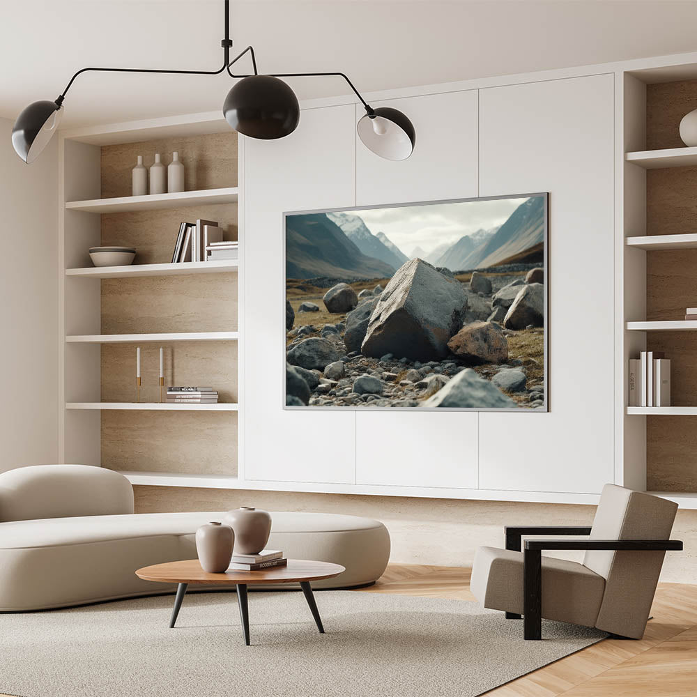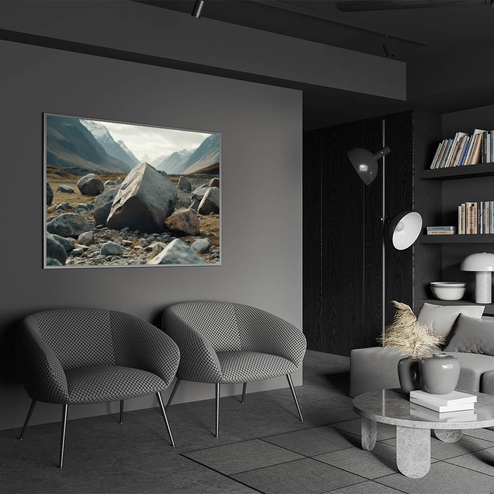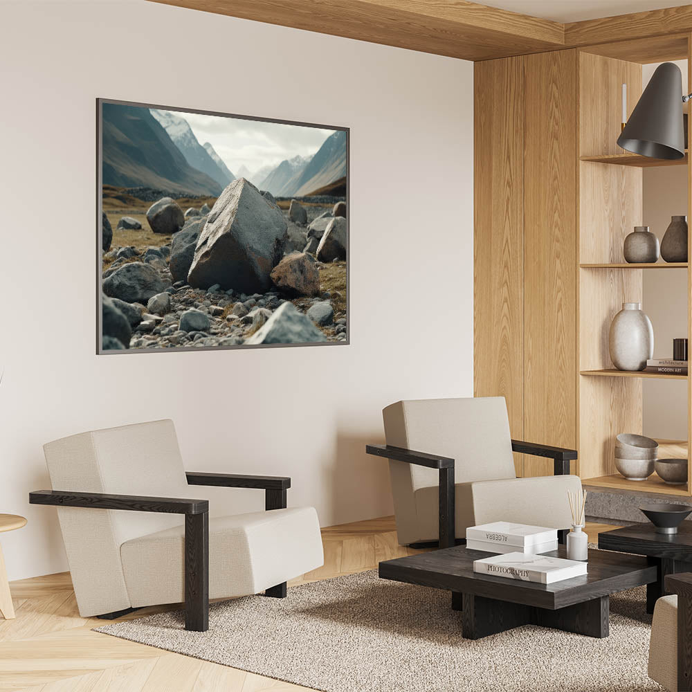 Capture the serene beauty of nature with this exquisite rock wall art, featuring a tranquil mountain landscape dotted with majestic boulders. The intricate details of the rocks, set against the backdrop of towering mountains, create a scene of natural harmony and peace. This artwork is perfect for nature enthusiasts who seek to bring the calm and majesty of the great outdoors into their home or office space. The subdued color palette and realistic textures make it a versatile piece that complements a variety of decor styles.