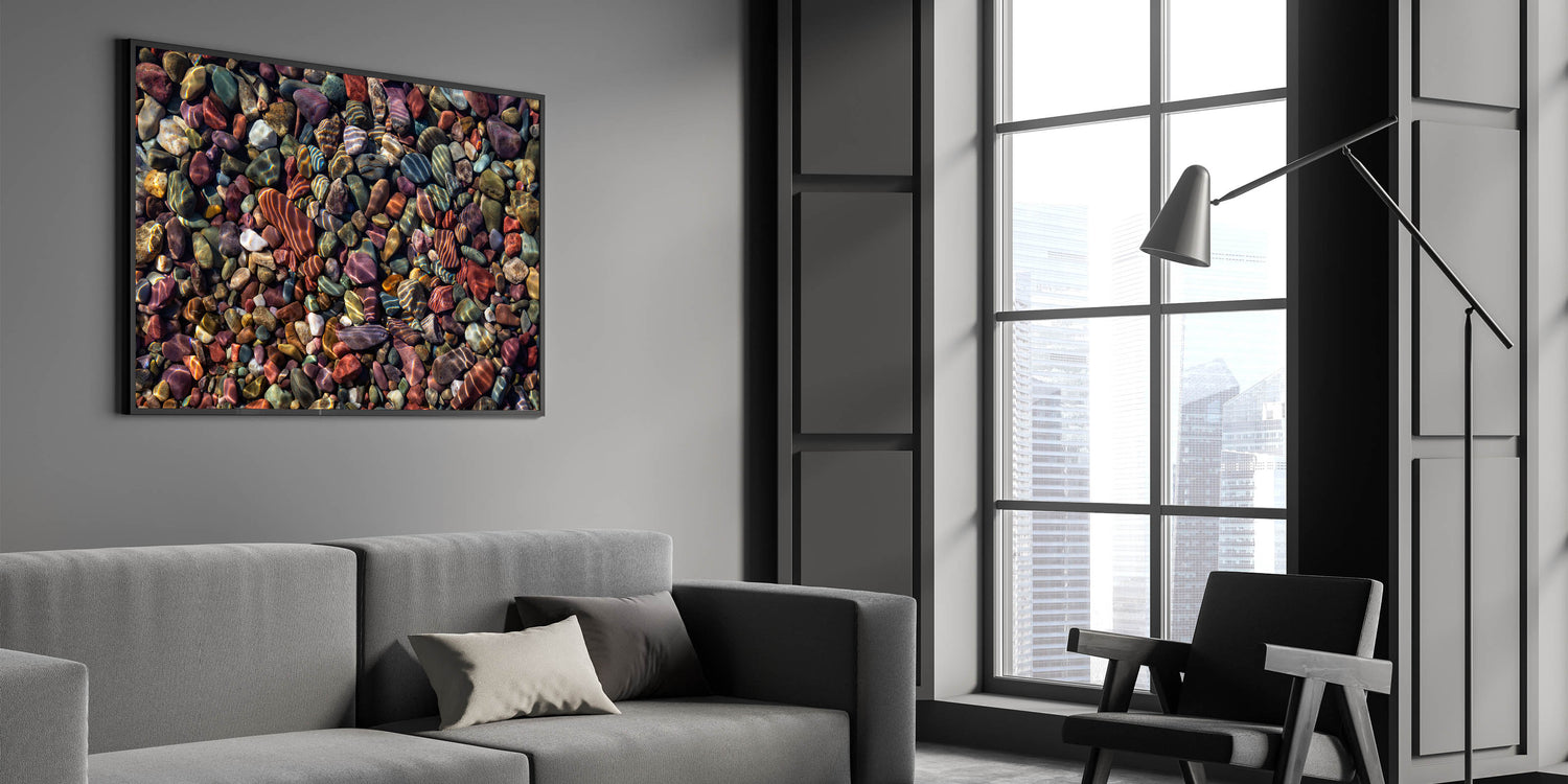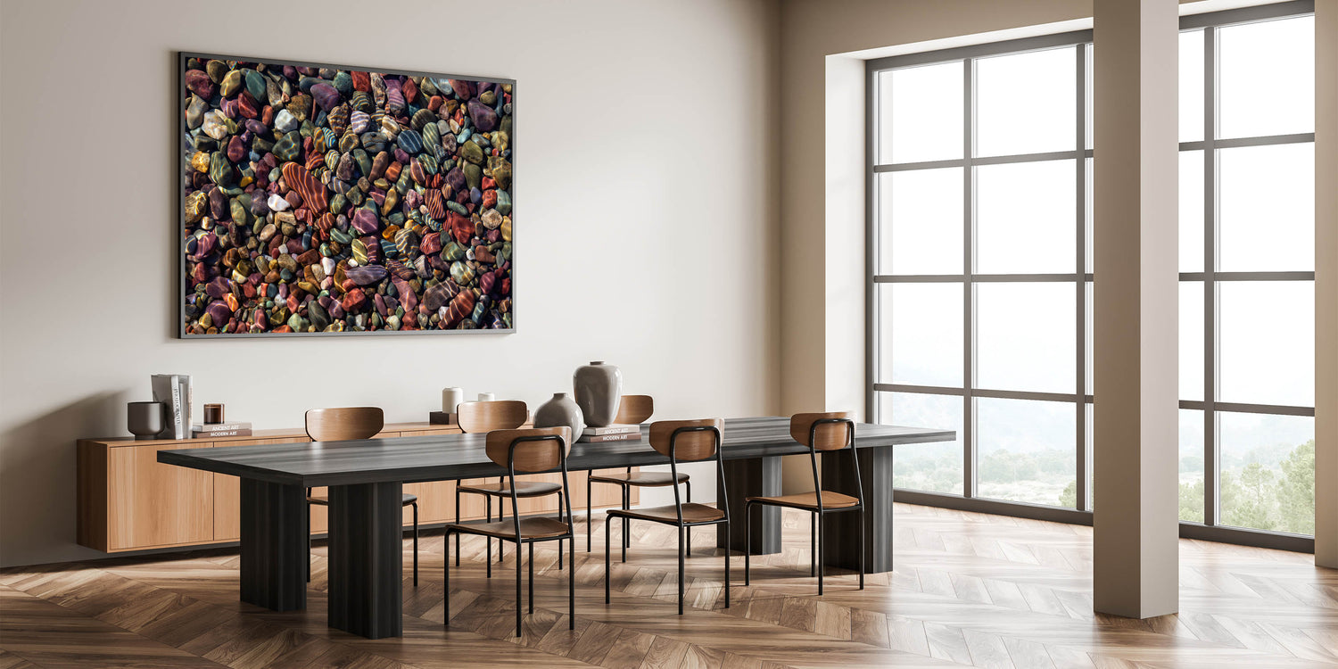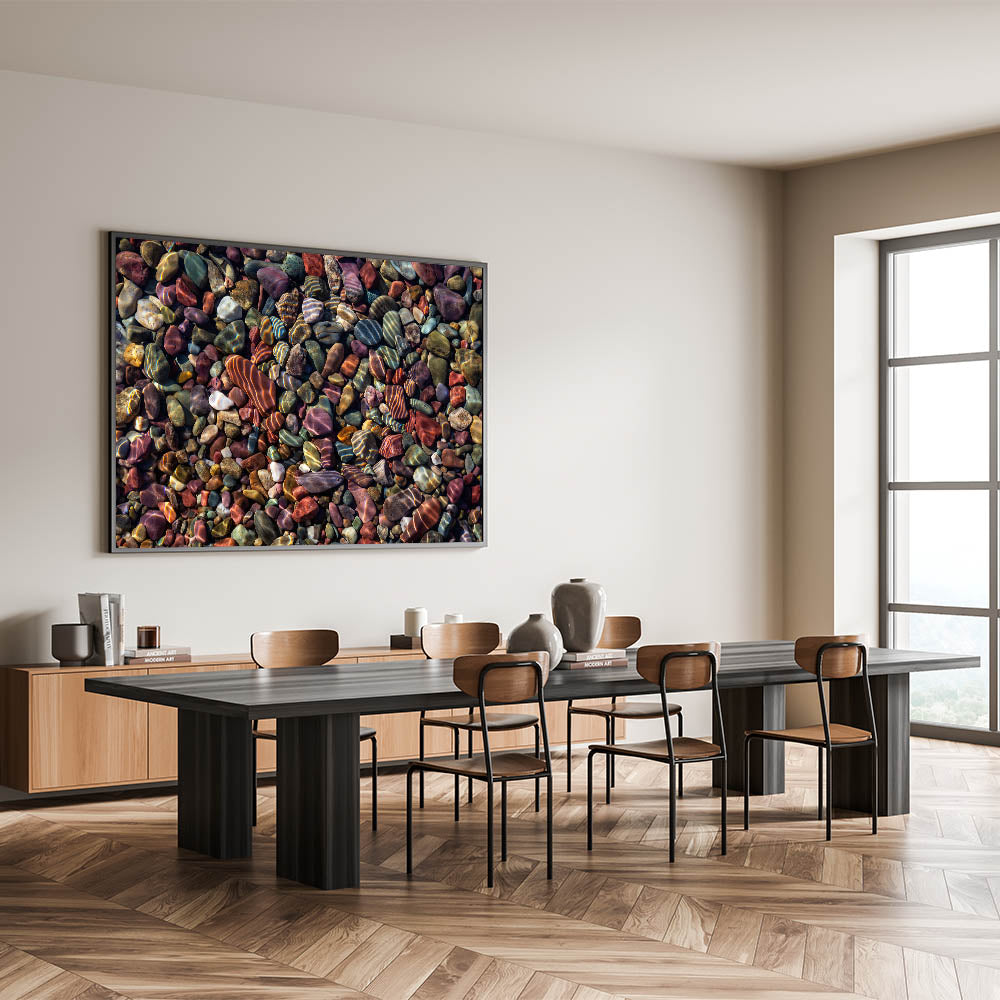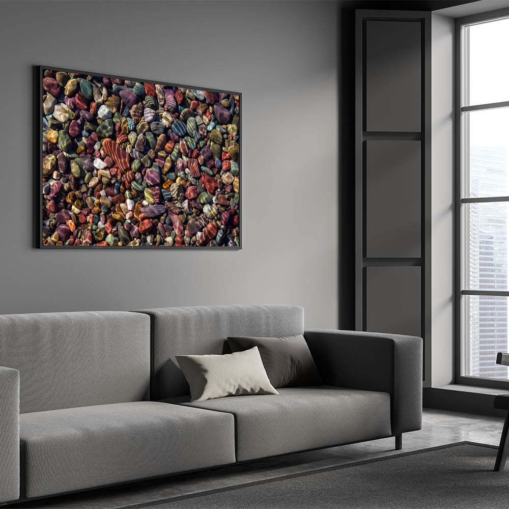 Transform your space with this stunning wall art featuring an array of colorful rocks, beautifully captured in high-definition. This piece brings the serene and timeless beauty of nature into your home, showcasing the intricate patterns and vibrant hues found in these natural formations.