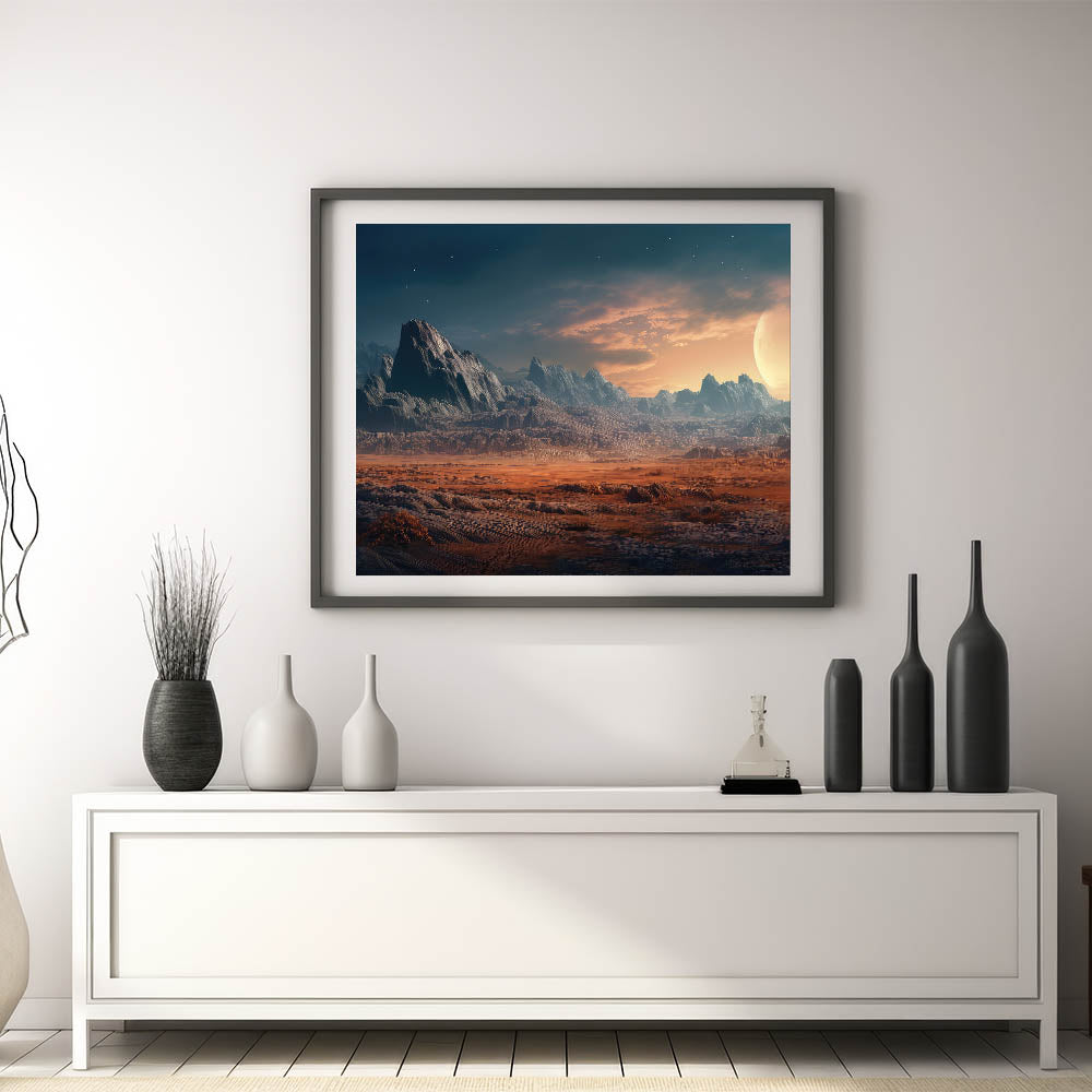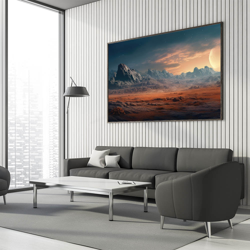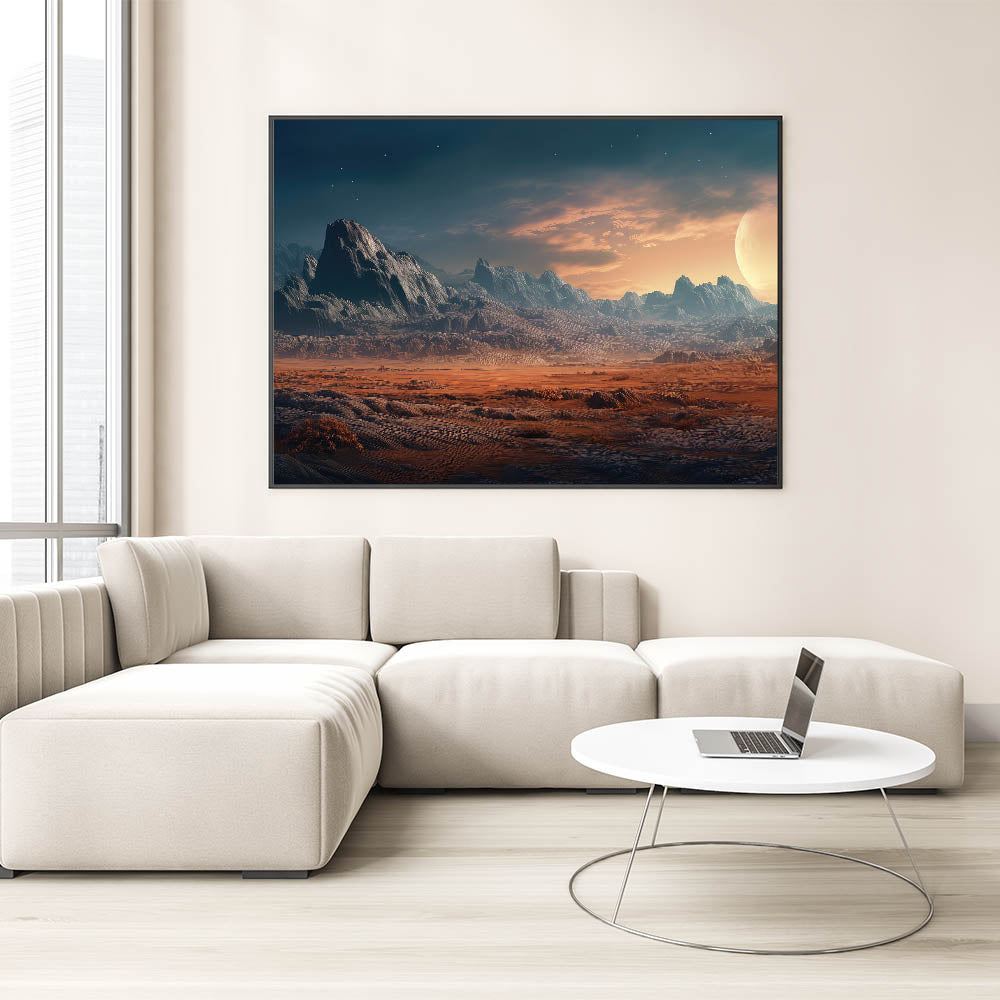 Transform your space with this stunning piece of rock wall art, capturing the breathtaking beauty of nature. This artwork showcases a majestic rock formation set against a surreal landscape, illuminated by the soft glow of a setting sun. The intricate details of the rocky terrain and the expansive sky create a scene that is both captivating and serene, making it a perfect addition to any home decor.
