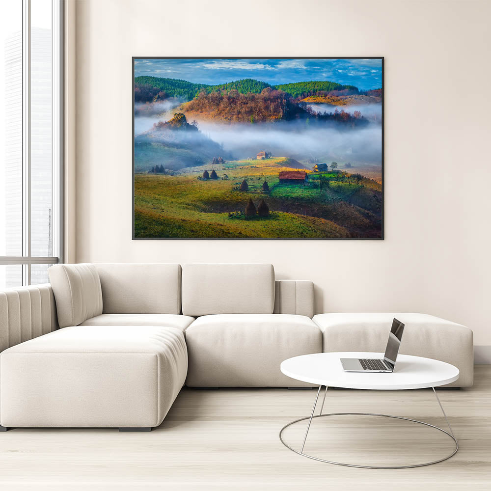 Step into the peaceful Romanian countryside with this stunning Carpathian Mountains art piece. The rolling hills, misty valleys, and serene rural landscape create a sense of calm and tranquility. The vibrant greens and soft light transport you to a traditional Romanian scene, making this print an ideal addition to any space.