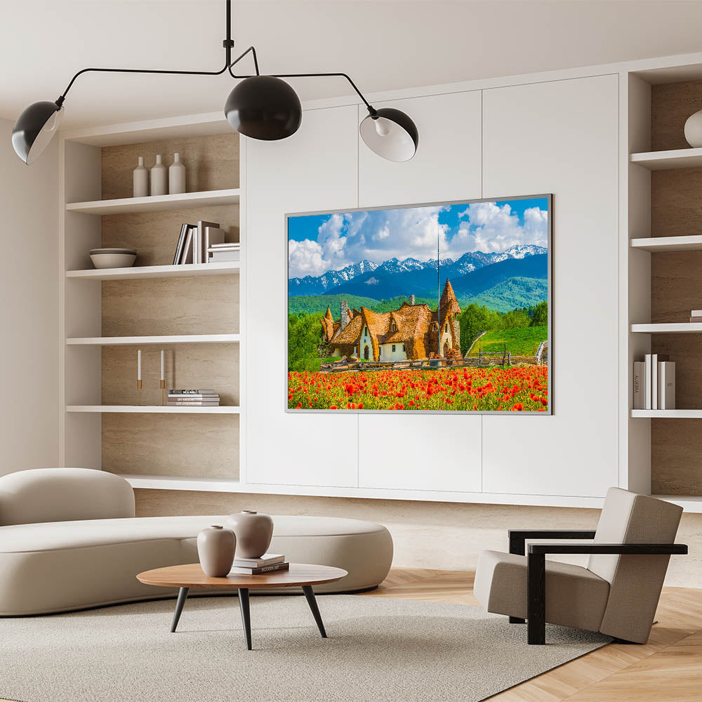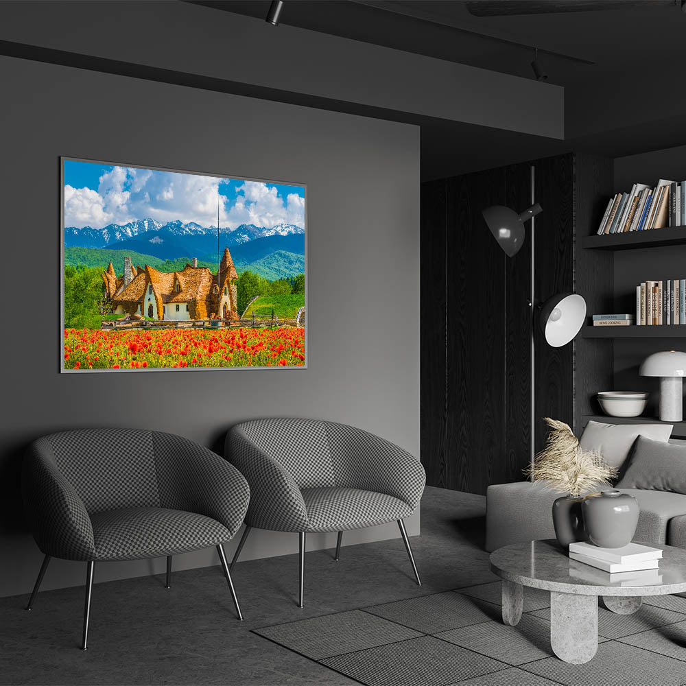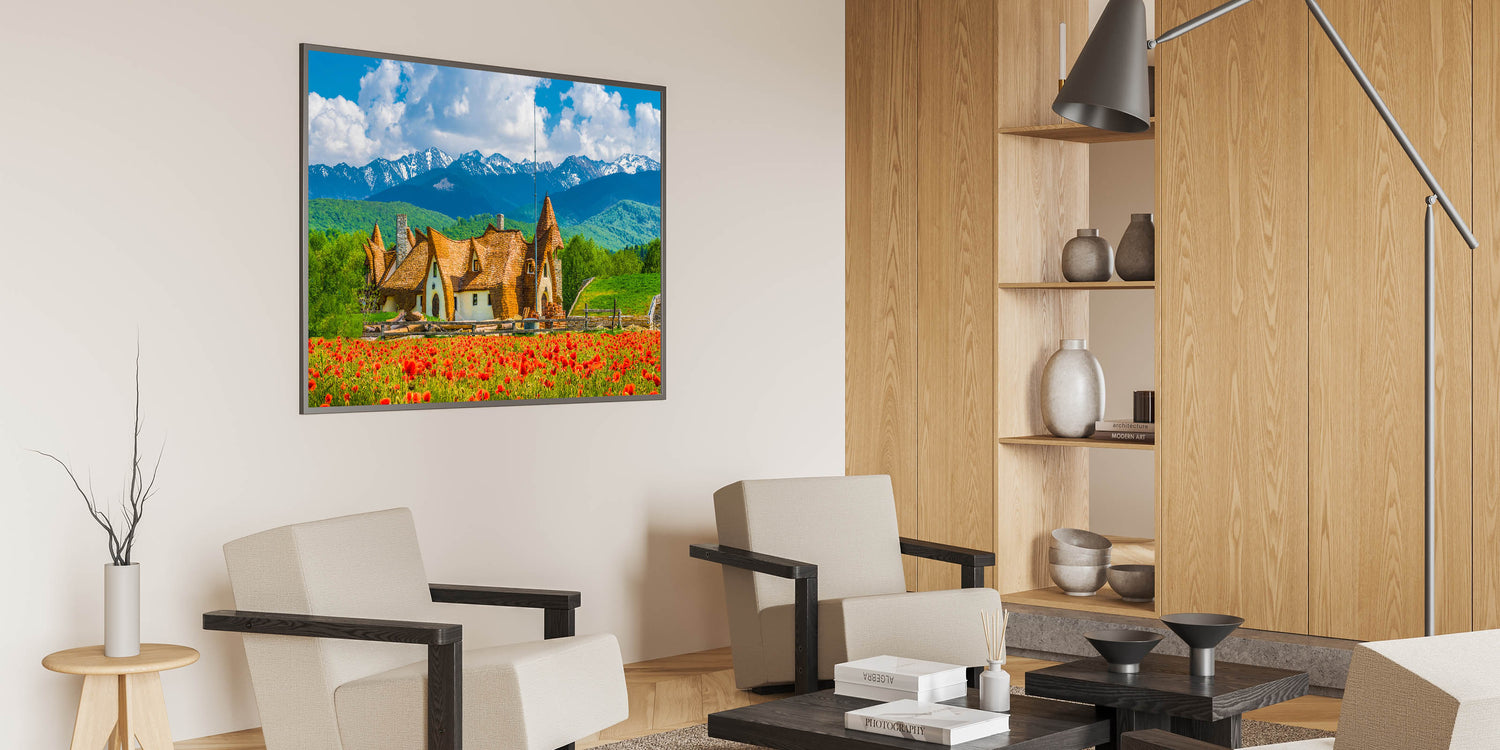 This beautiful wall art print showcases the perfect harmony between Romania's traditional architecture and the stunning backdrop of the Carpathian Mountains. The vibrant red flowers in the foreground add a pop of color to the scene, while the whimsical cottage and snow-capped peaks create a fairytale-like atmosphere. This print is ideal for bringing a touch of natural beauty and cultural charm into your space.