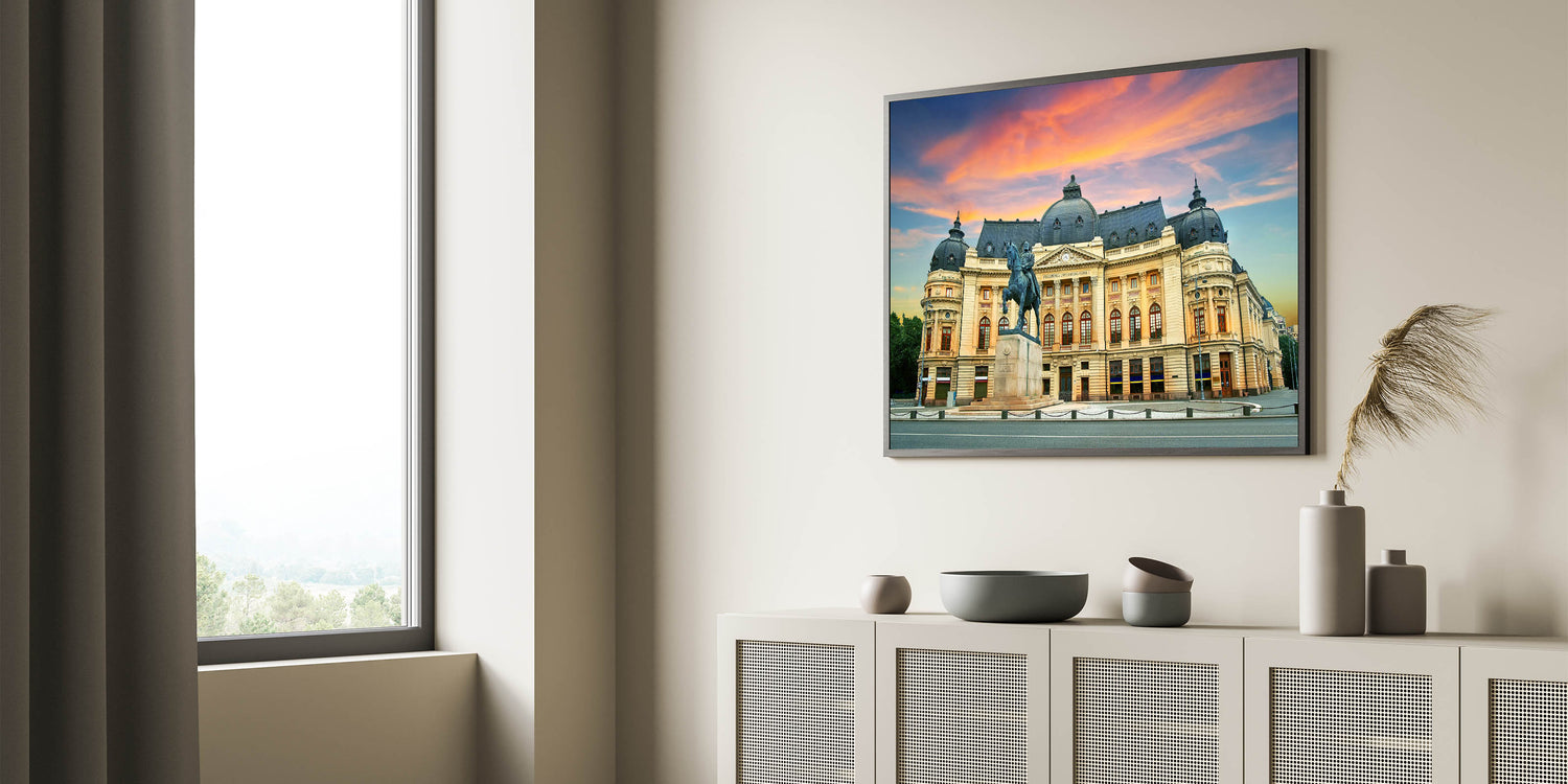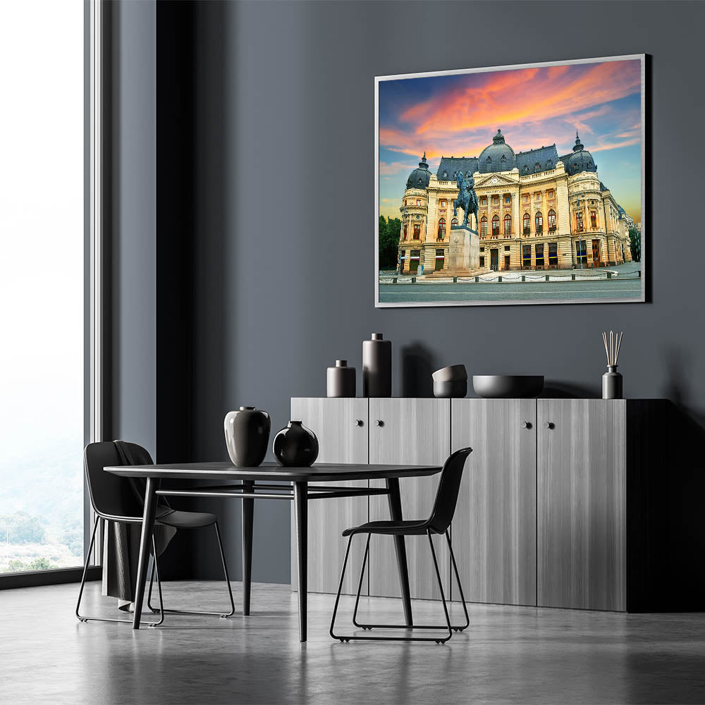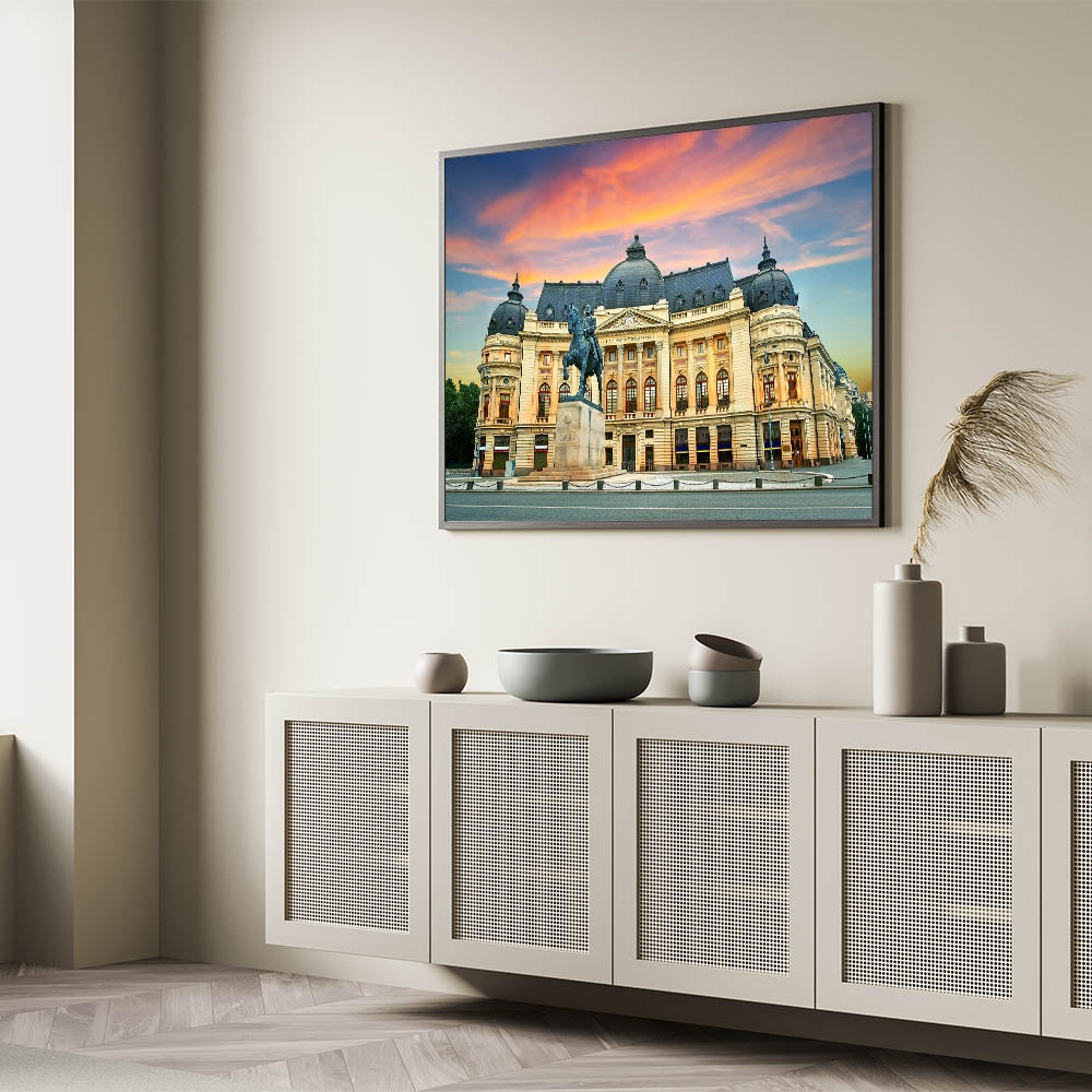 Celebrate the rich architectural heritage of Romania with this stunning canvas print of a Bucharest historical landmark. The majestic statue and beautifully detailed building are brought to life with vibrant colors and striking contrasts. This artwork captures the heart of Romania’s capital city, making it the perfect piece for any history or art lover.