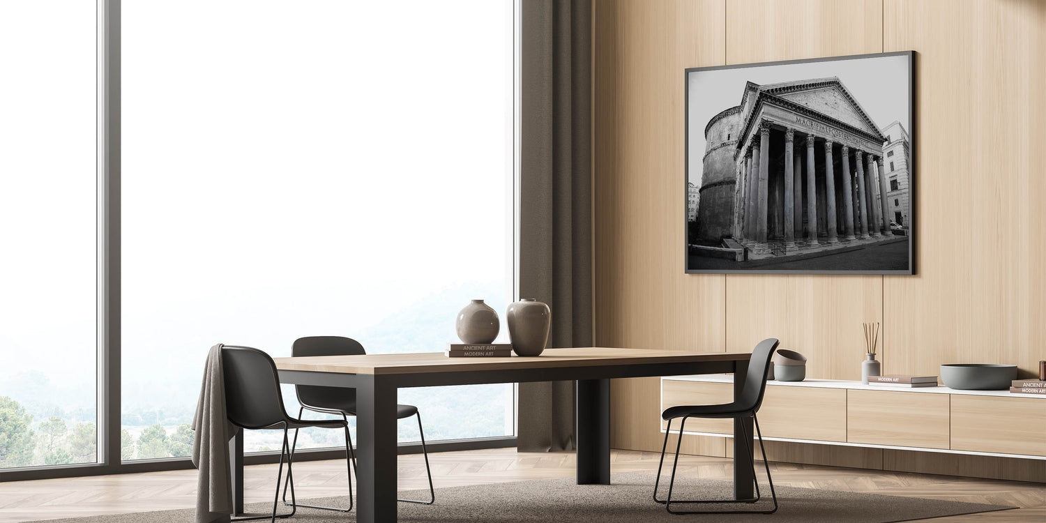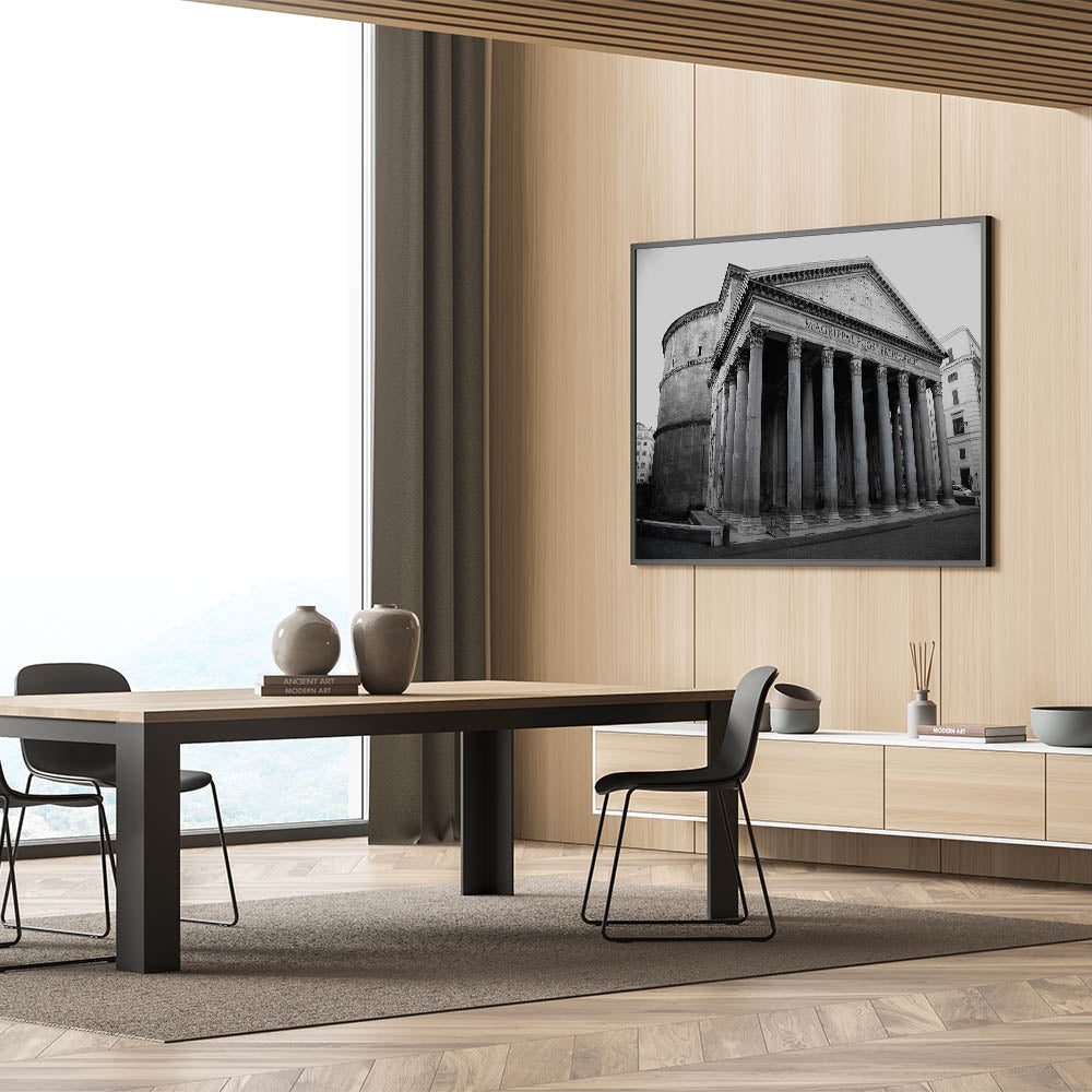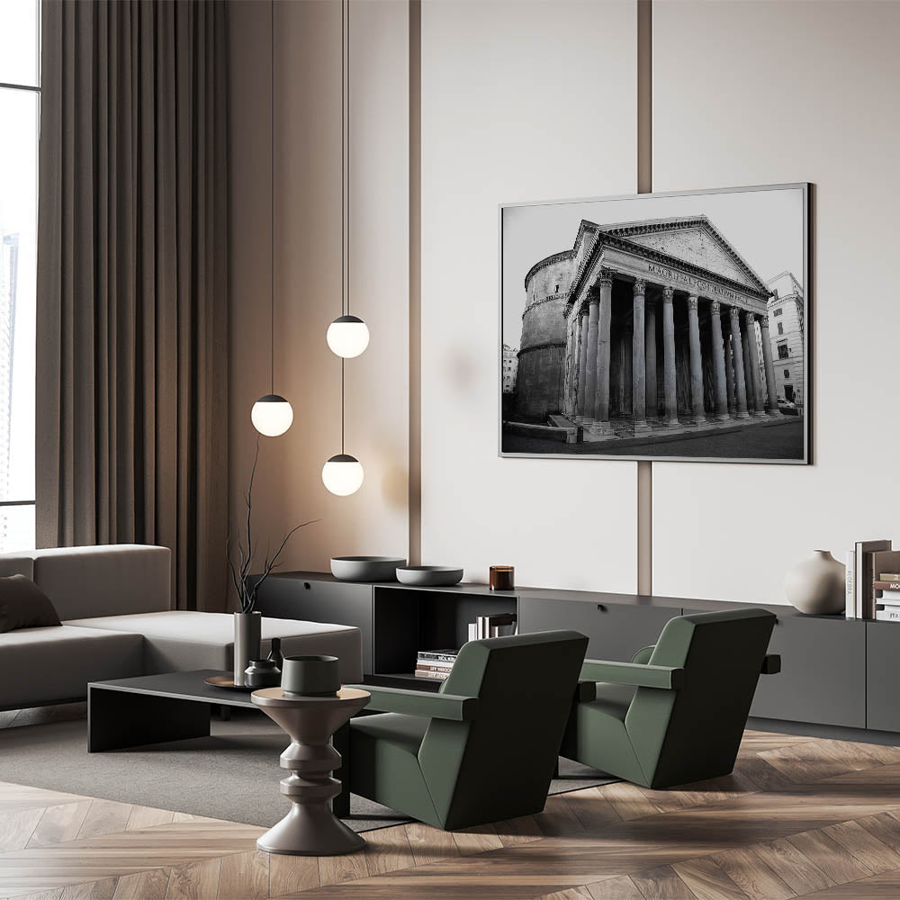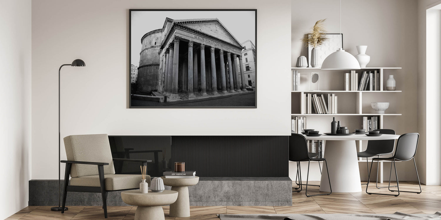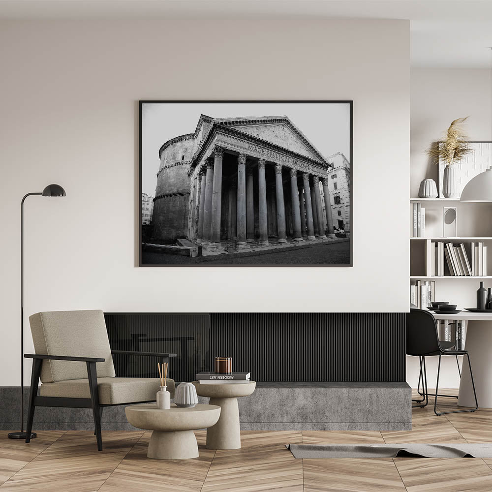 Celebrate the grandeur of ancient Rome with this striking canvas print of the Pantheon, one of the most iconic examples of Roman architecture. This detailed black-and-white photograph captures the timeless beauty of this historic landmark, emphasizing its magnificent columns and intricate stonework. A perfect piece for lovers of ancient Rome art and Italian architecture prints, this artwork will make a bold statement in any room.
